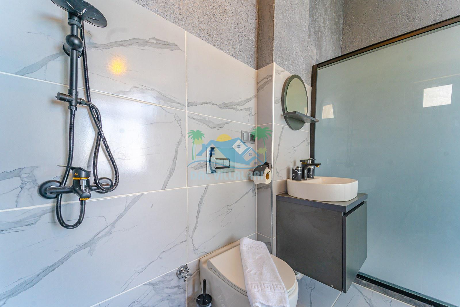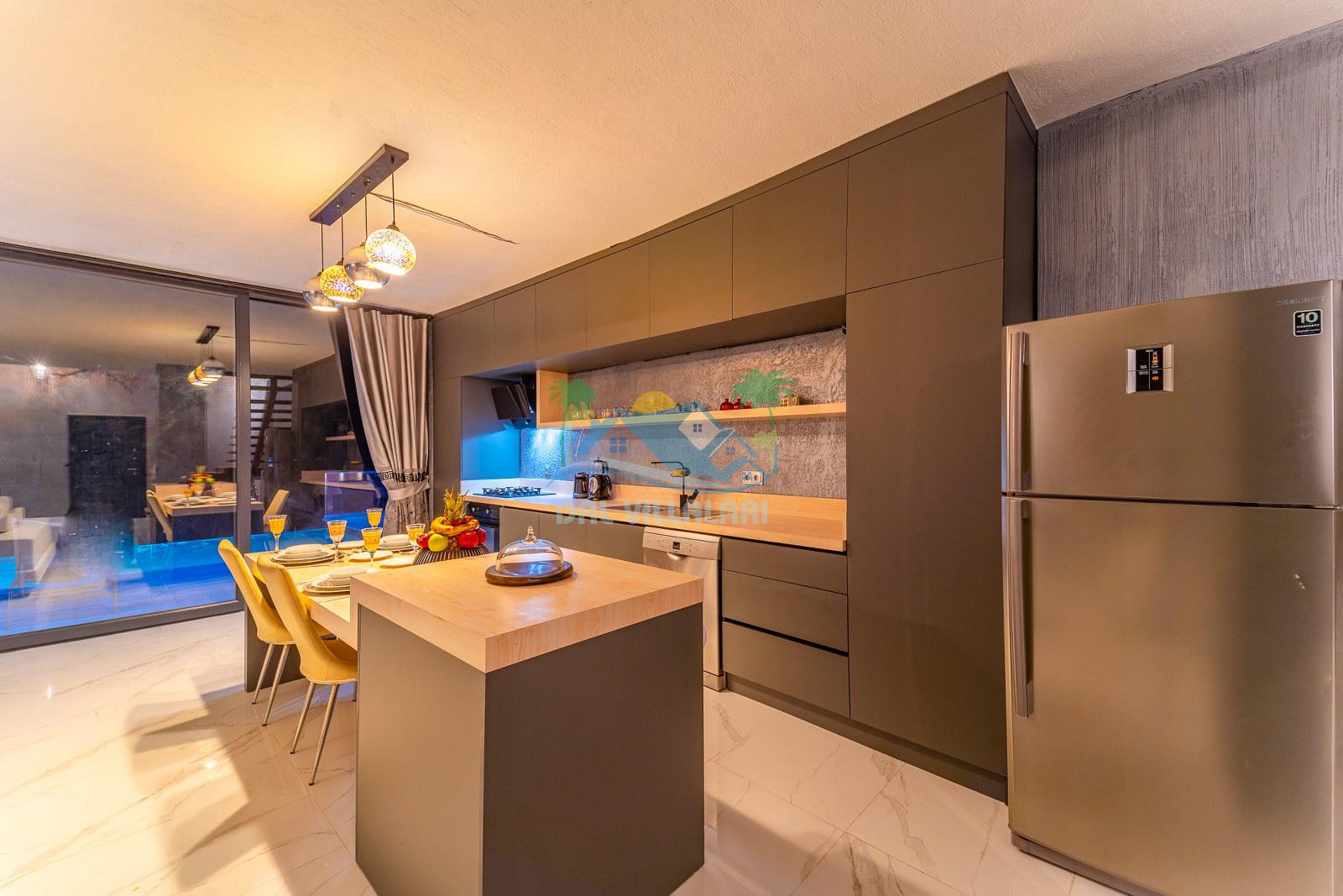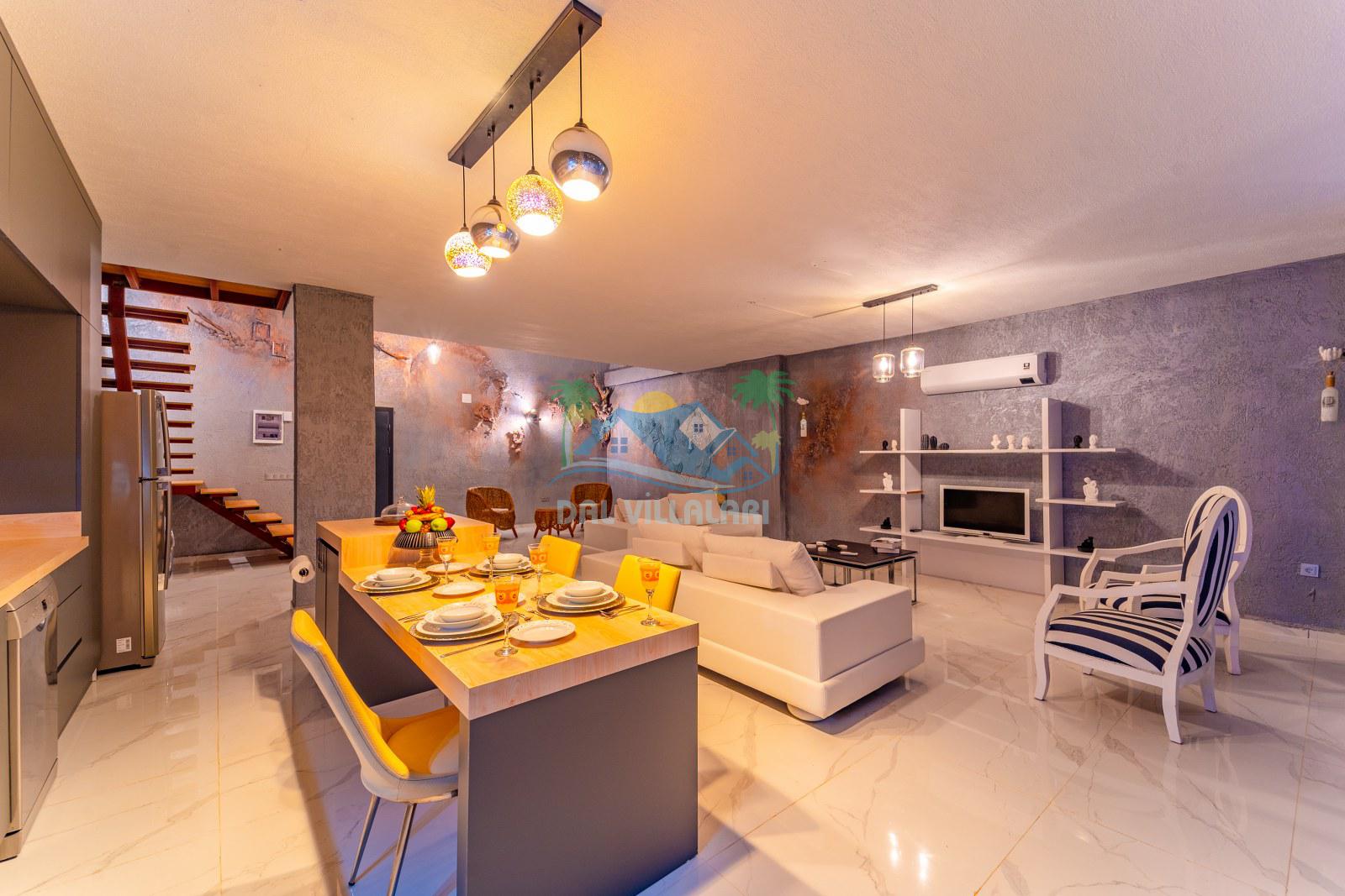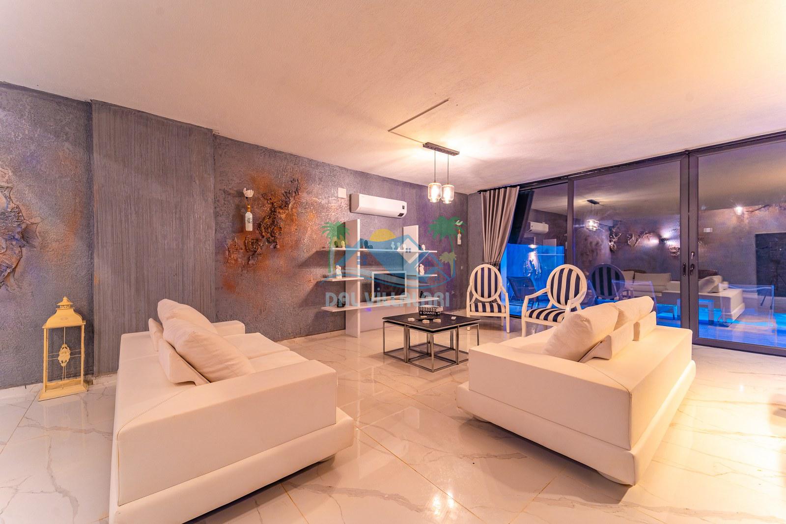 Villamızın iç mekânı modern çizgilerle dekore edilmiş olup, şıklık ve rahatlık bir arada düşünülmüştür. Geniş cam yüzeyler sayesinde ferah bir atmosfer sunan yaşam alanı, tatil süresince misafirlerimize ev konforunu hissettirmektedir. Yatak odalarında kullanılan geniş çift kişilik yataklar, özel banyolar ve estetik detaylar konaklamayı daha keyifli hale getirmektedir.