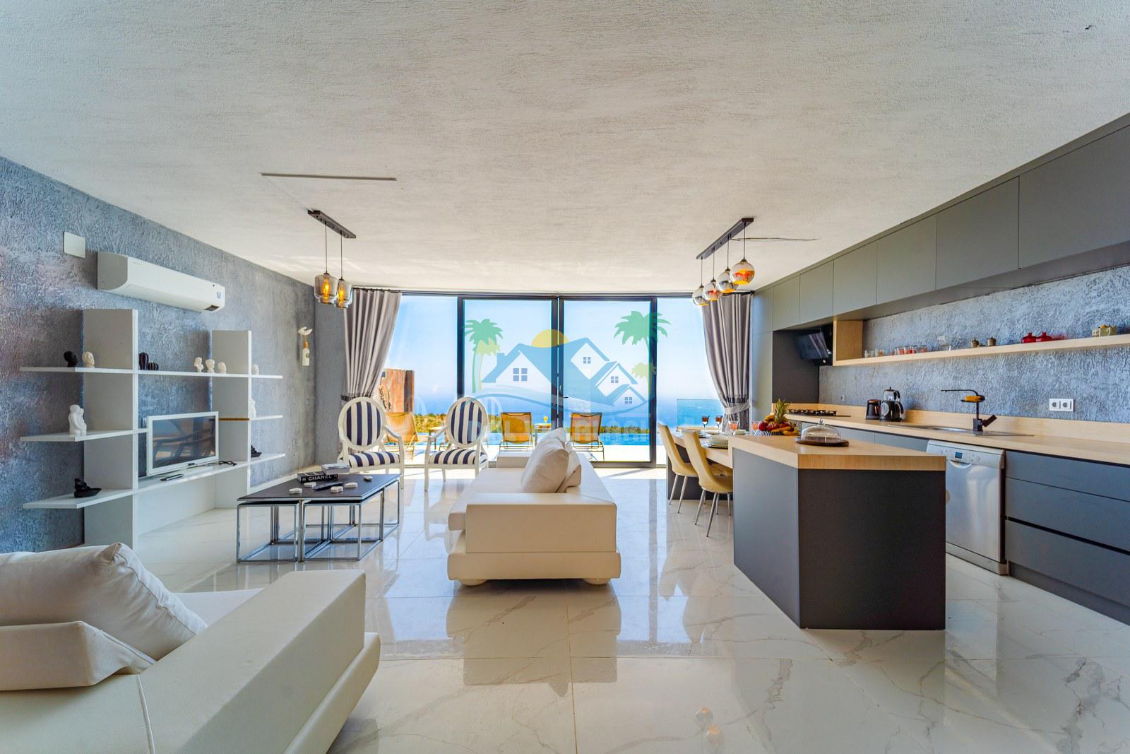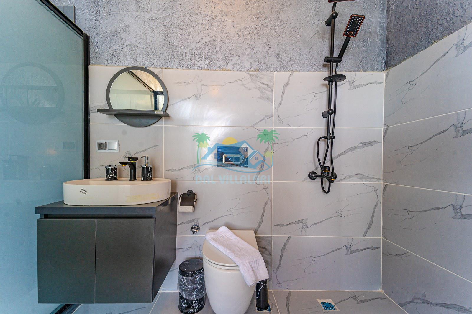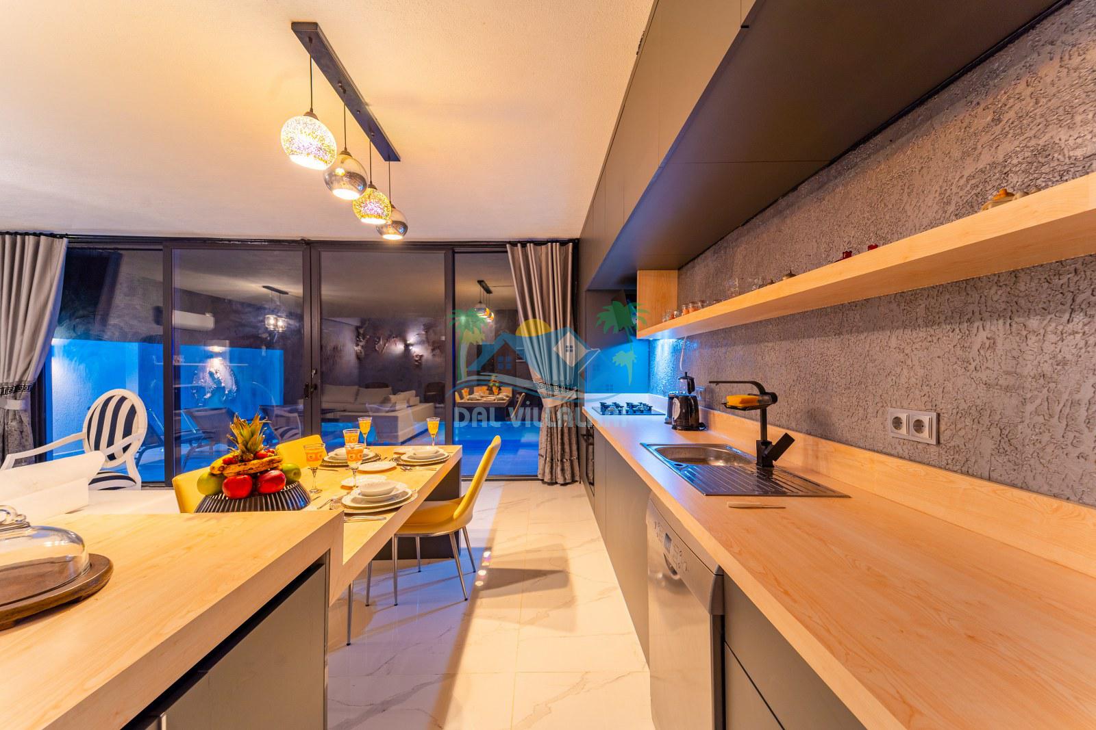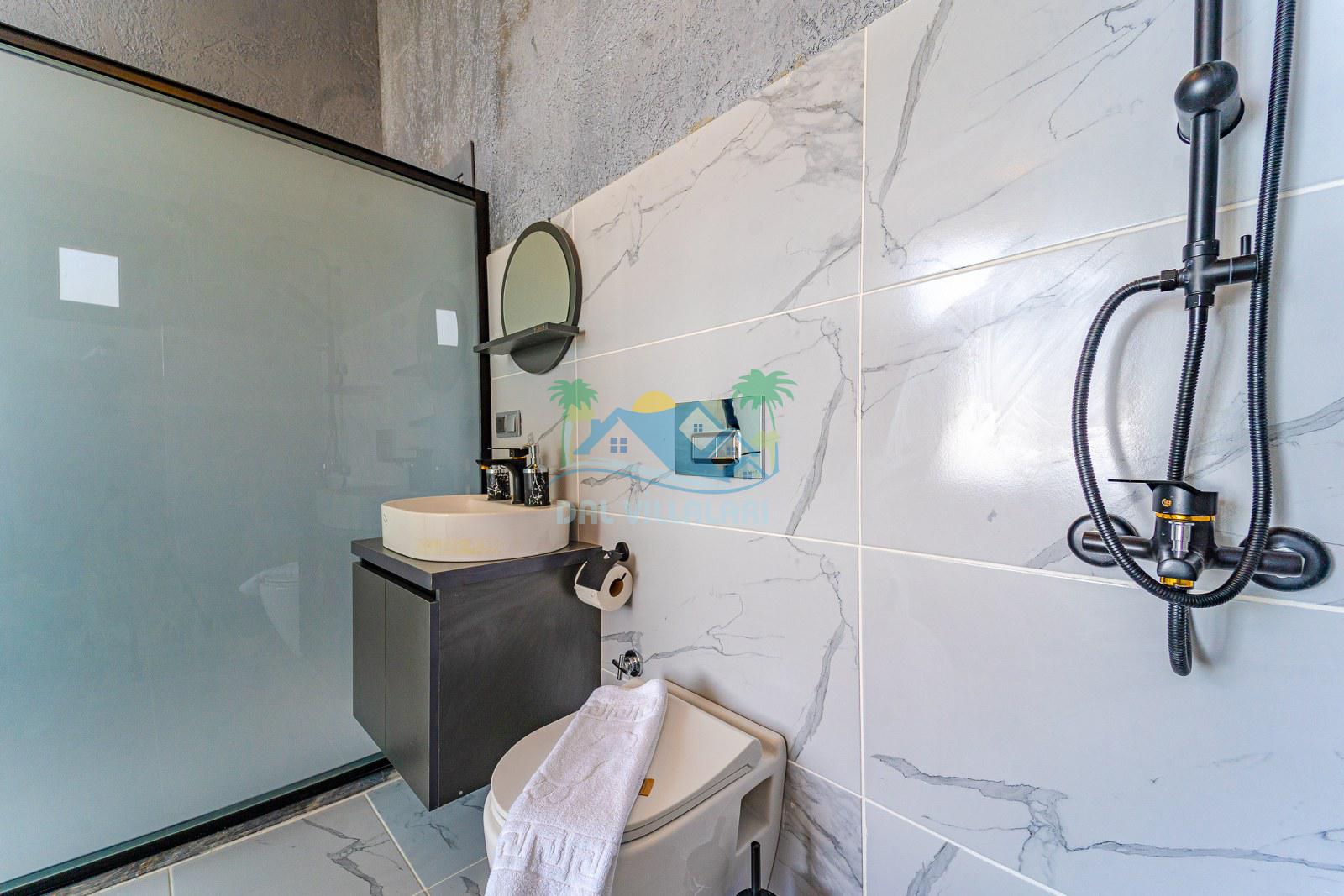 Villamızın iç mekânı modern çizgilerle dekore edilmiş olup, şıklık ve rahatlık bir arada düşünülmüştür. Geniş cam yüzeyler sayesinde ferah bir atmosfer sunan yaşam alanı, tatil süresince misafirlerimize ev konforunu hissettirmektedir. Yatak odalarında kullanılan geniş çift kişilik yataklar, özel banyolar ve estetik detaylar konaklamayı daha keyifli hale getirmektedir.