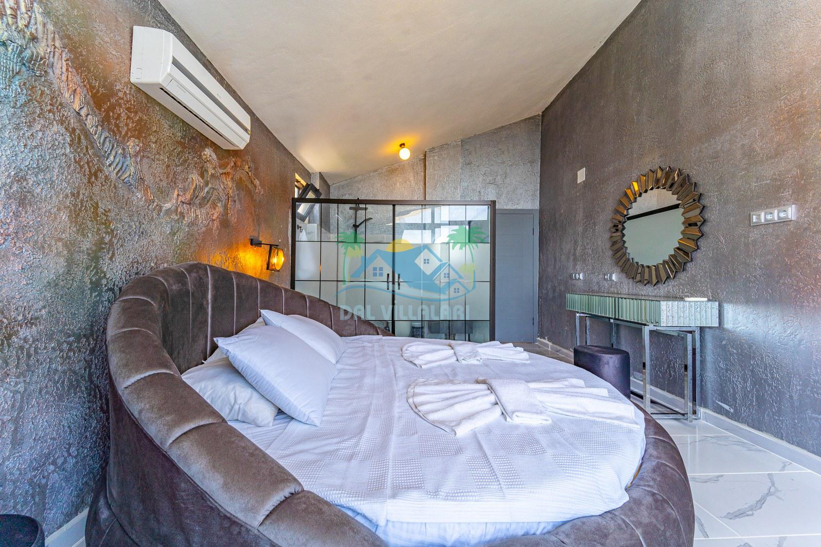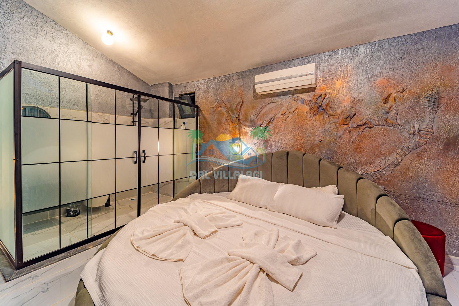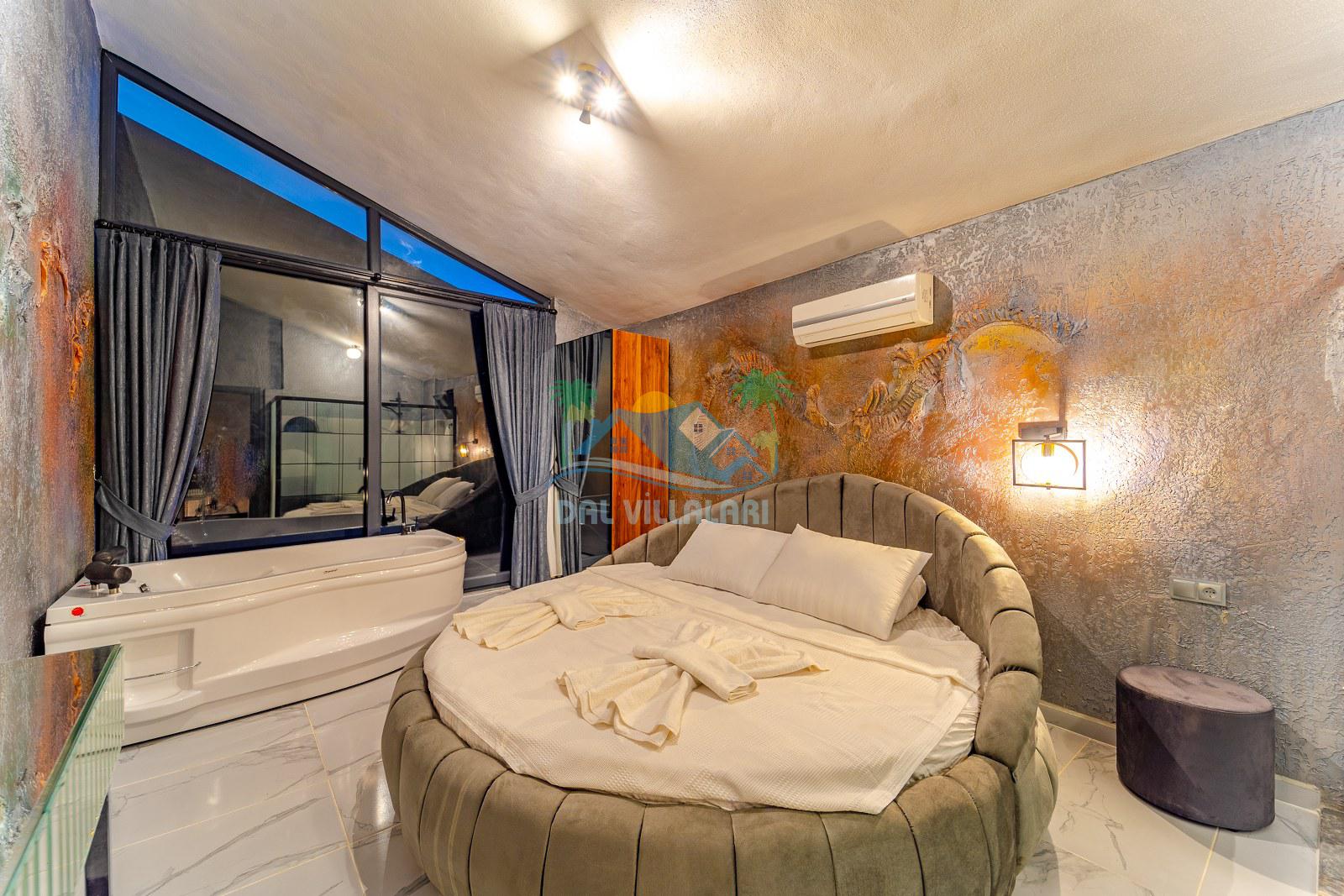 Jakuzili yatak odası ise özellikle dinlenmek ve tatilini daha ayrıcalıklı yaşamak isteyen misafirlerimiz için öne çıkan bölümlerden biridir. Gün sonunda rahatlatıcı bir atmosfer sunan bu alan, villayı daha cazip hale getiren önemli detaylardan biridir.