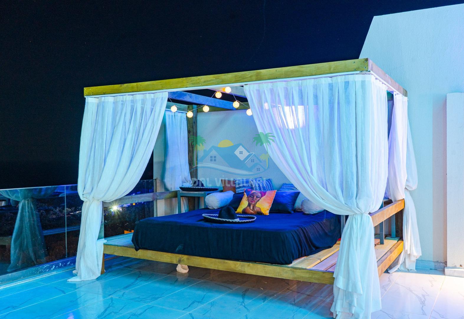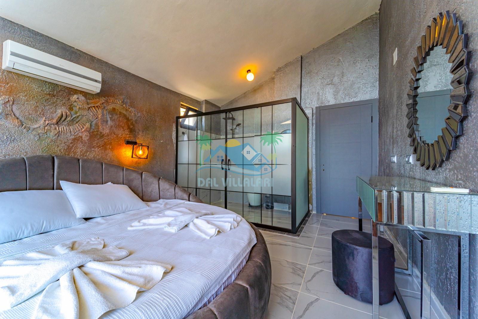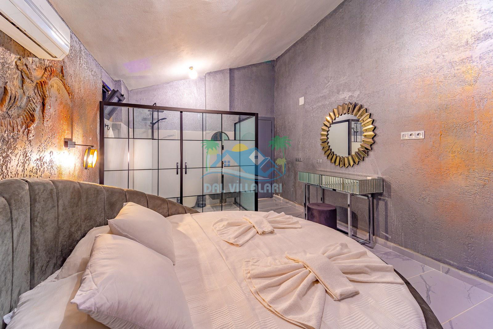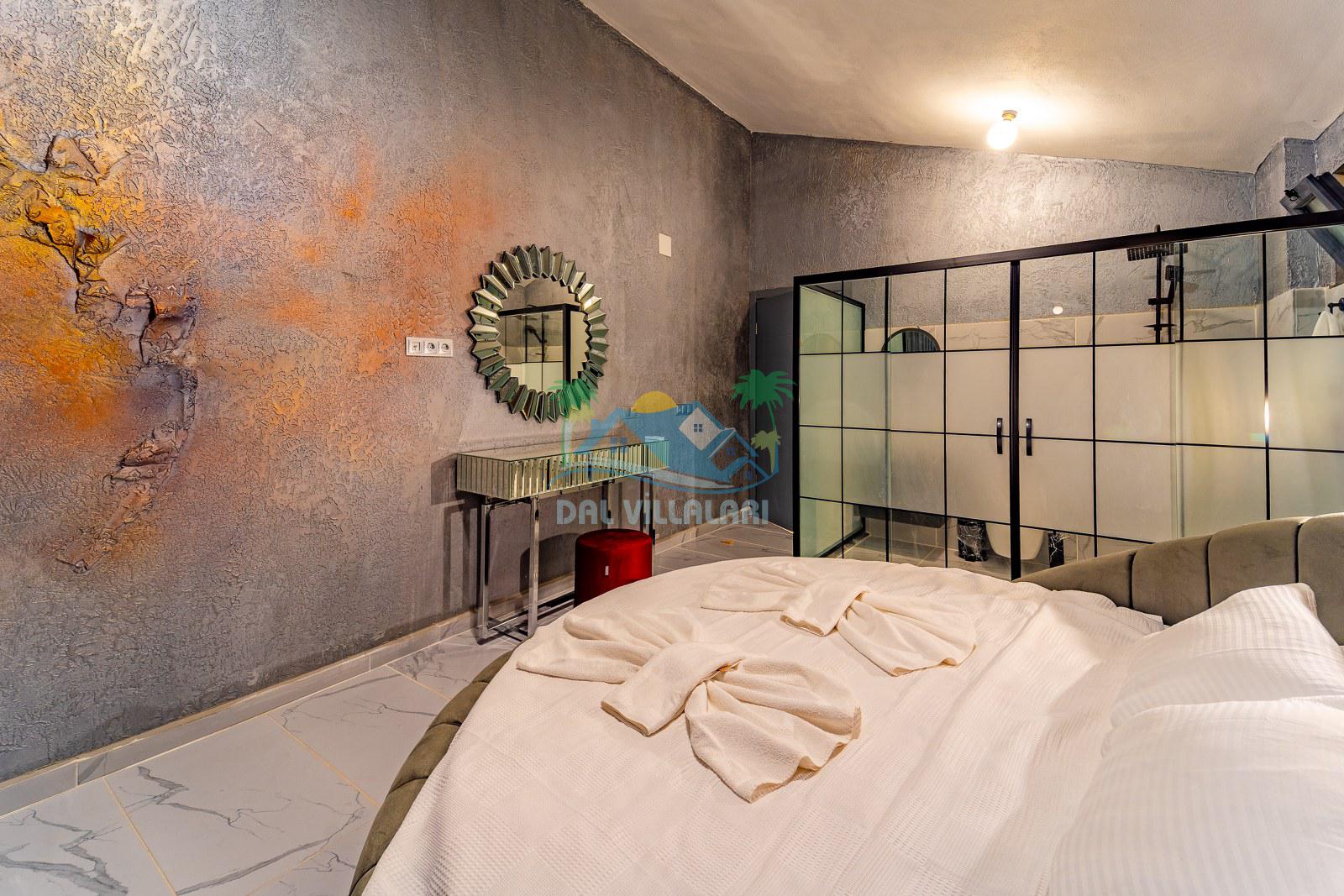 Jakuzili yatak odası ise özellikle dinlenmek ve tatilini daha ayrıcalıklı yaşamak isteyen misafirlerimiz için öne çıkan bölümlerden biridir. Gün sonunda rahatlatıcı bir atmosfer sunan bu alan, villayı daha cazip hale getiren önemli detaylardan biridir.