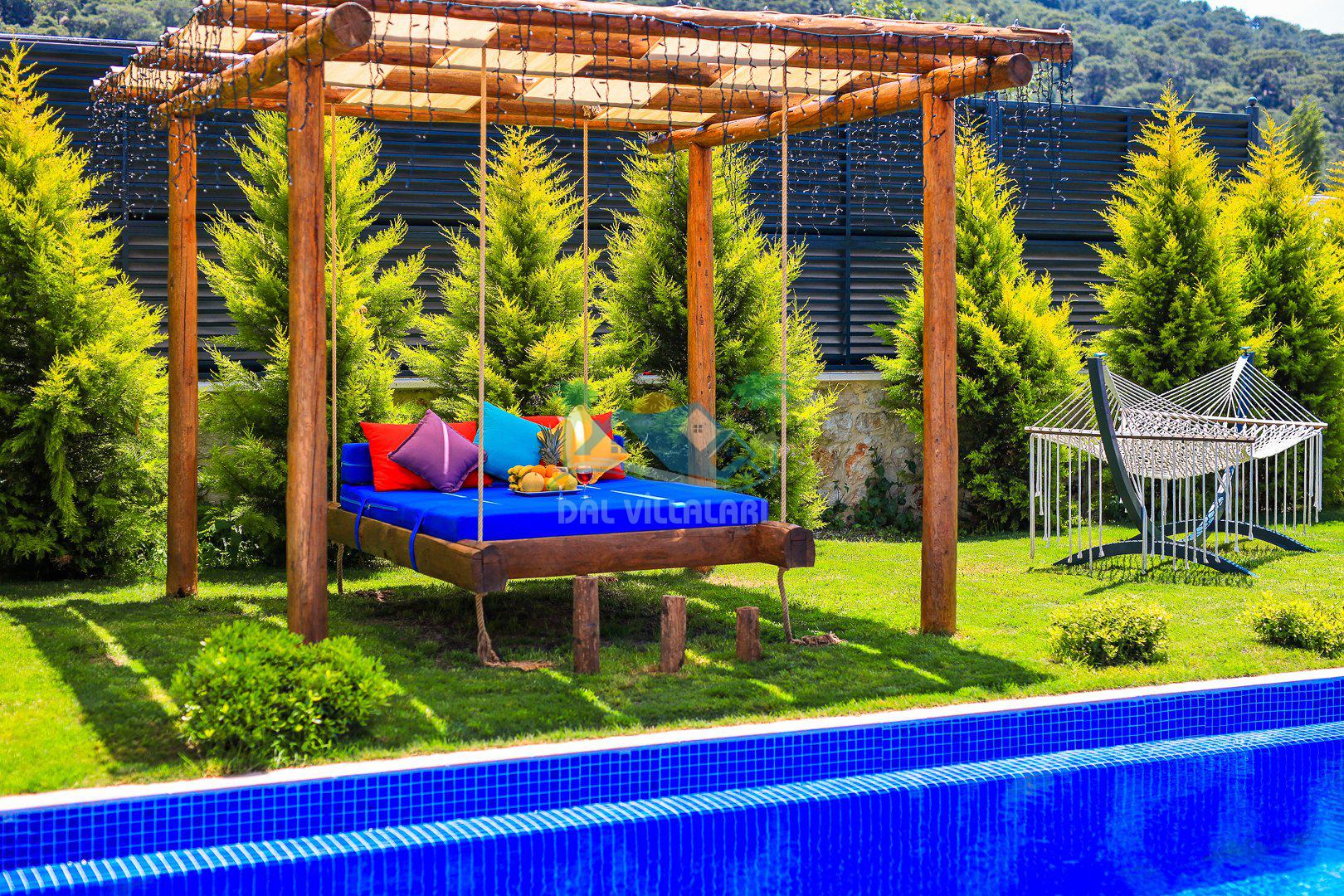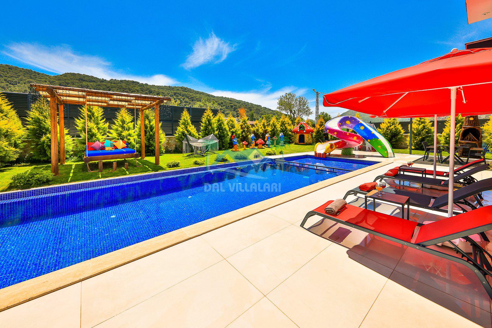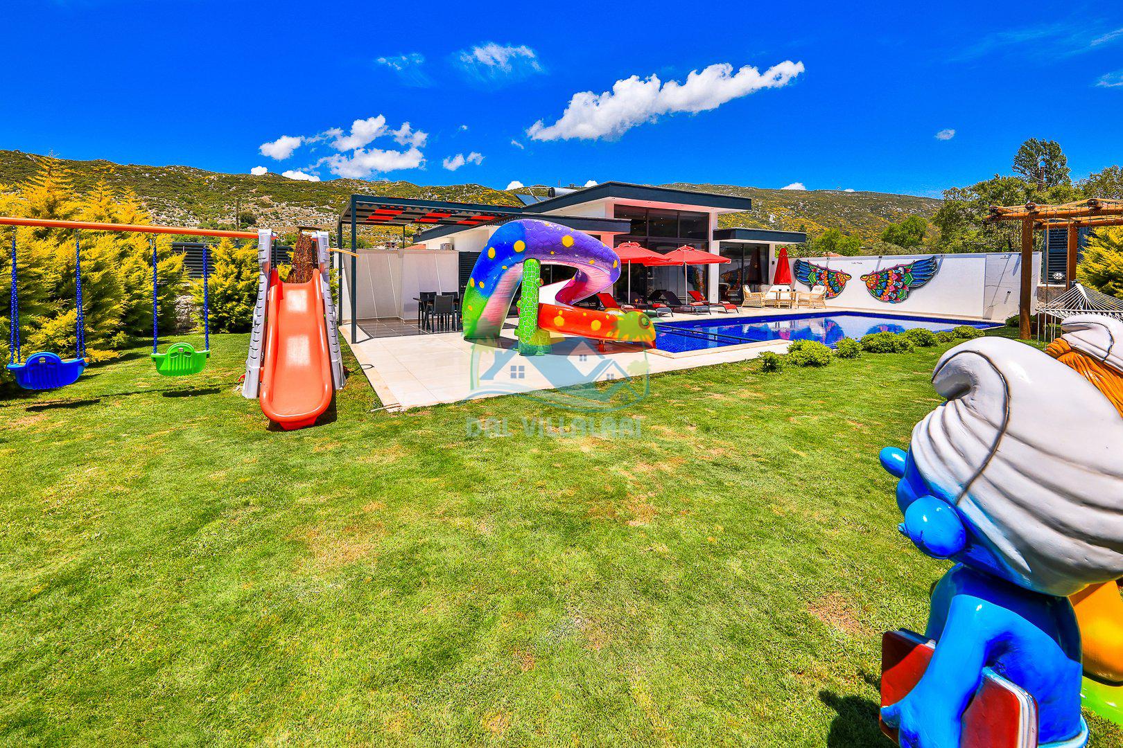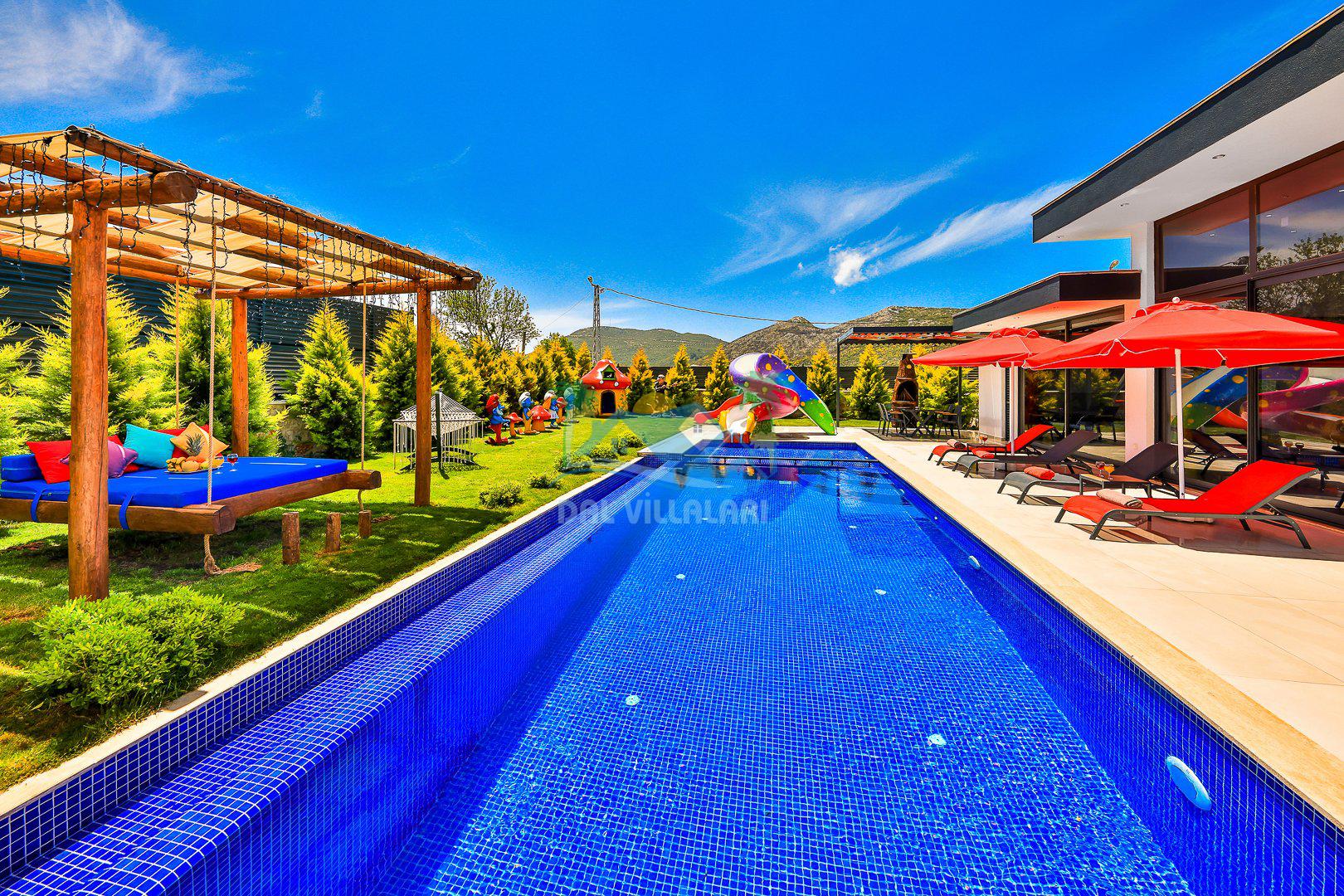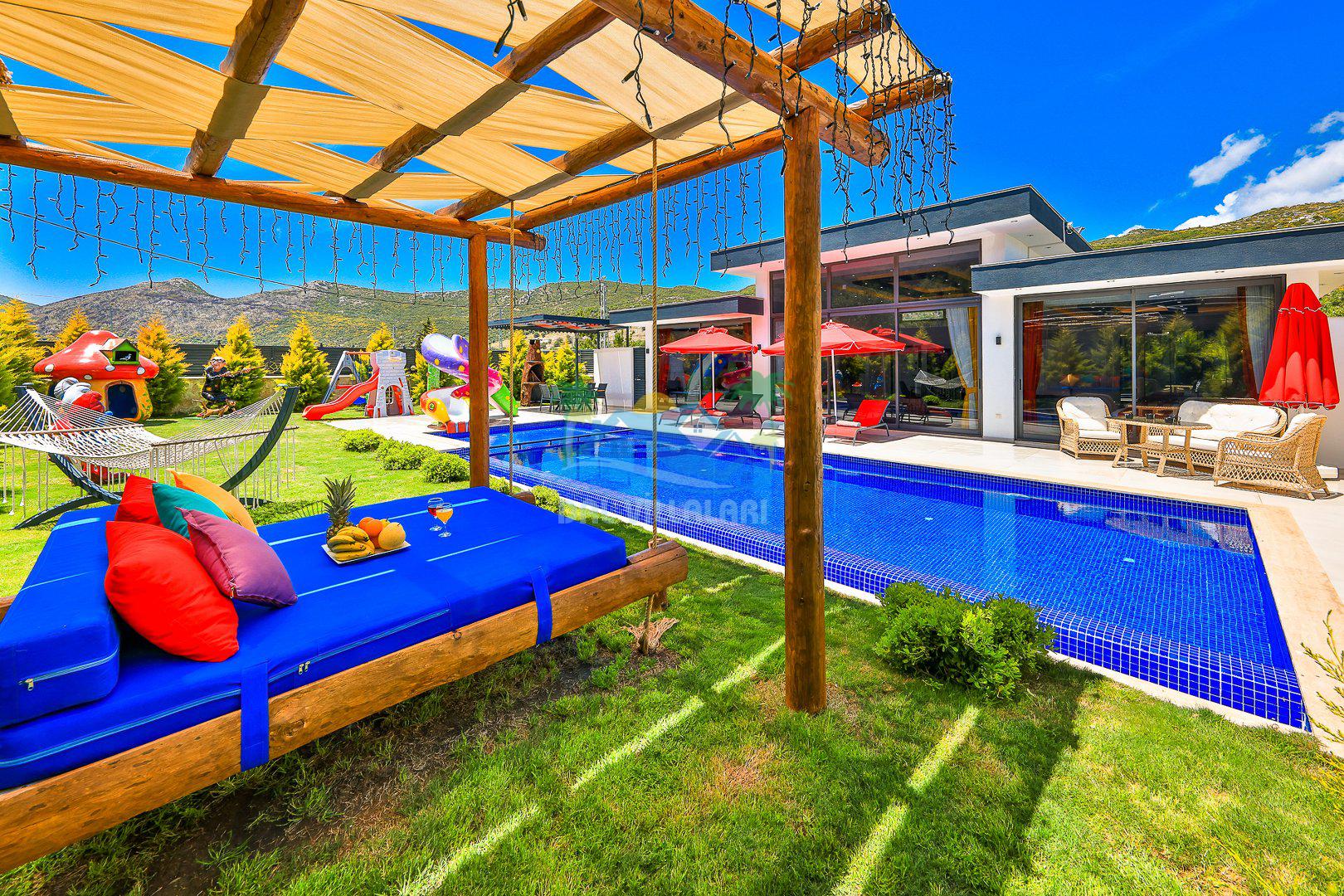 Muhafazakar mimarisi, tamamen korunaklı özel havuzu 🏊♂️ ve doğa manzaralı keyifli bahçesiyle, gözlerden uzak bir tatil arayanlara ilaç gibi gelecek. Villanın dikkat çeken detayları arasında jakuzi, çocuk parkı 🎠, hamak, salıncak ve şık oturma alanları bulunuyor.
