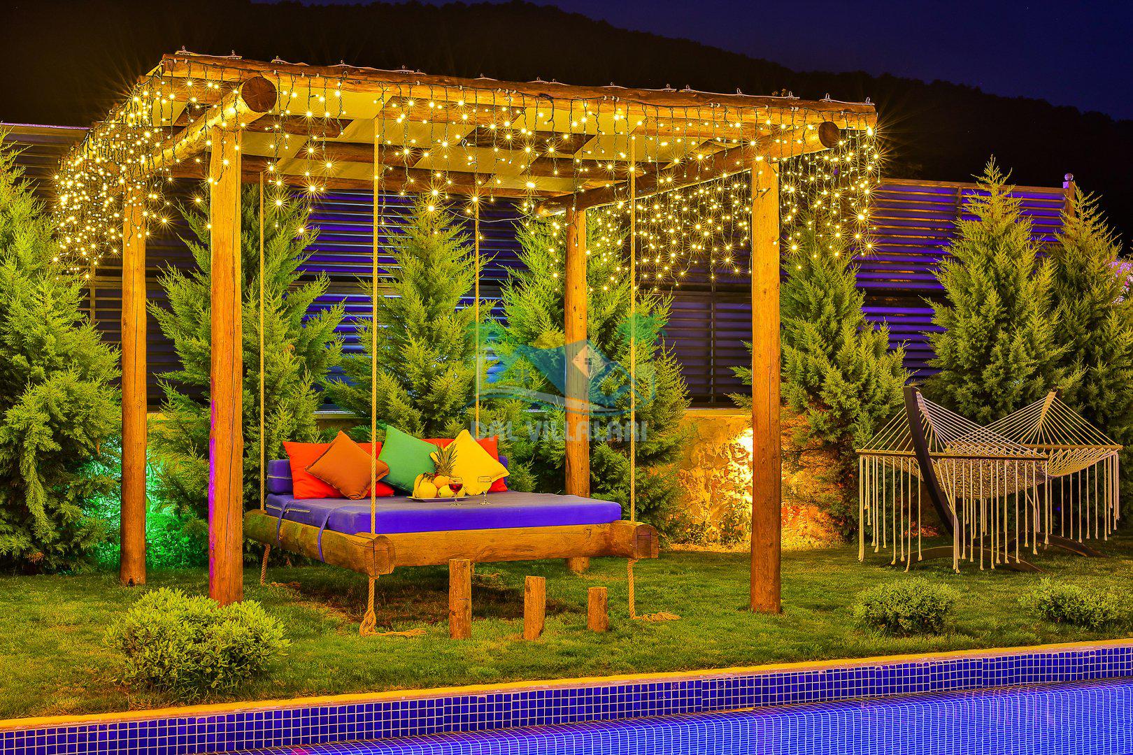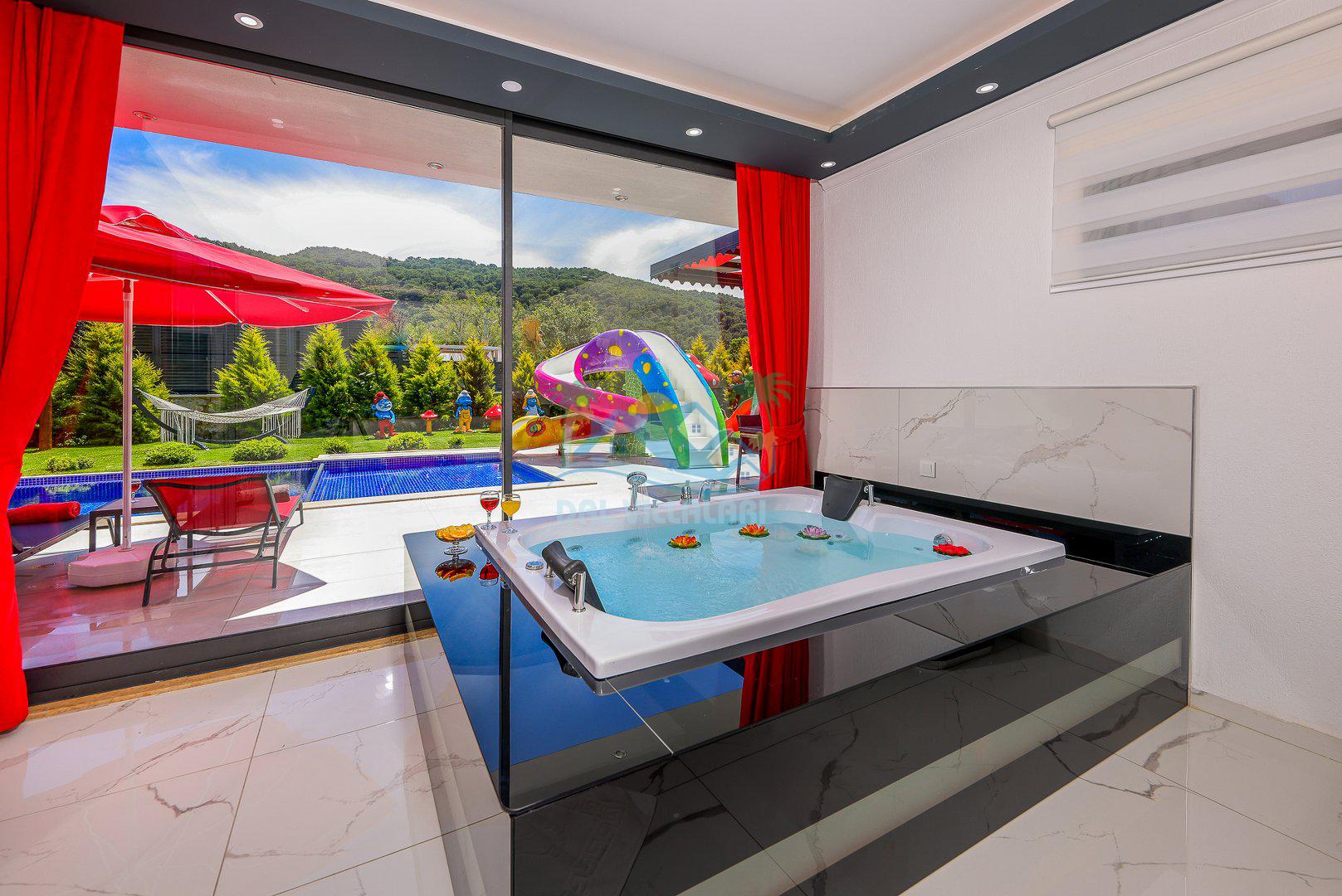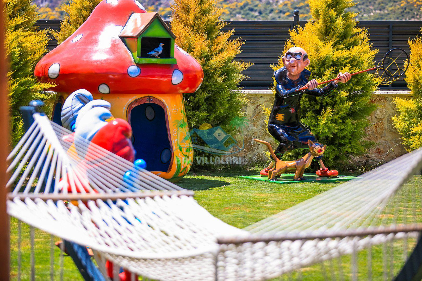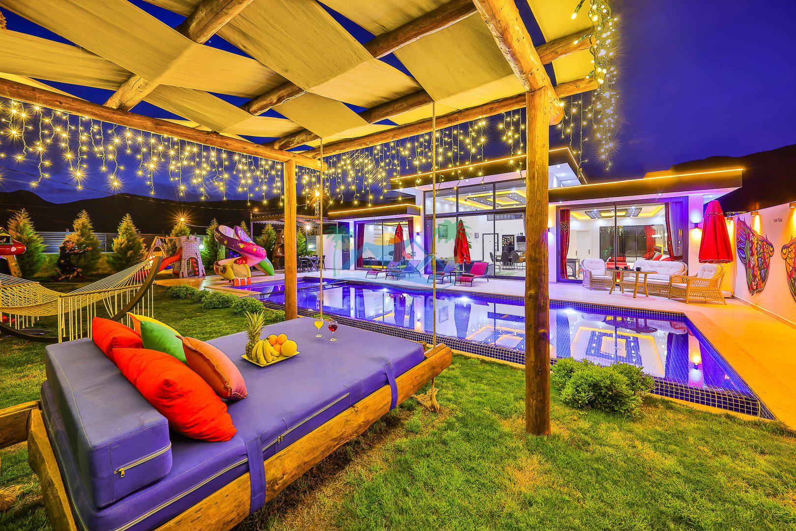 Muhafazakar mimarisi, tamamen korunaklı özel havuzu 🏊♂️ ve doğa manzaralı keyifli bahçesiyle, gözlerden uzak bir tatil arayanlara ilaç gibi gelecek. Villanın dikkat çeken detayları arasında jakuzi, çocuk parkı 🎠, hamak, salıncak ve şık oturma alanları bulunuyor.