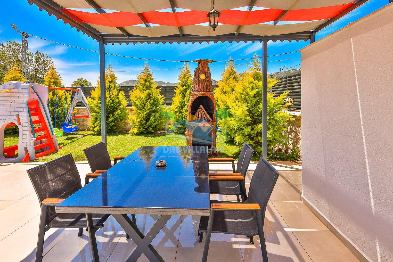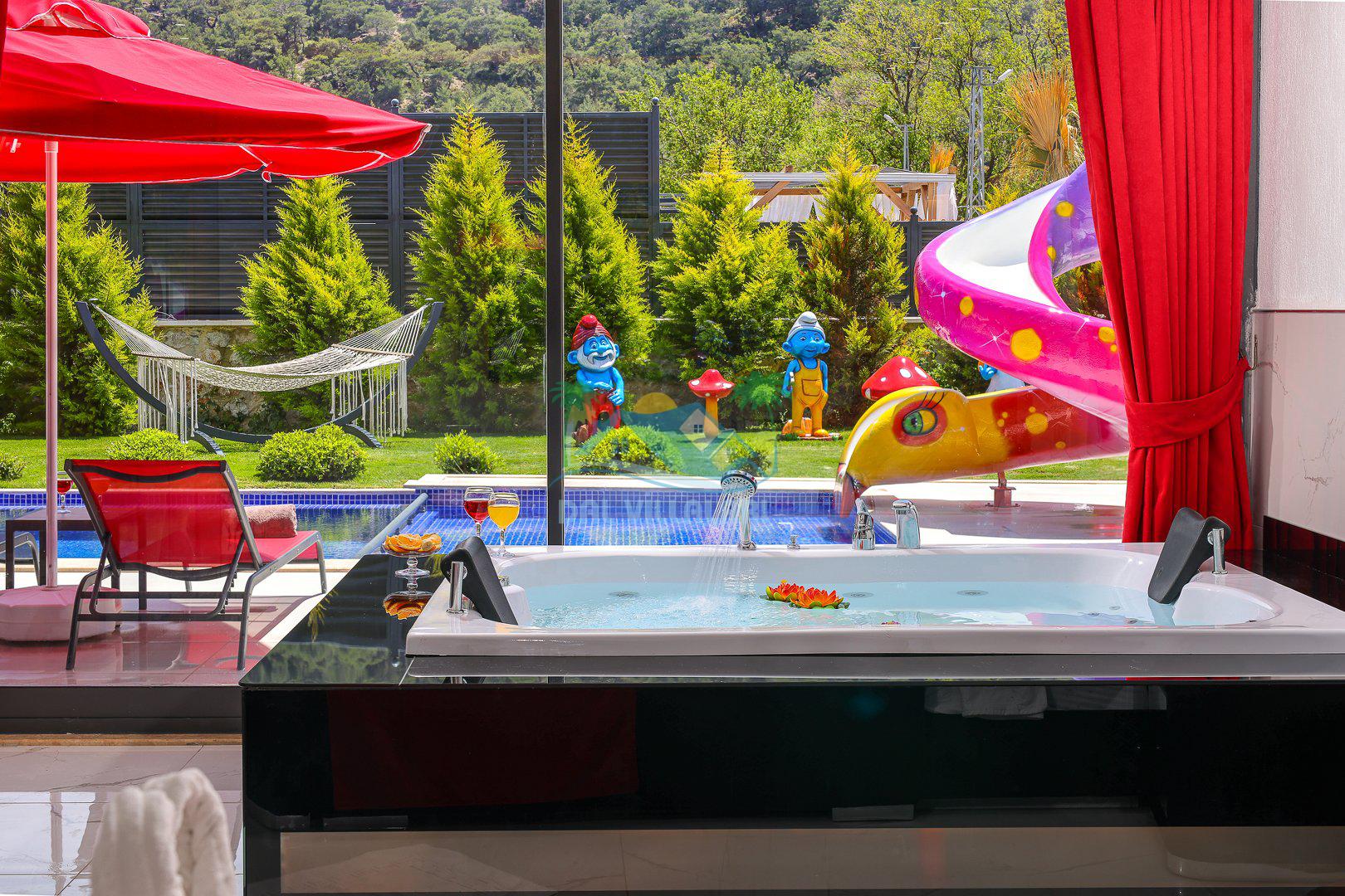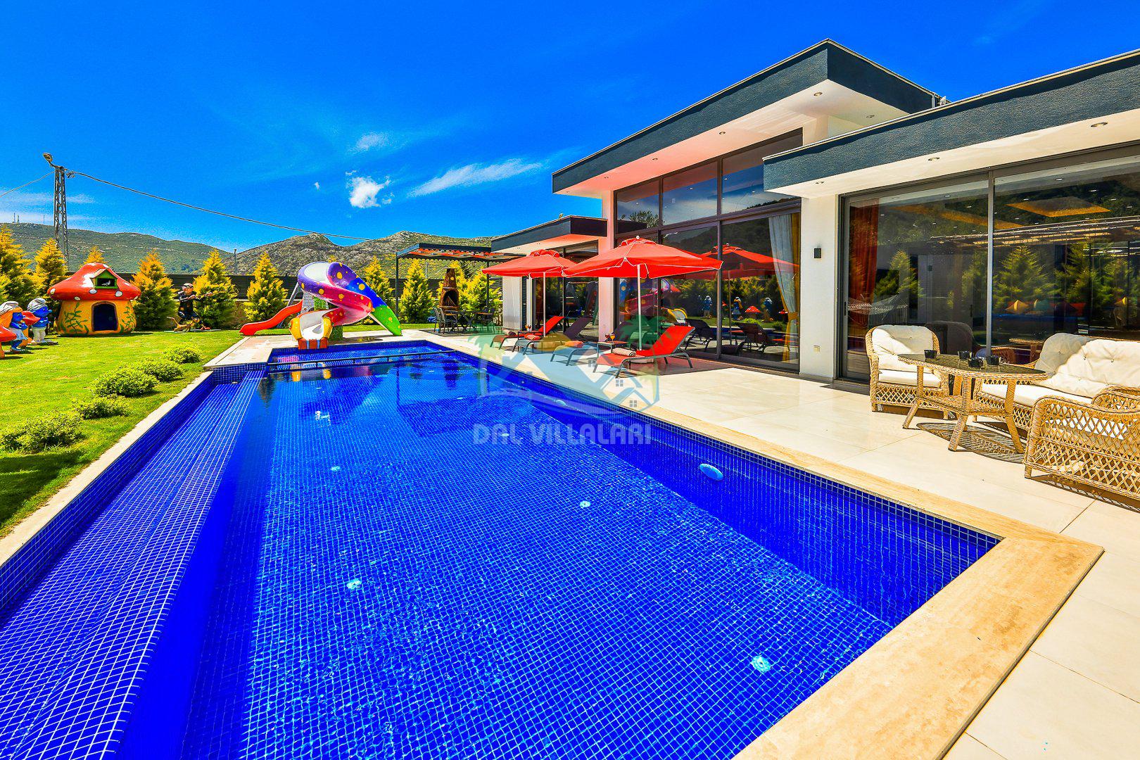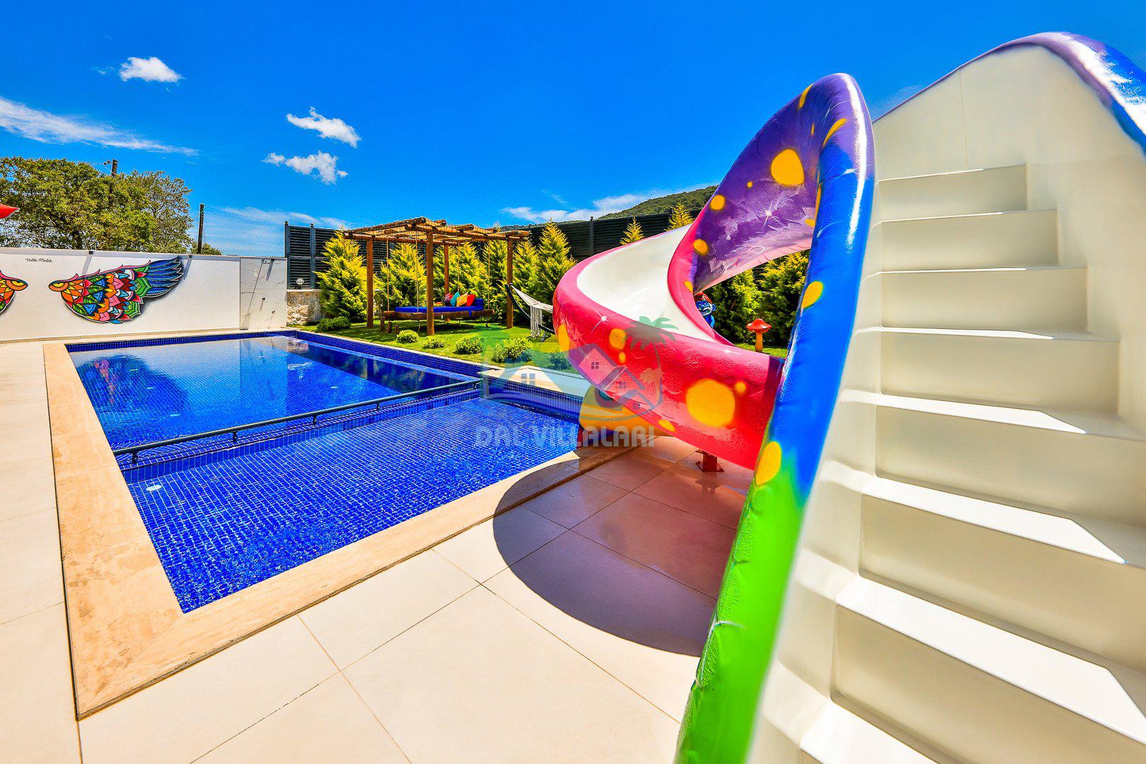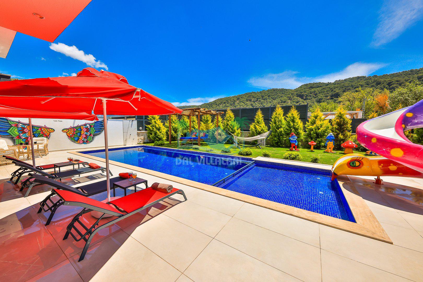 Muhafazakar mimarisi, tamamen korunaklı özel havuzu 🏊♂️ ve doğa manzaralı keyifli bahçesiyle, gözlerden uzak bir tatil arayanlara ilaç gibi gelecek. Villanın dikkat çeken detayları arasında jakuzi, çocuk parkı 🎠, hamak, salıncak ve şık oturma alanları bulunuyor.