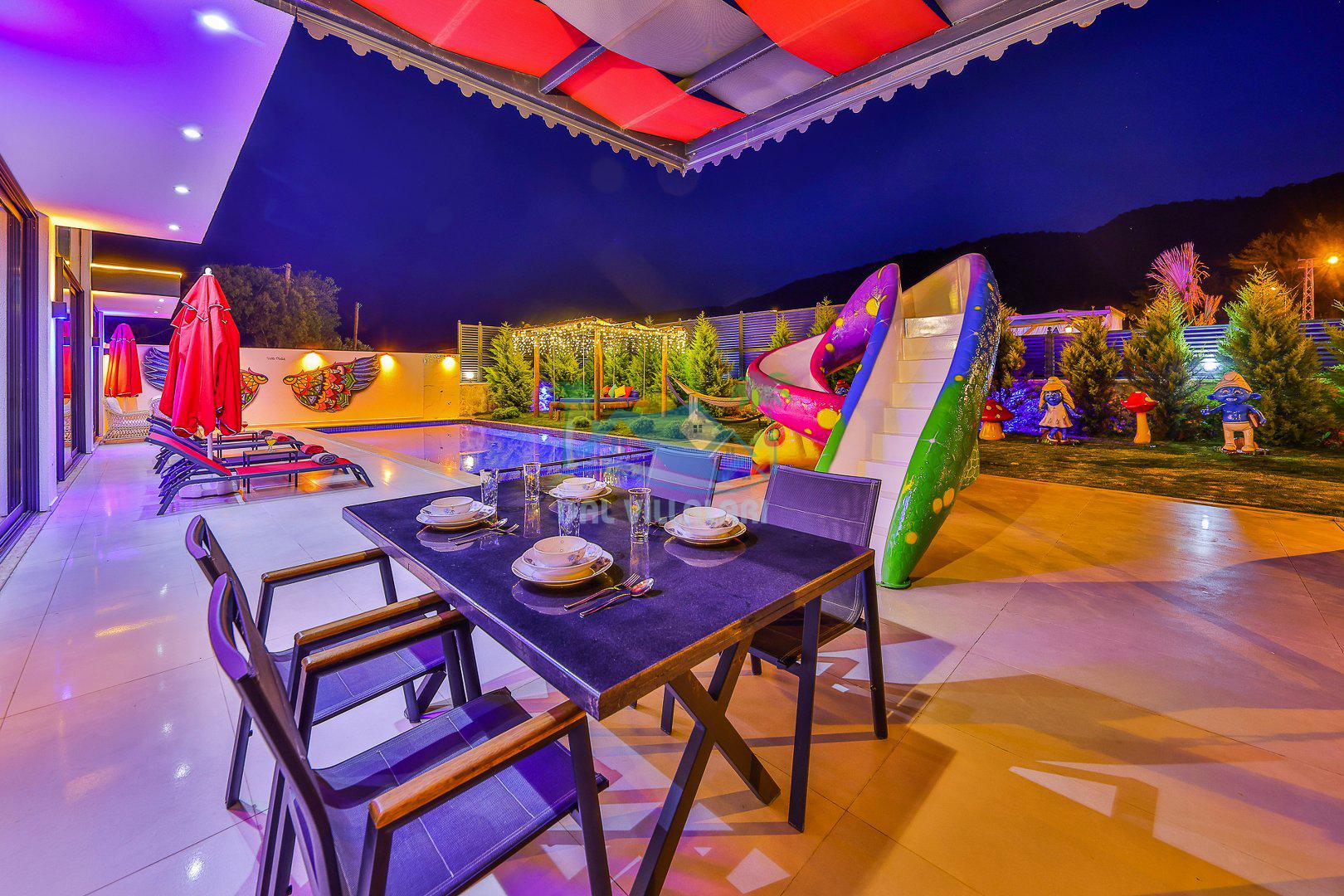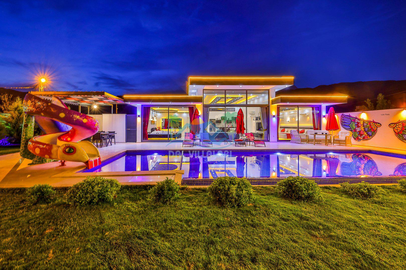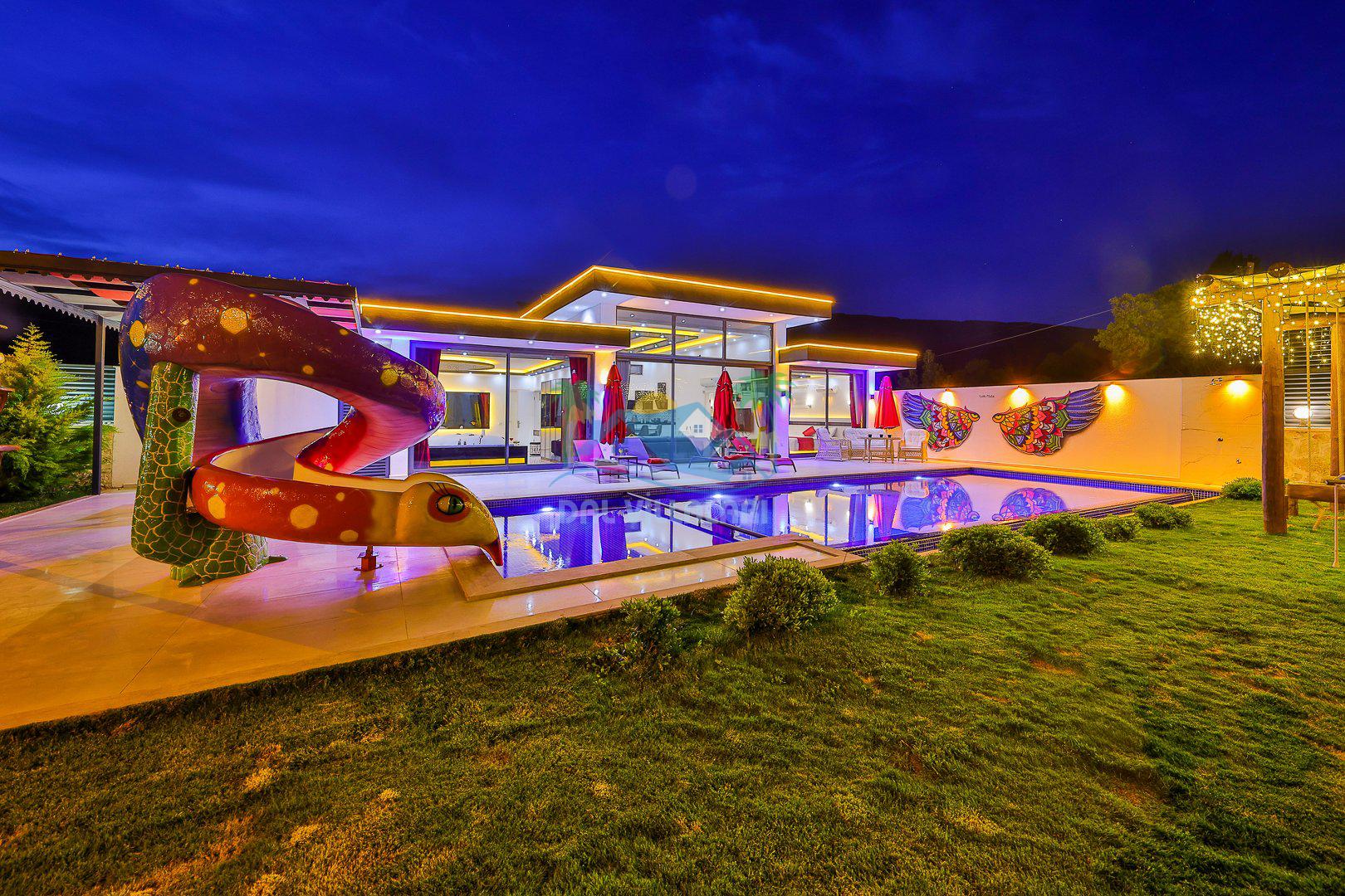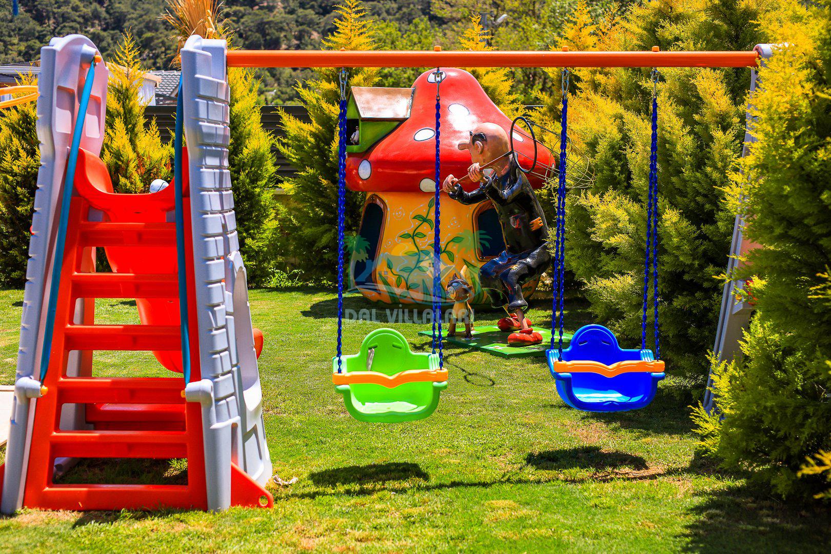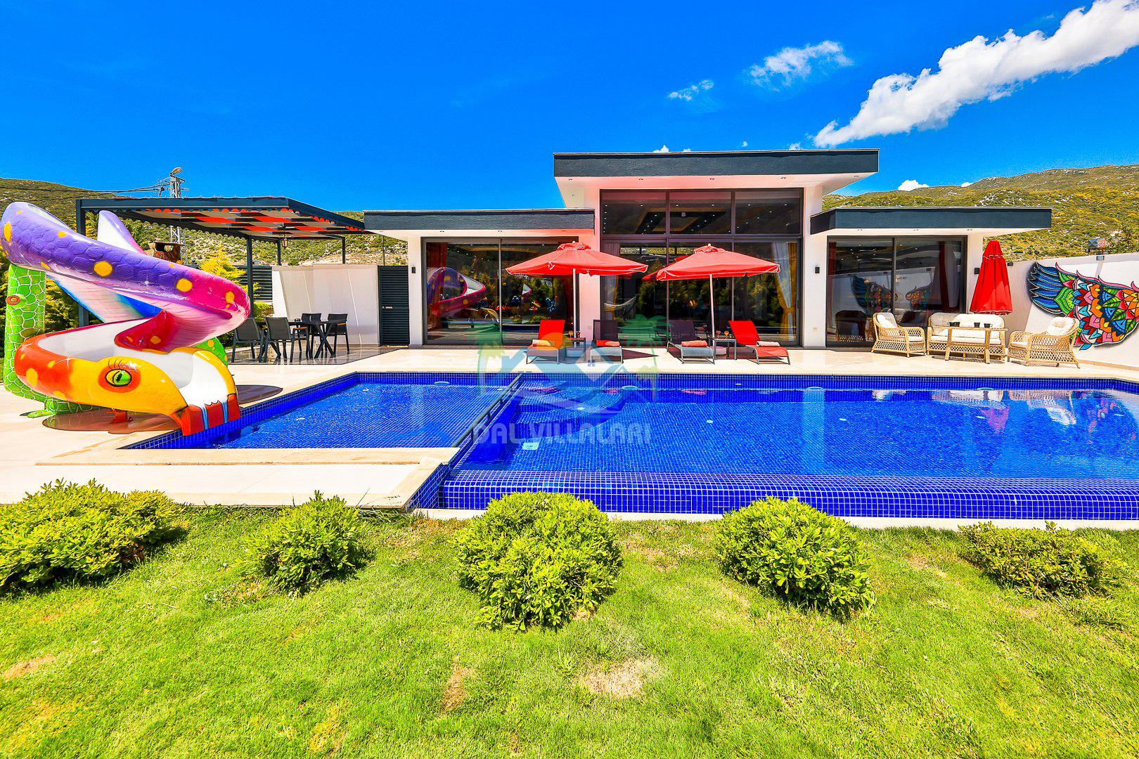 Muhafazakar mimarisi, tamamen korunaklı özel havuzu 🏊♂️ ve doğa manzaralı keyifli bahçesiyle, gözlerden uzak bir tatil arayanlara ilaç gibi gelecek. Villanın dikkat çeken detayları arasında jakuzi, çocuk parkı 🎠, hamak, salıncak ve şık oturma alanları bulunuyor.