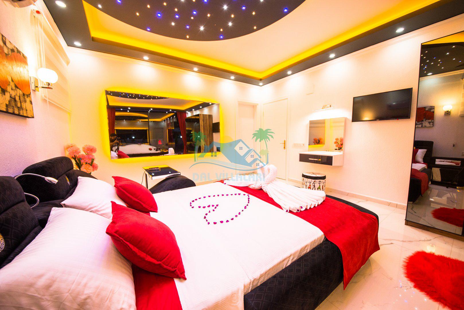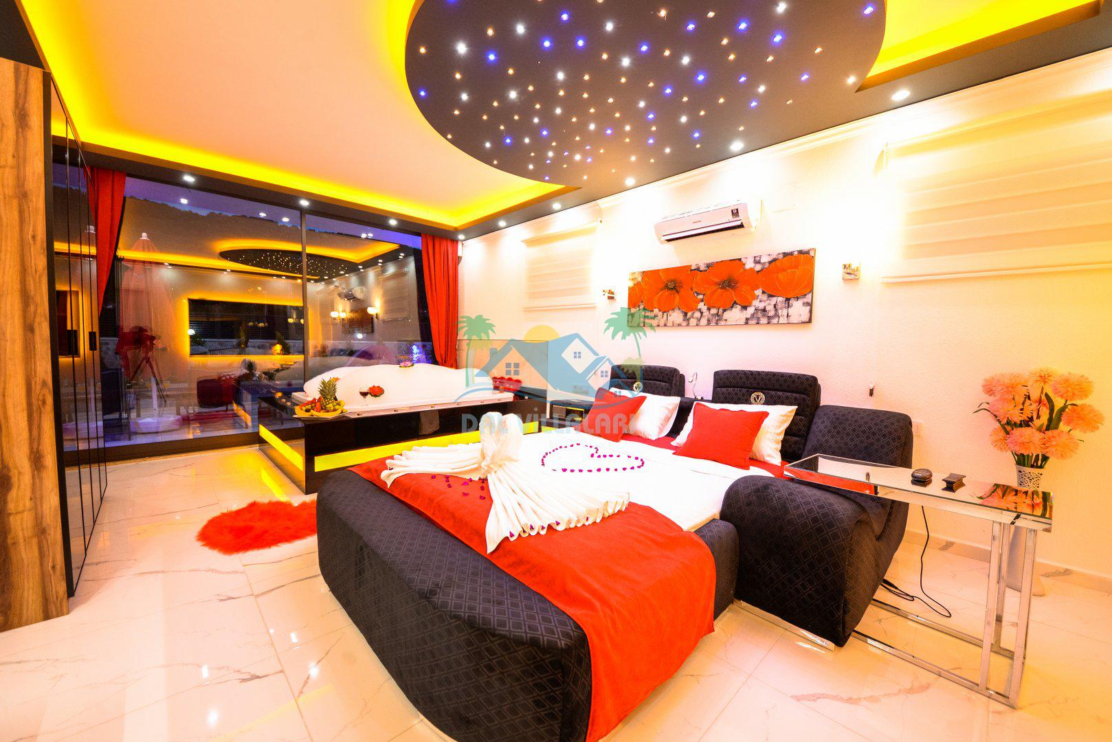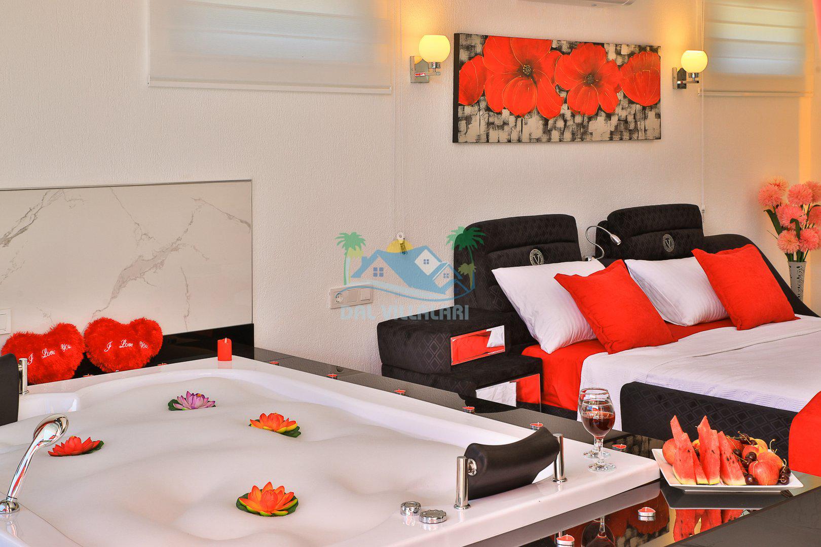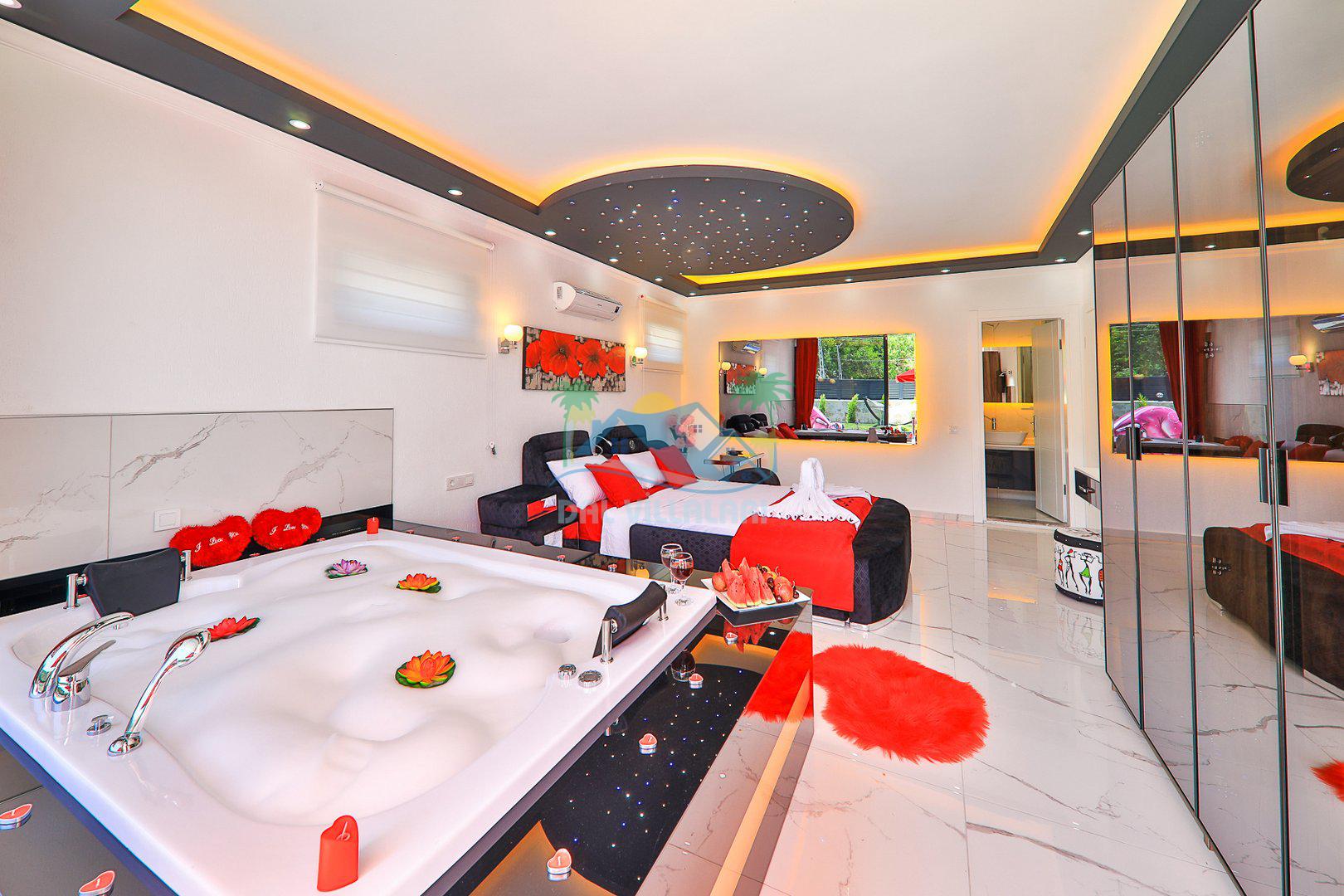 Yatak Odası 1: Çift kişilik yatak, klima, jakuzi, ebeveyn banyosu