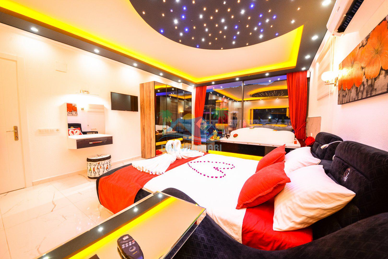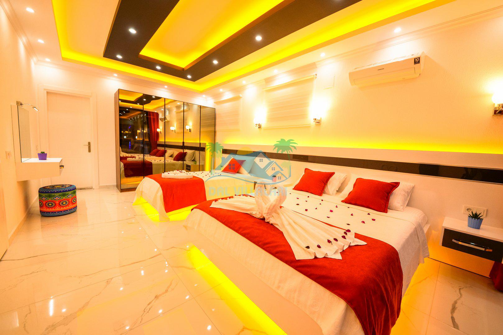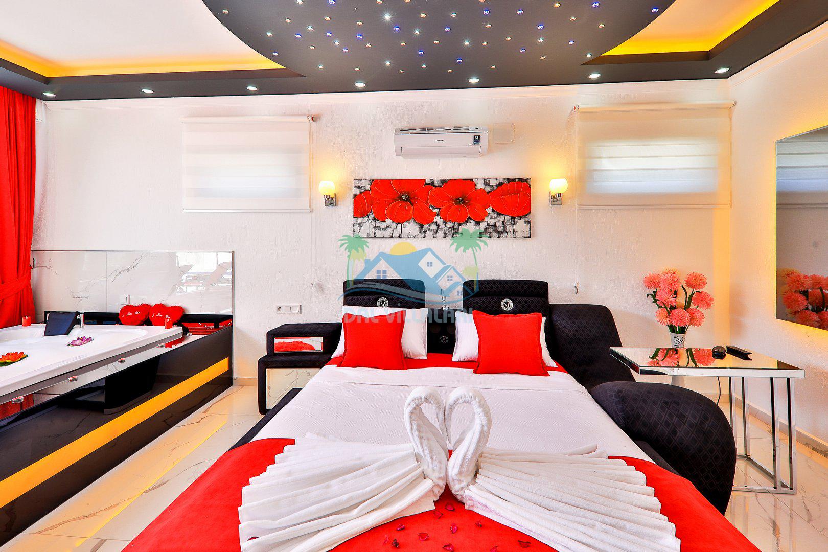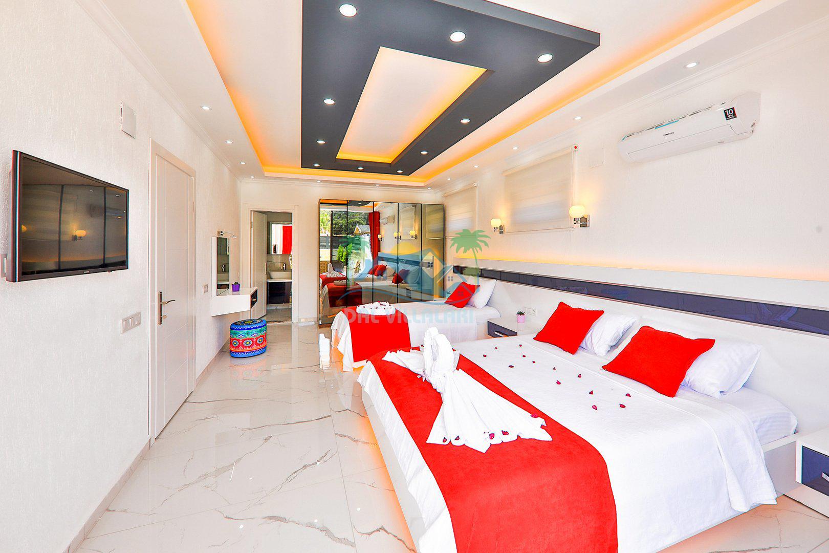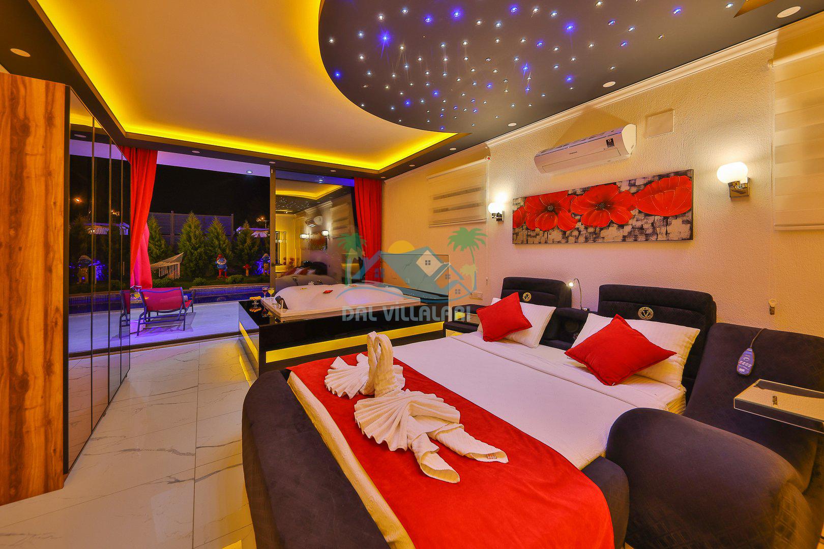 Yatak Odası 1: Çift kişilik yatak, klima, jakuzi, ebeveyn banyosu