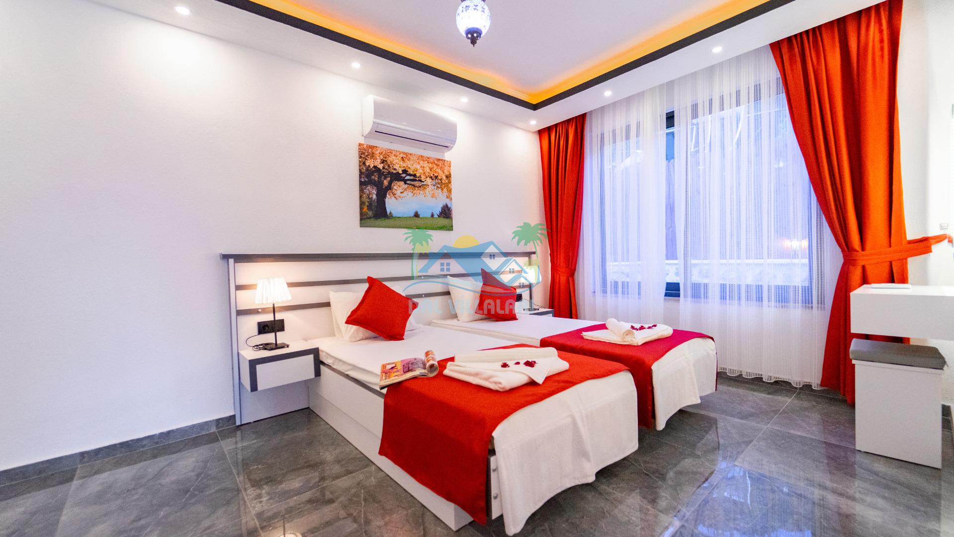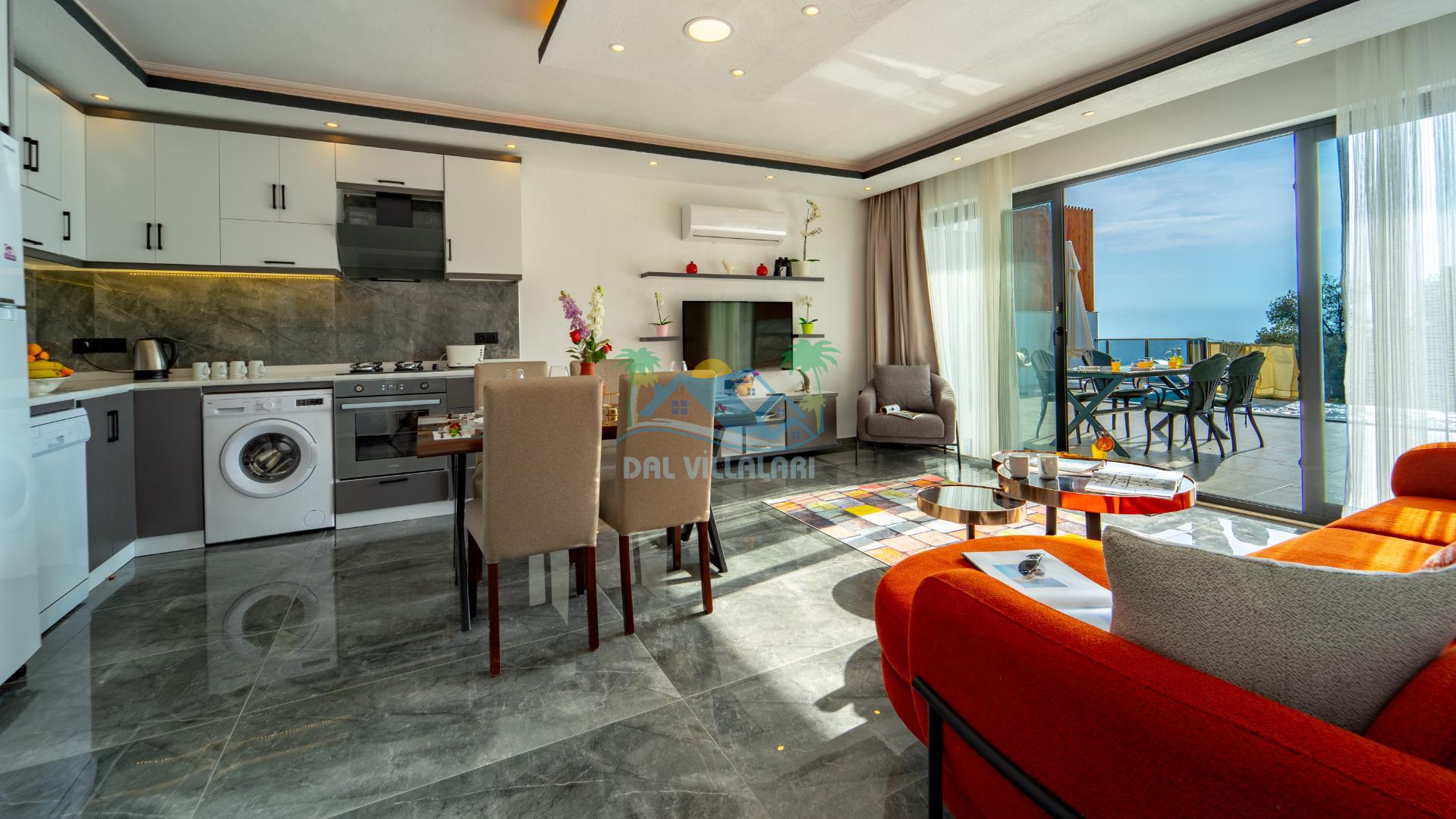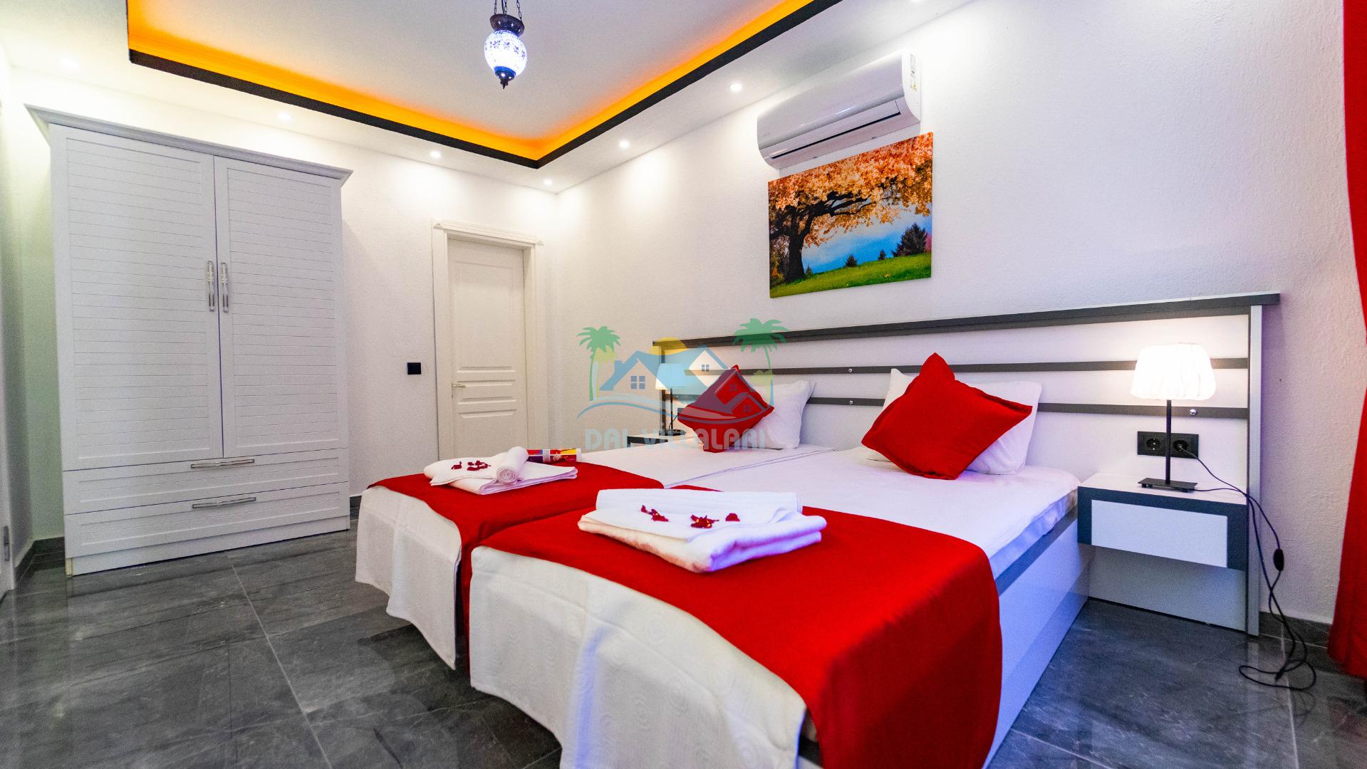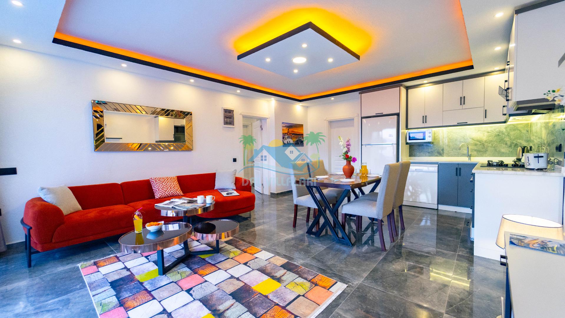Villamızın iç tasarımı ise konforlu ve şık bir atmosfer sunmaktadır. İki yatak odası, konaklamanız boyunca rahat bir uyku sağlamak için modern ve konforlu yataklarla donatılmıştır. Ayrıca, geniş ve ferah bir oturma odası, misafirlerimizin dinlenebileceği ve bir arada vakit geçirebileceği bir alan sunmaktadır.