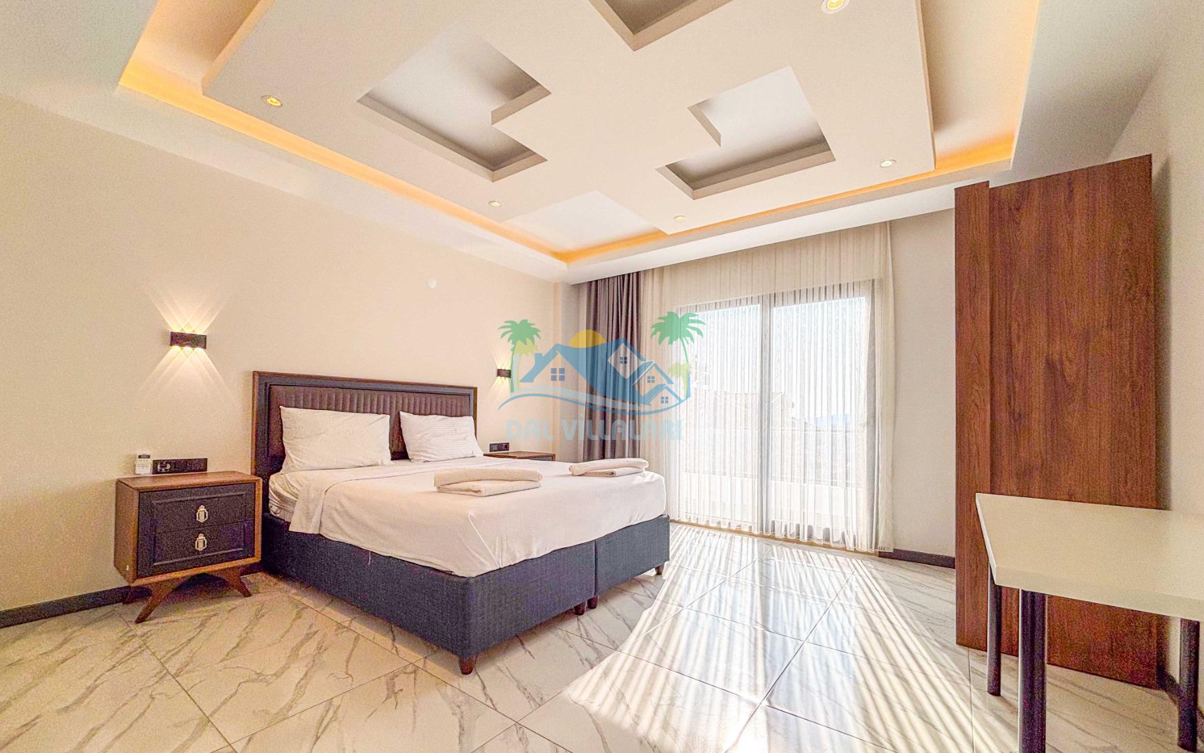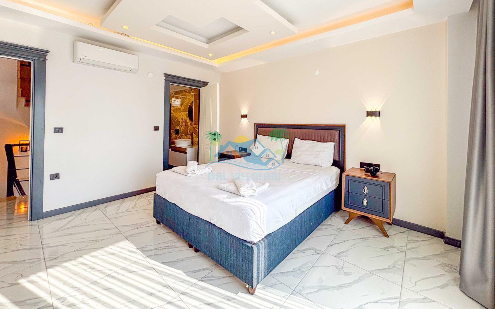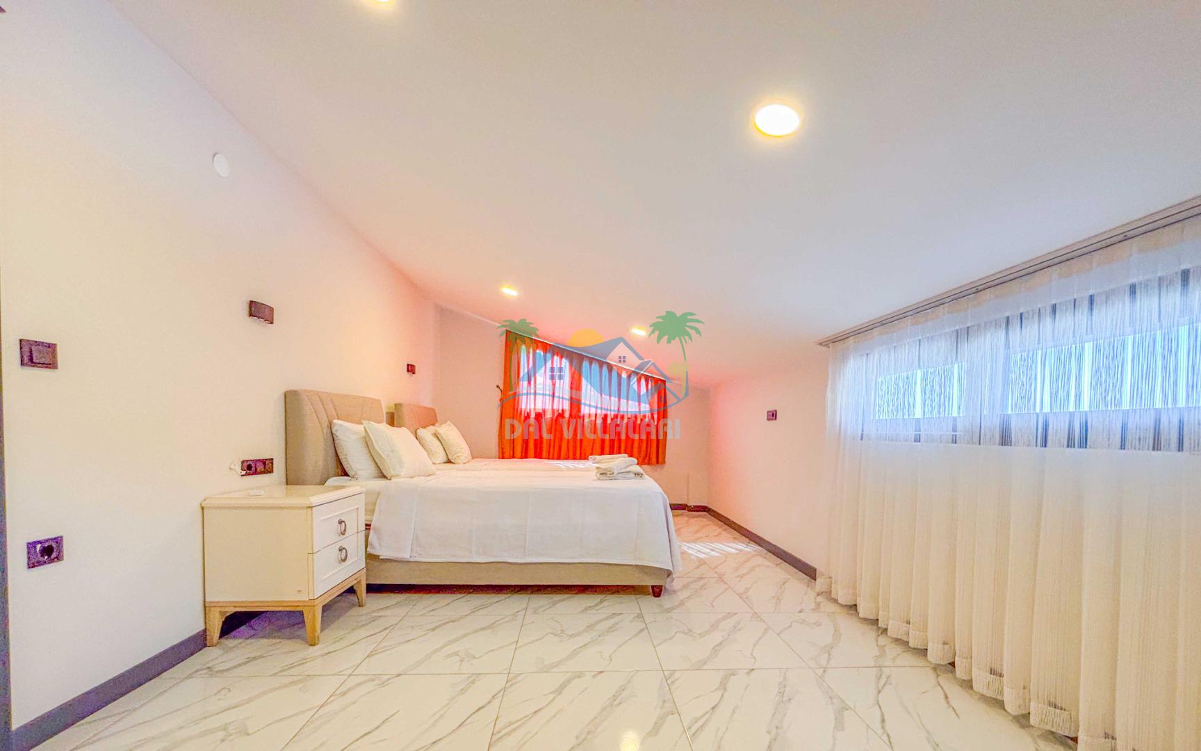 Villanın geniş ve şık iç mekanları, 4 adet yatak odası, geniş bir oturma alanı, tam donanımlı mutfak ve modern banyolar ile konforlu bir konaklama sağlar. 8 kişilik kapasitesi ile geniş aileler için rahat bir konaklama imkanı sunar.