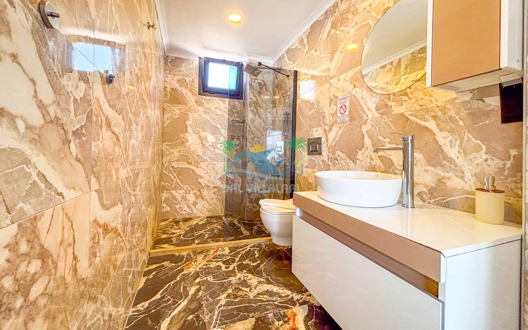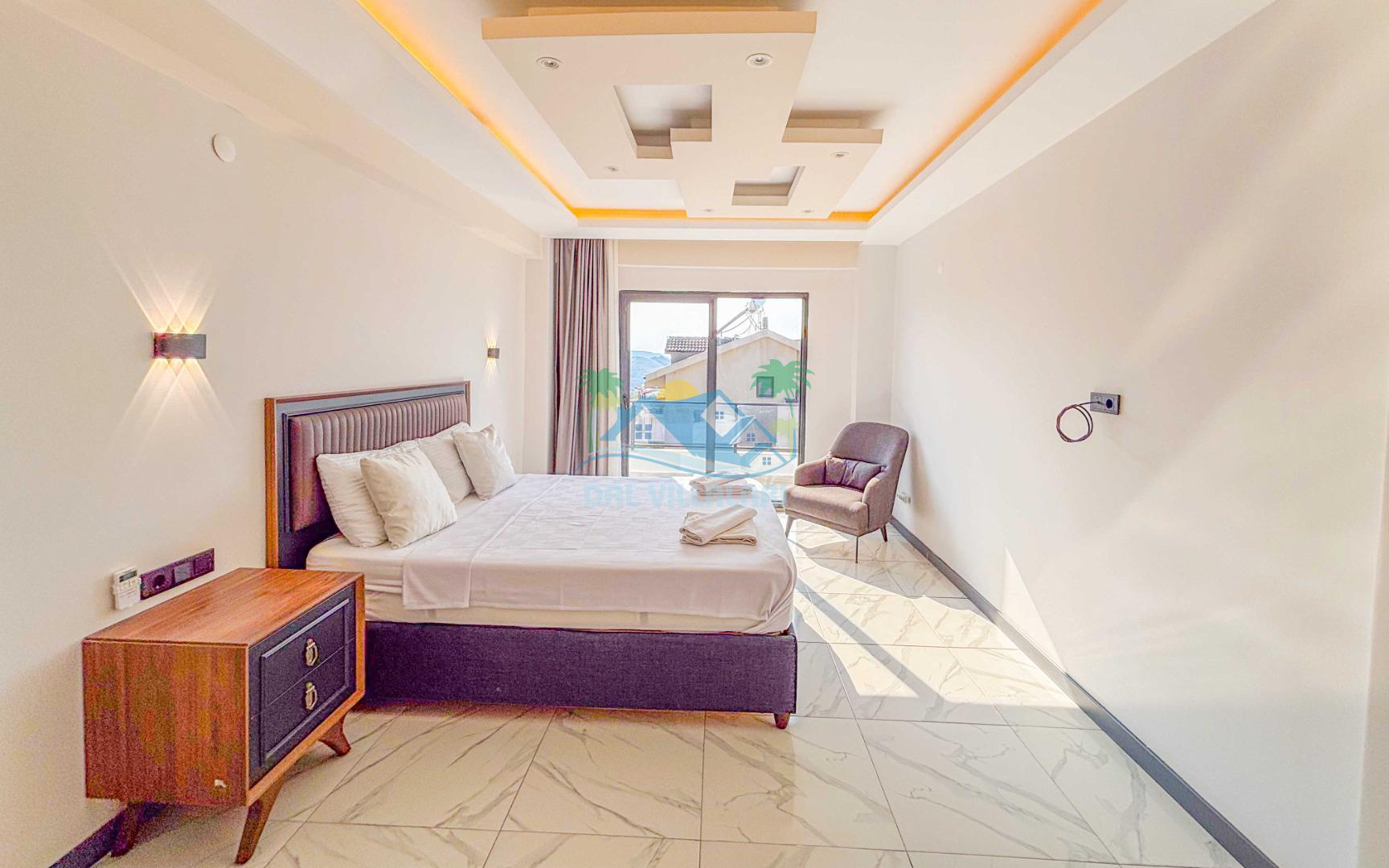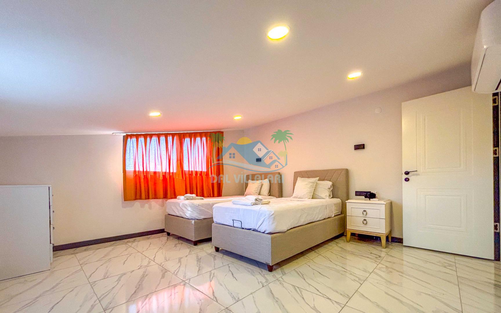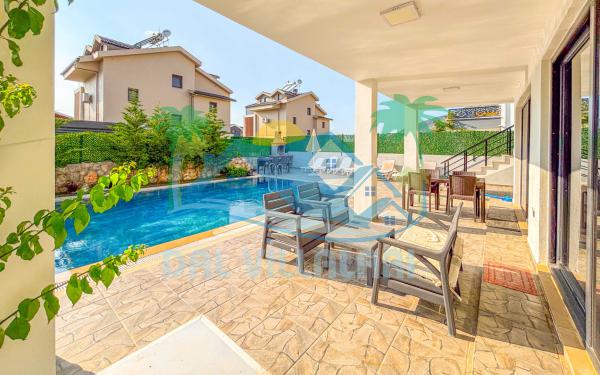 Villanın geniş ve şık iç mekanları, 4 adet yatak odası, geniş bir oturma alanı, tam donanımlı mutfak ve modern banyolar ile konforlu bir konaklama sağlar. 8 kişilik kapasitesi ile geniş aileler için rahat bir konaklama imkanı sunar.