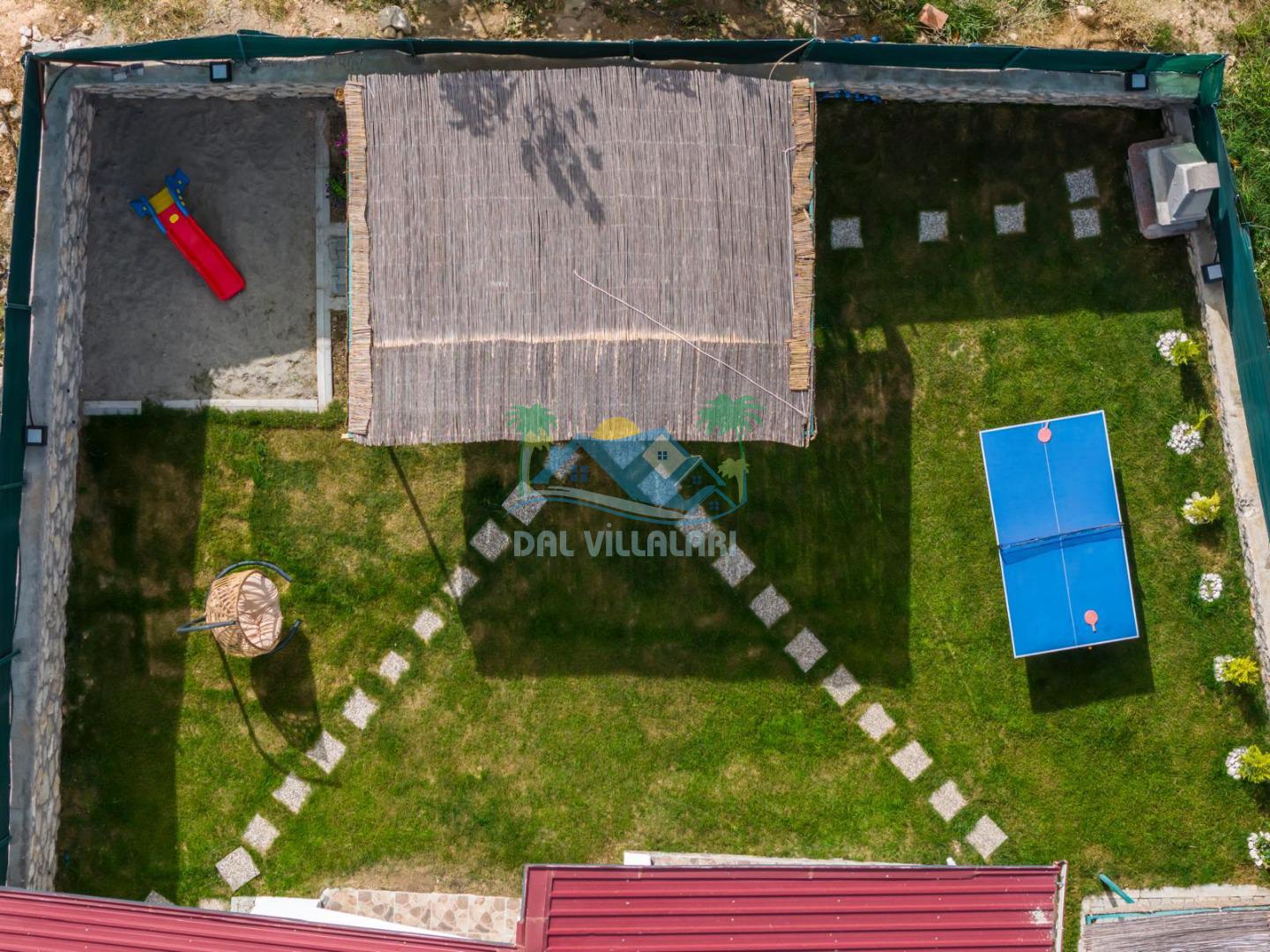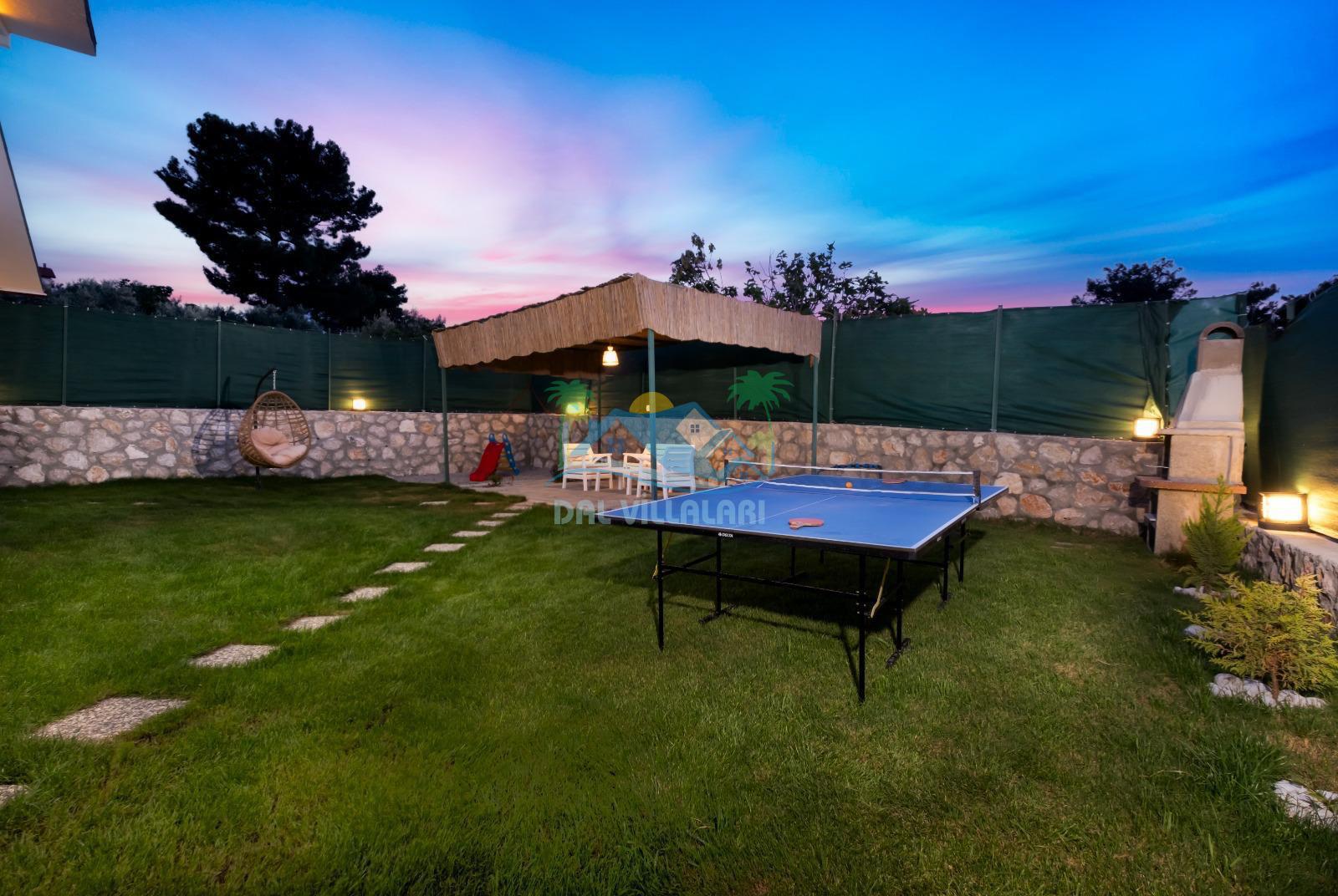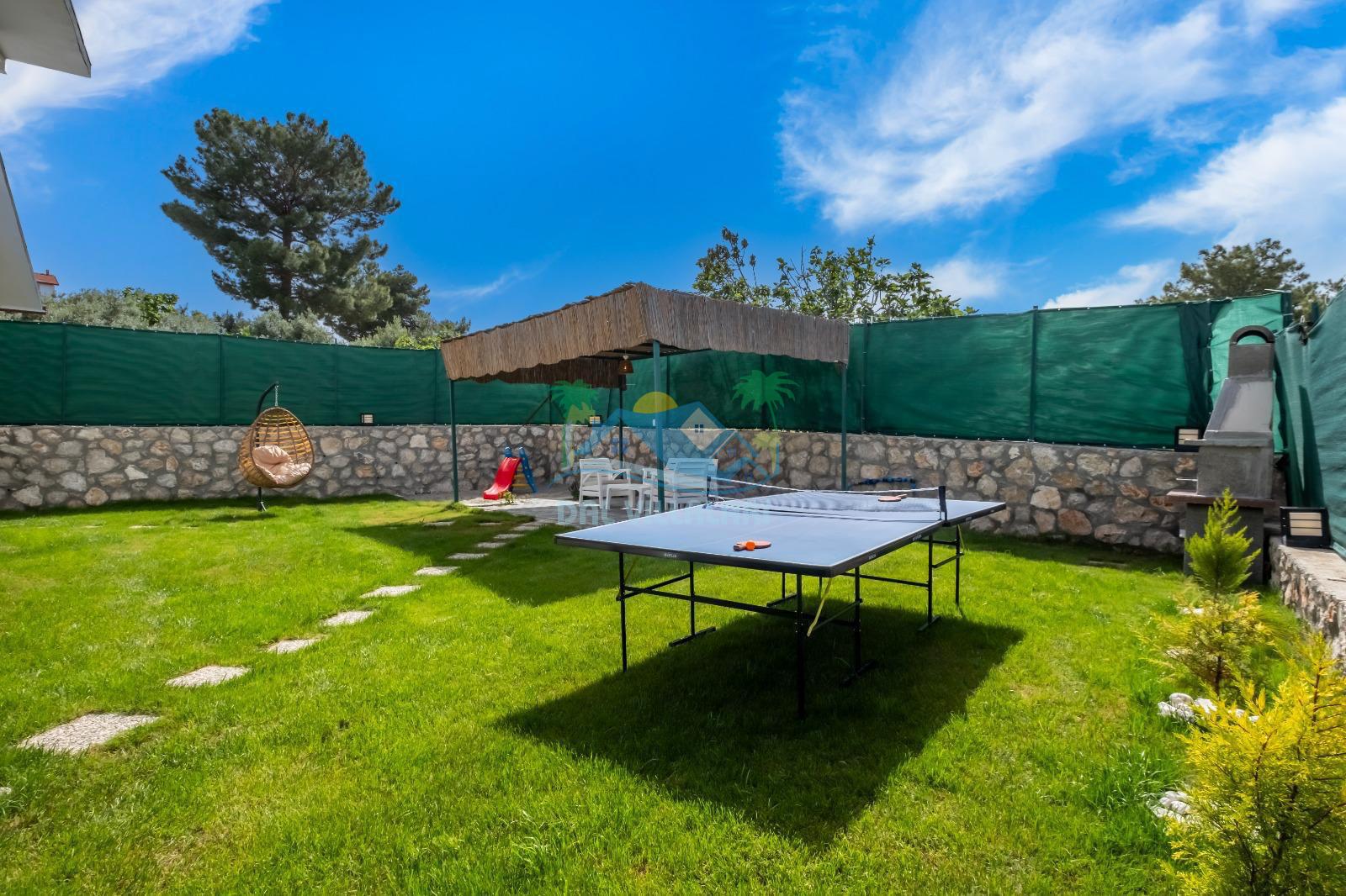 Villanın geniş bahçesi, hem yetişkinler hem de çocuklar için ideal şekilde tasarlanmıştır. Bahçede yer alan masa tenisi ile eğlenceli anlar yaşayabilir, çocuklar ise güvenli bir şekilde çocuk oyun alanında vakit geçirebilir.
