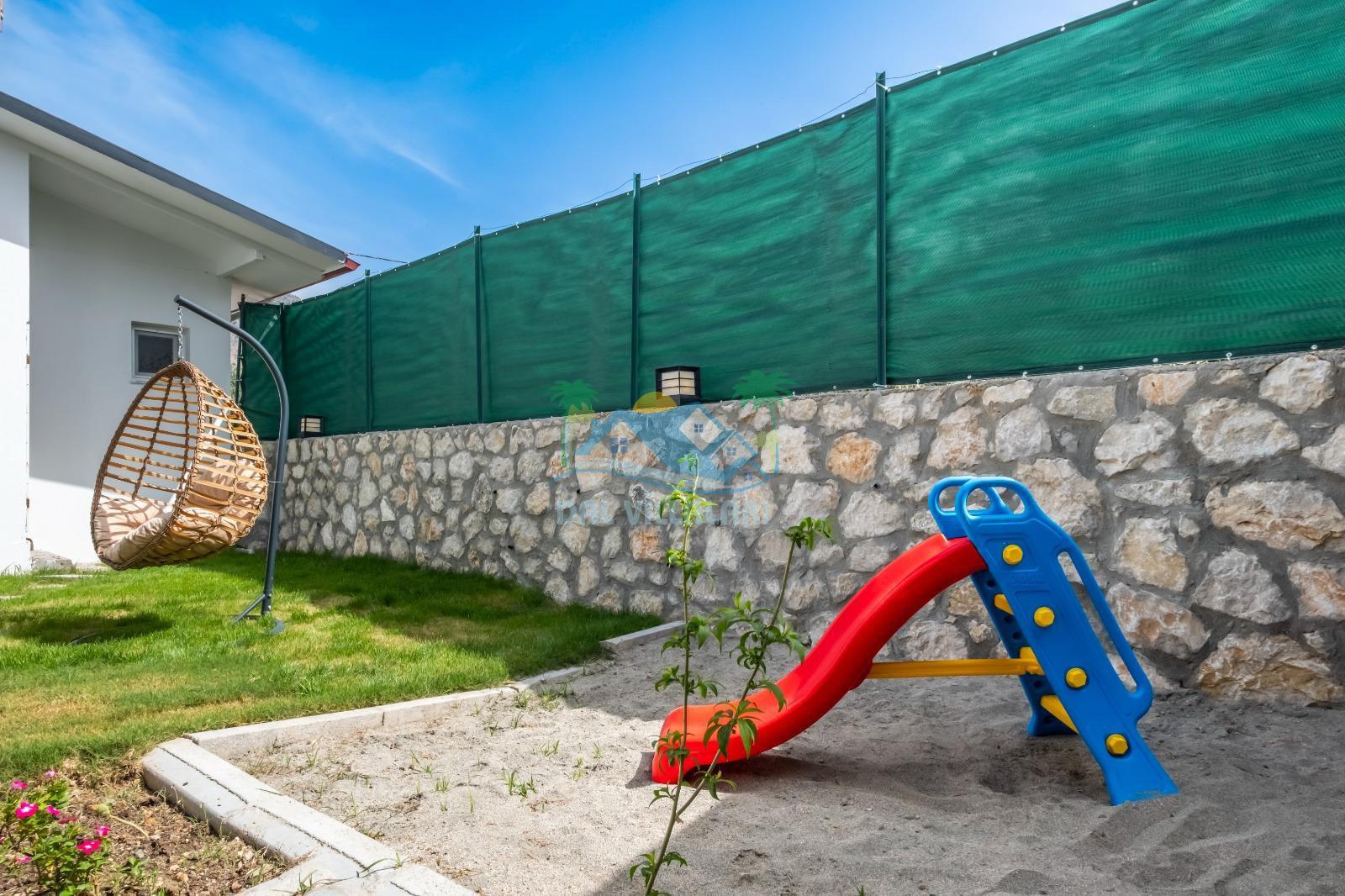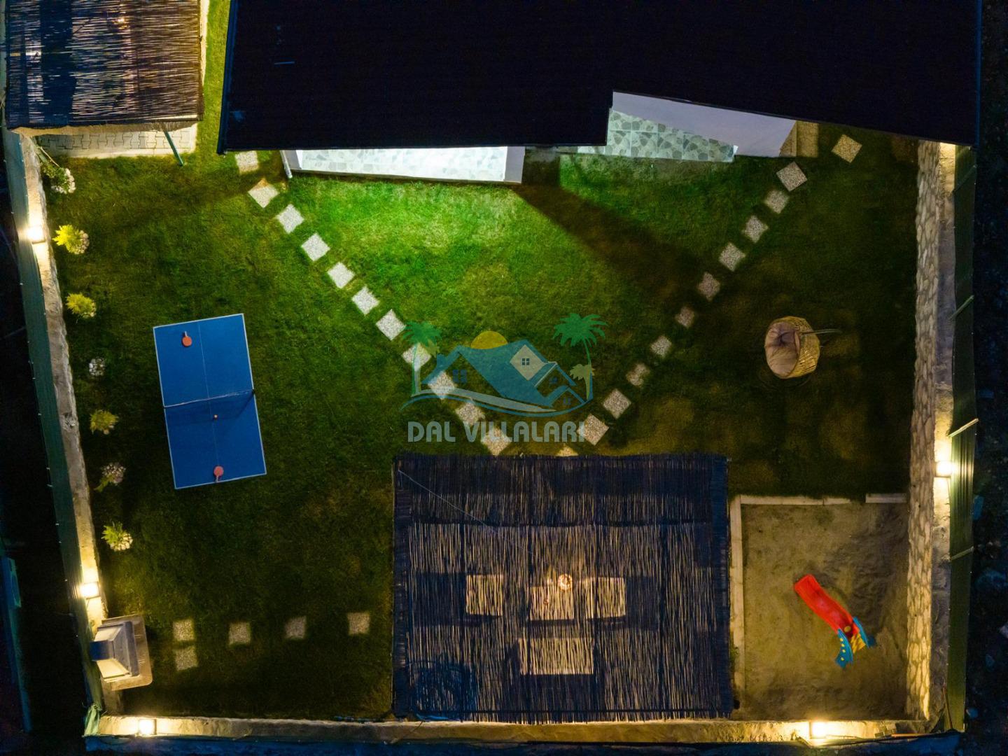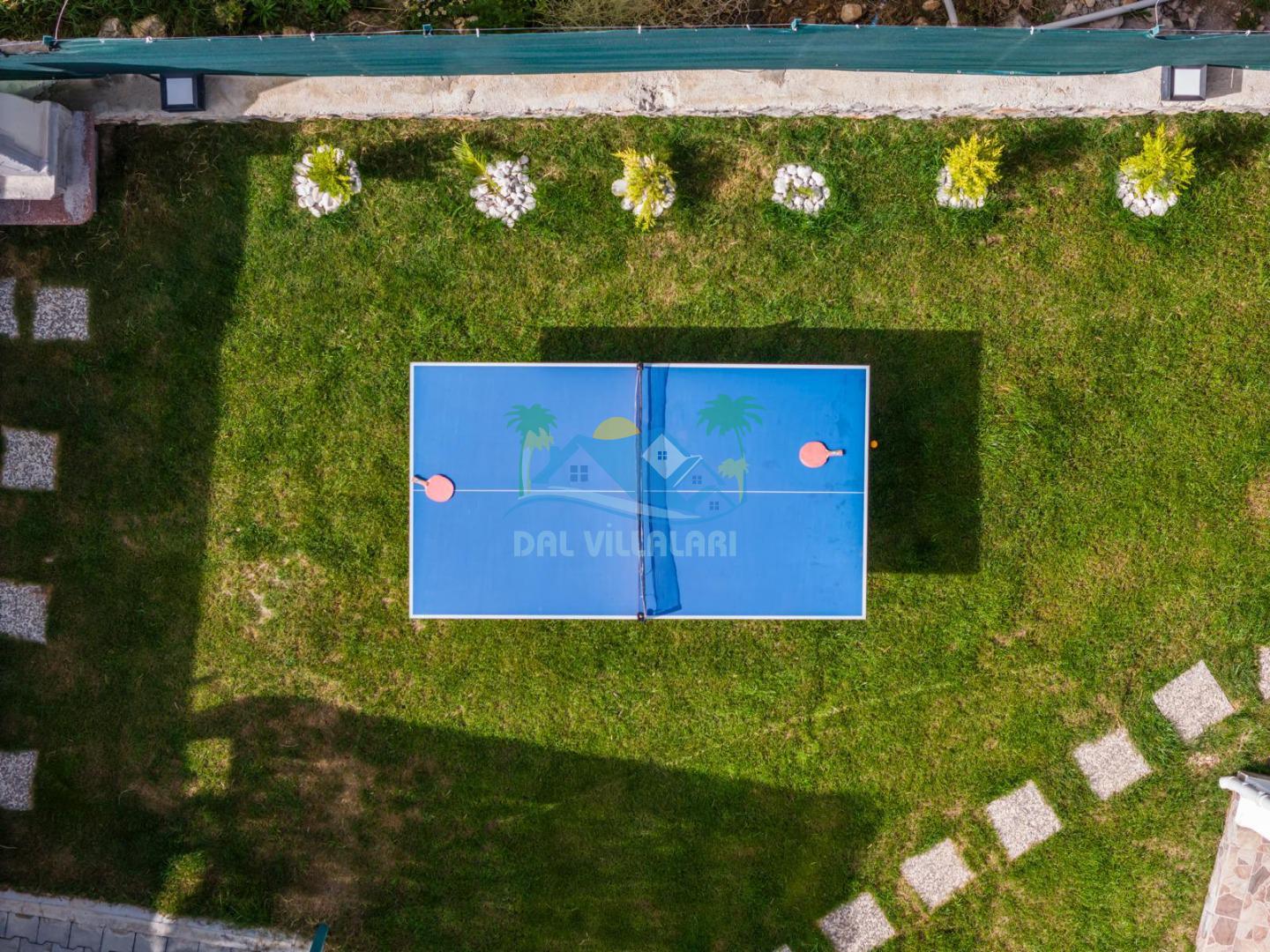 Villanın geniş bahçesi, hem yetişkinler hem de çocuklar için ideal şekilde tasarlanmıştır. Bahçede yer alan masa tenisi ile eğlenceli anlar yaşayabilir, çocuklar ise güvenli bir şekilde çocuk oyun alanında vakit geçirebilir.