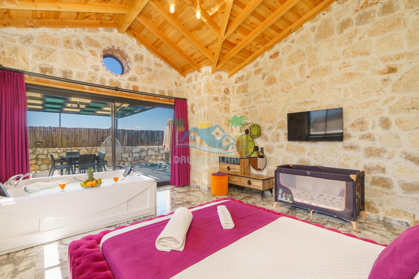 Doğa manzaralı kiralık villa Saltanat 2’de, 2 yatak odası ve 2 adet banyo bulunmaktadır. Geniş alanları sayesinde çocuklu aileler, yakın aile dostları ve arkadaş grupları için uygun bir alternatif olan villa Saltanat 2, deniz ve plaja 13 km uzaklıkta bulunmaktadır. Kendine ait bahçe ve havuzu bulunan villadan hiç ayrılmadan da tatilinizi kaliteli bir şekilde geçirebilirsiniz. Bahçedeki şezlonglarda özgürce güneşlenecek, havuzda serinleyecek ve barbeküde nefis akşam yemekleri hazırlayabileceksiniz. Geniş alanlarının yanı sıra jakuzi, çocuklarınız için oyun alanı, eksiksiz eşyaları ile mutfağı kısacası her detayı ile villa Saltanat 2 sizi mutlu edecek. Villa aynı zamanda muhafazakar tatil için de uygun bir villadır.