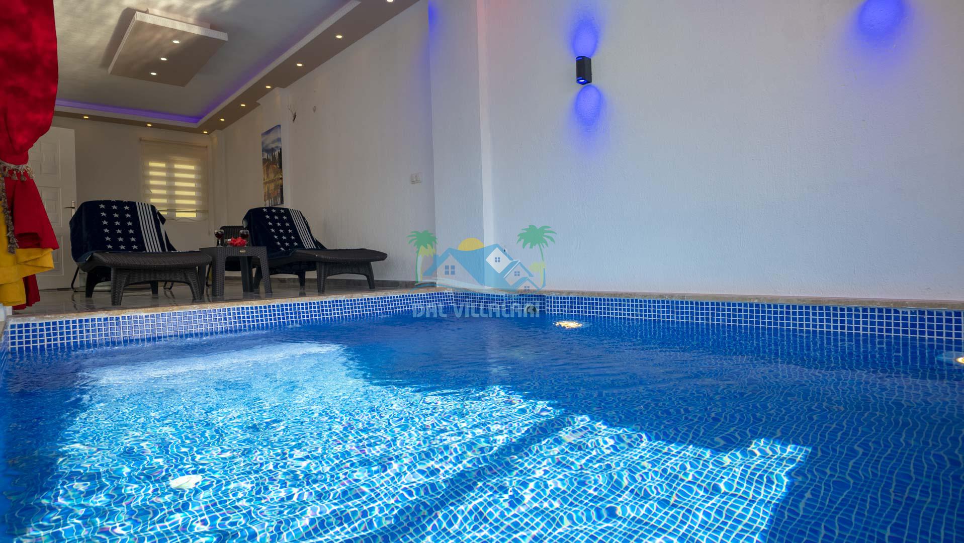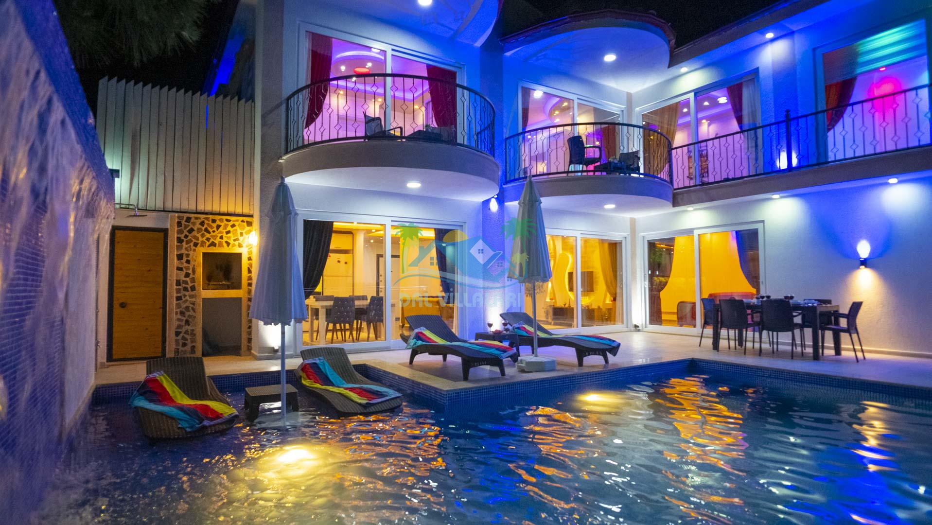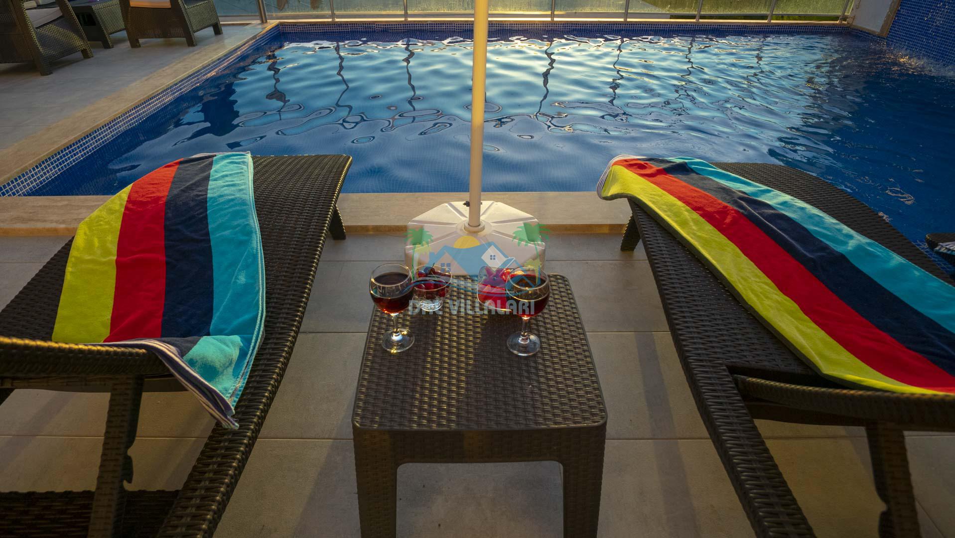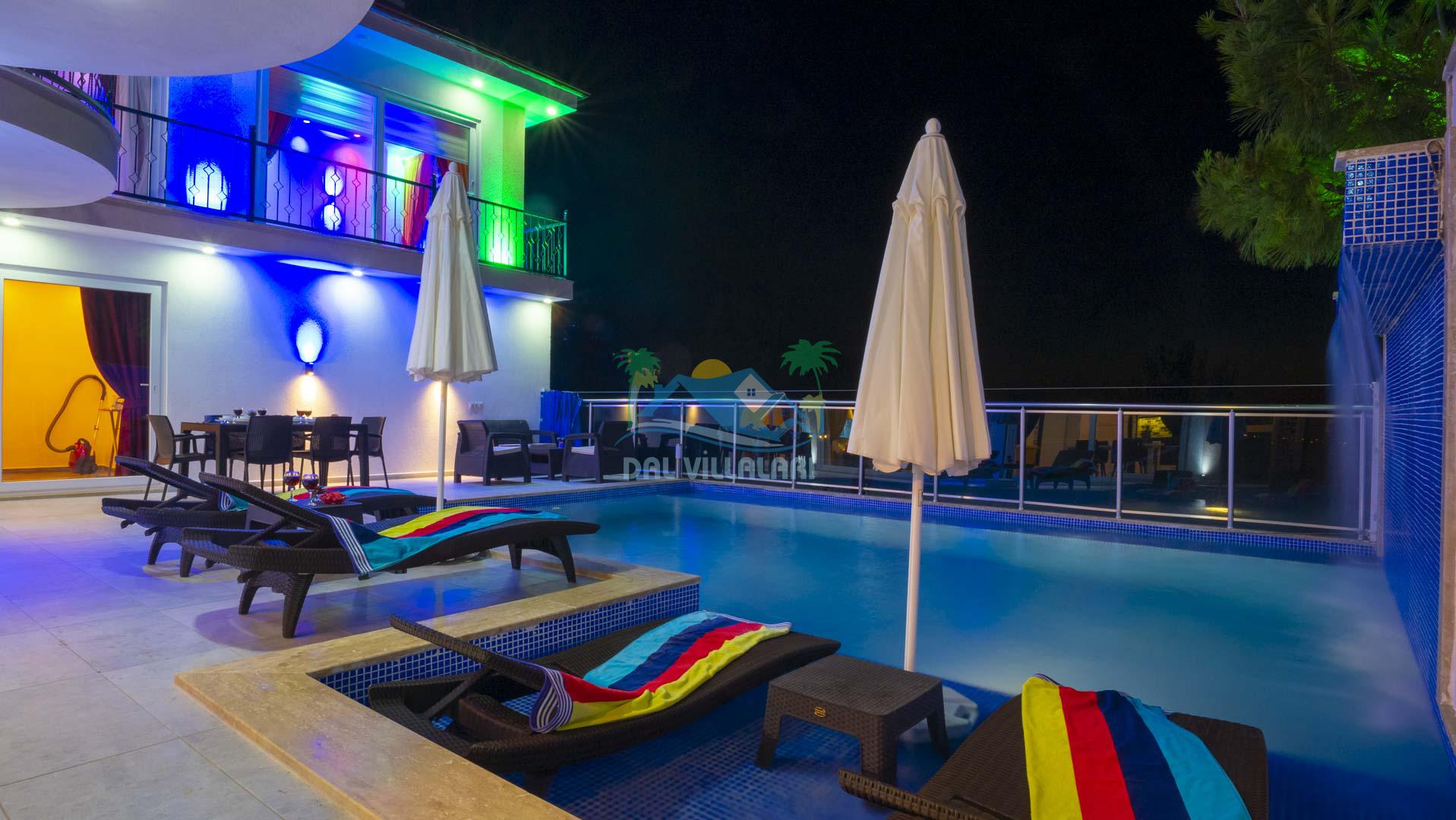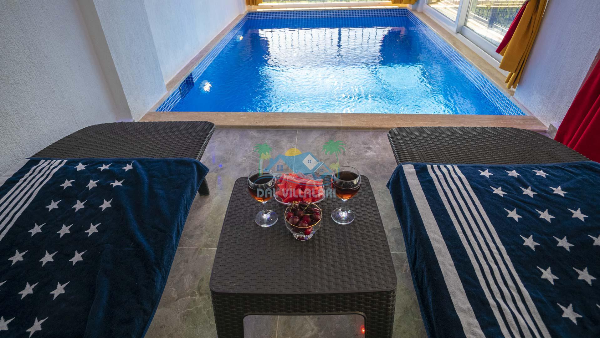 Kalkan Akbel mevkisinde bulunan kiralık balayı villası, 2 yatak odası ve 4 kişilik konaklama kapasitesi ile çocuklu ailelere ve balayı çiftlerine hitap etmektedir. Muhafazakar villalar ve balayı villaları kategorisinde yer alan villamızda soğuk kış aylarında havuz keyfini sürdürebilmeniz için kapalı ısıtmalı bir havuz yer almakta olup ekstra sinema salonuyla eğlenceli zamanlar geçirmenize olanak sağlamaktadır. Havuzu korunaklı ve bahçesi dışarıdan görünmeyen Villa Sare uzaktan deniz manzarasına sahiptir. Villamız, konumu itibariyle kalabalık şehir hayatından kaçmak isteyen ailelerimiz için unutulmaz bir tatil imkanı sunmaktadır.