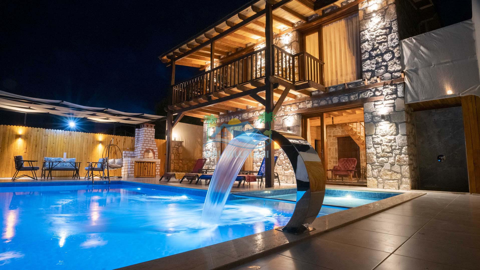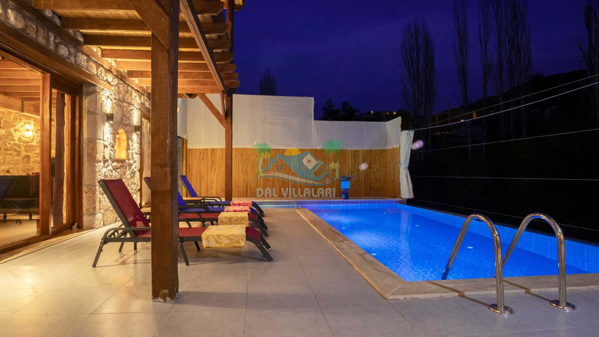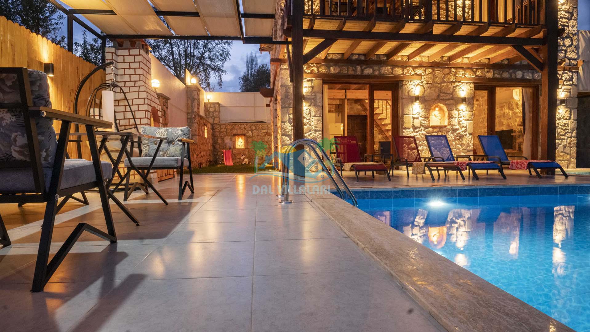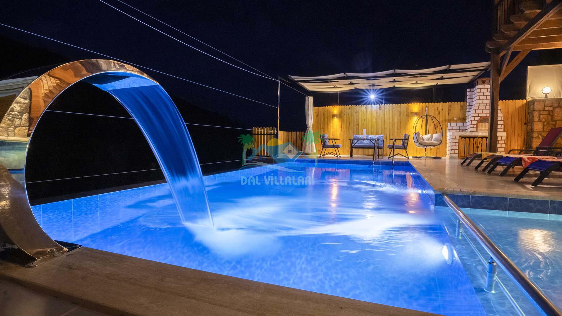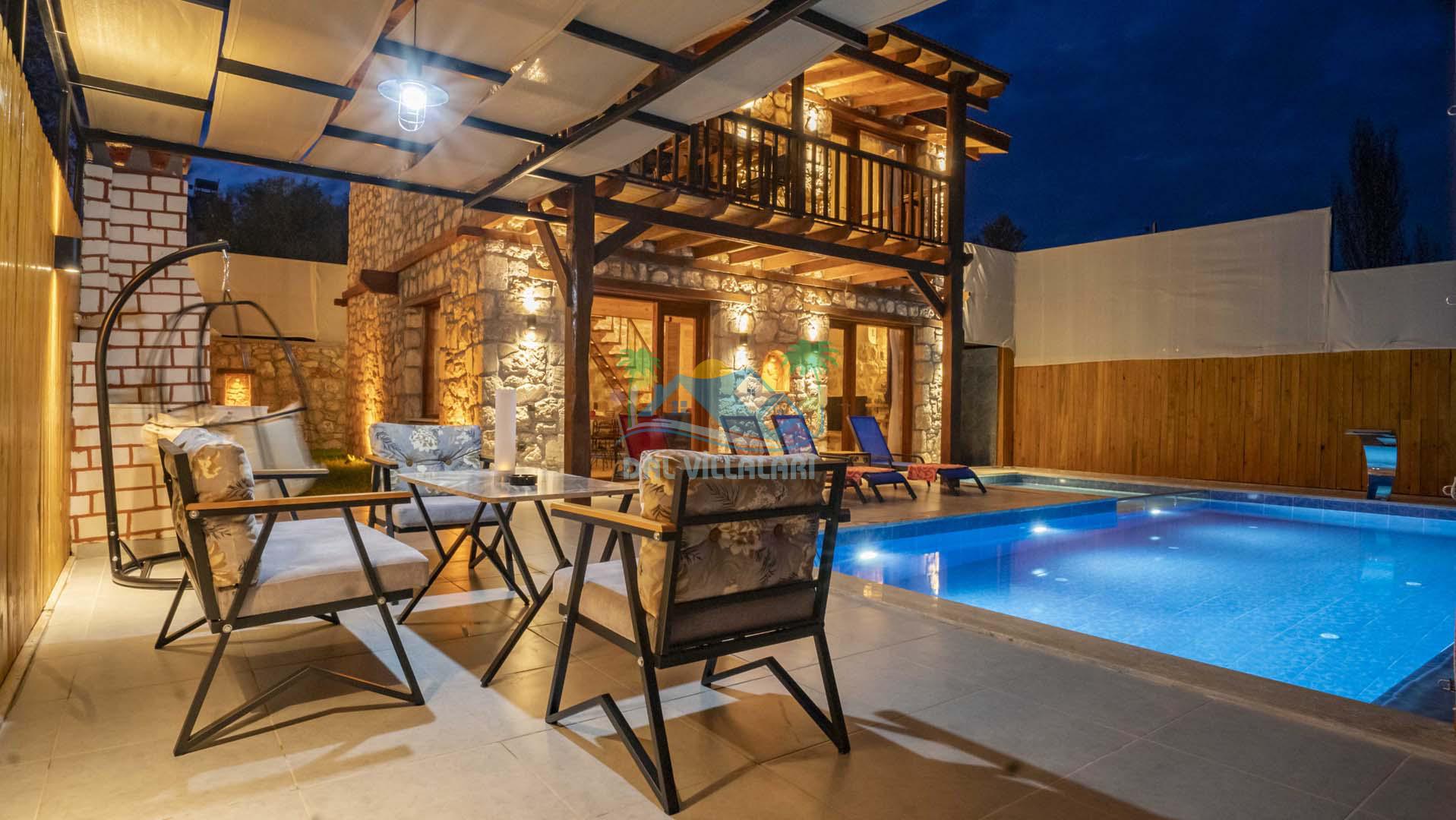 Antalya Kaş Kalkan'ın Sarıbelen mevkiinde konumlanmış, çekirdek ailelere ve balayı çiftlerine hitap eden, özel havuz ve jakuzi keyfi sunan, geniş bahçe alanına sahip, çocuklu aileler için çocuk oyun alanı ve çocuk havuzu olan, doğa manzarasına hakim kiralık tatil villasıdır.
