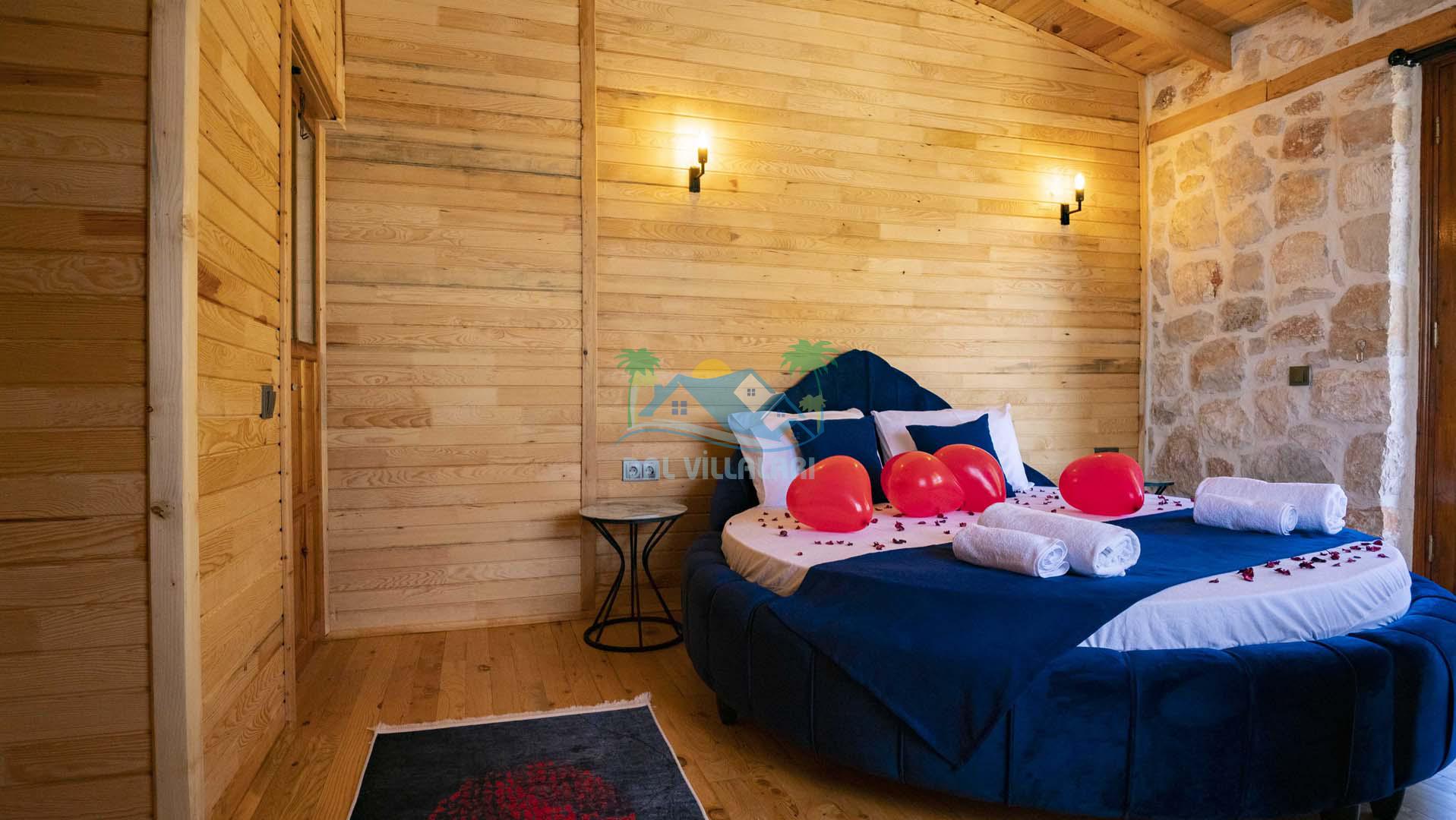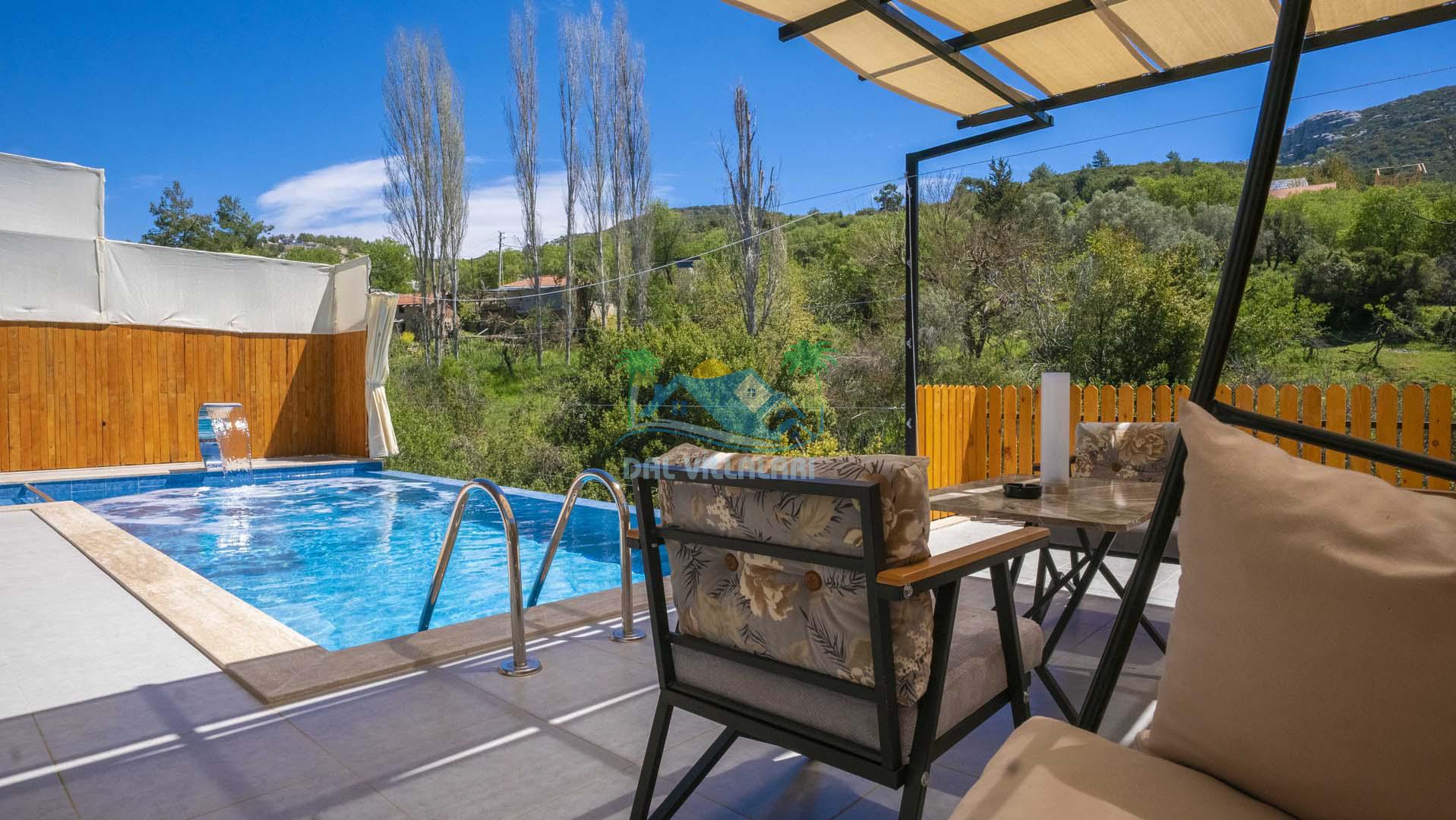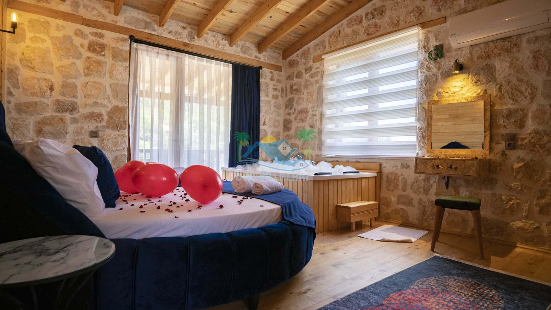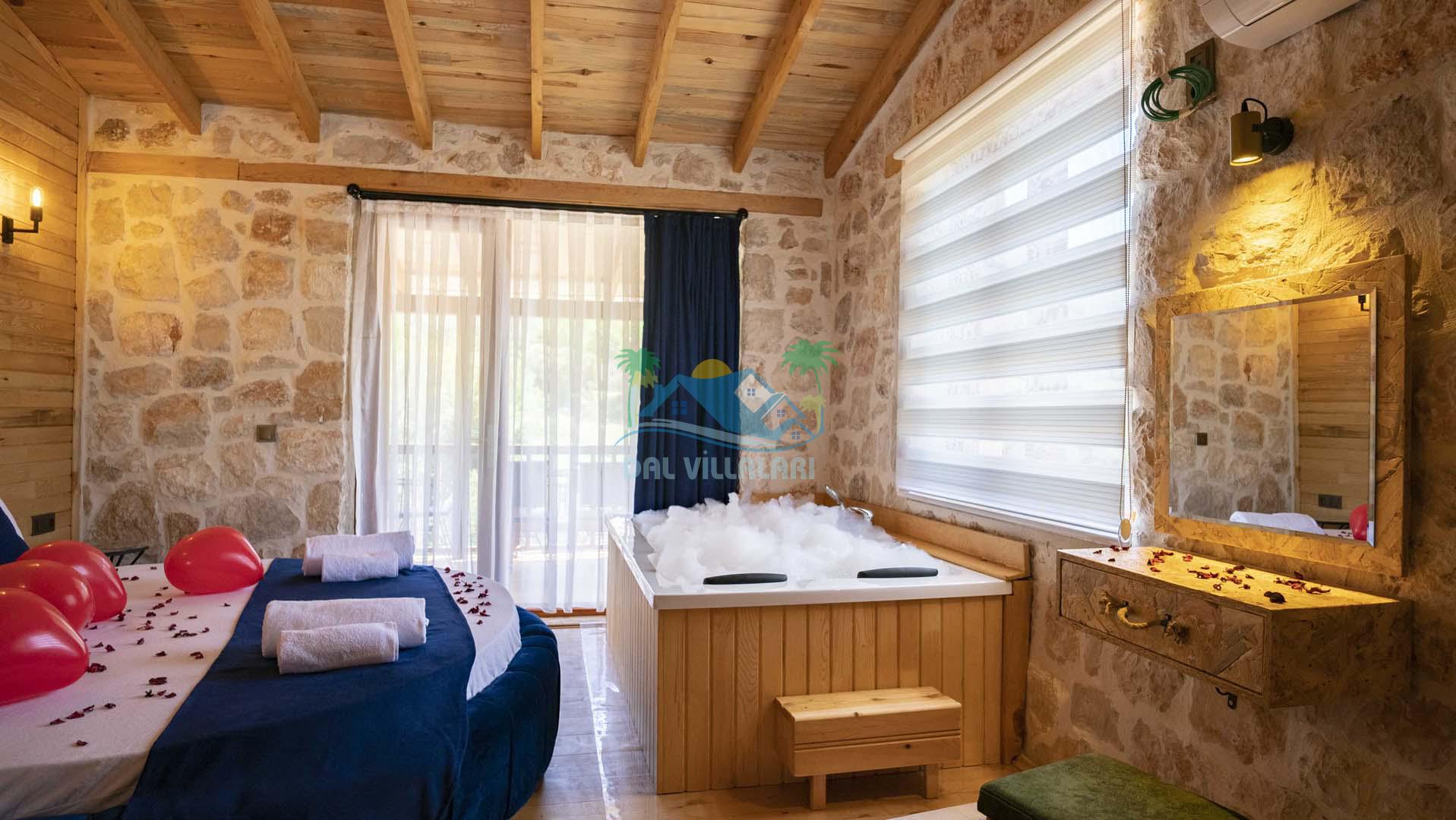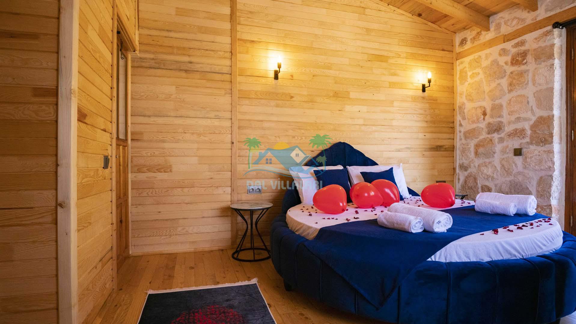 Antalya Kaş Kalkan'ın Sarıbelen mevkiinde konumlanmış, çekirdek ailelere ve balayı çiftlerine hitap eden, özel havuz ve jakuzi keyfi sunan, geniş bahçe alanına sahip, çocuklu aileler için çocuk oyun alanı ve çocuk havuzu olan, doğa manzarasına hakim kiralık tatil villasıdır.