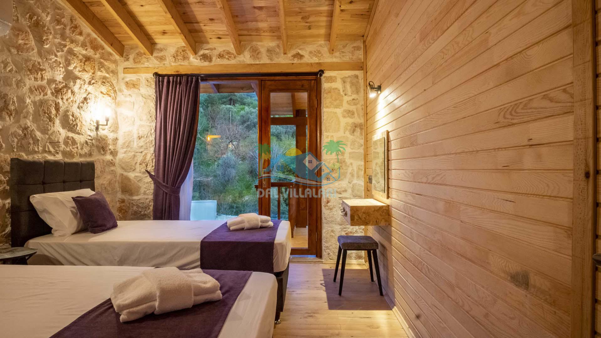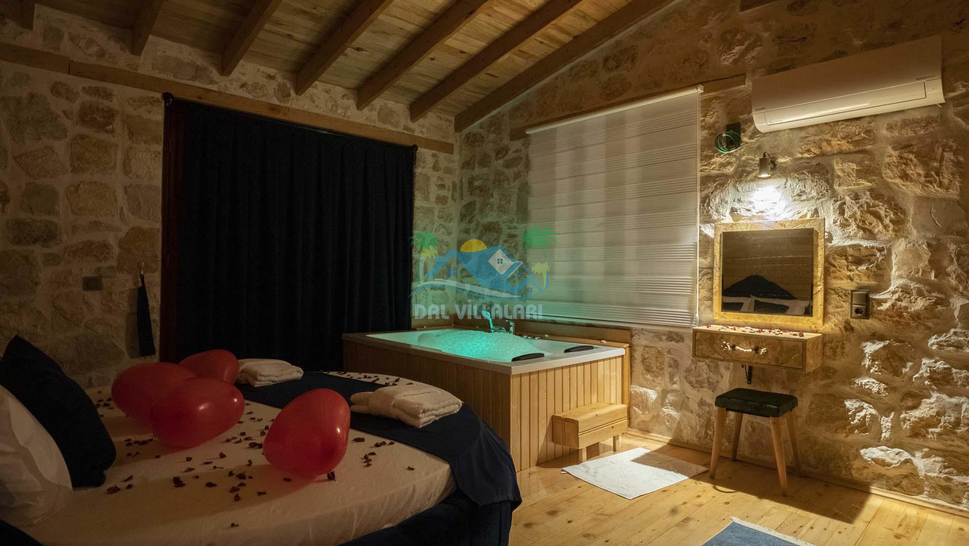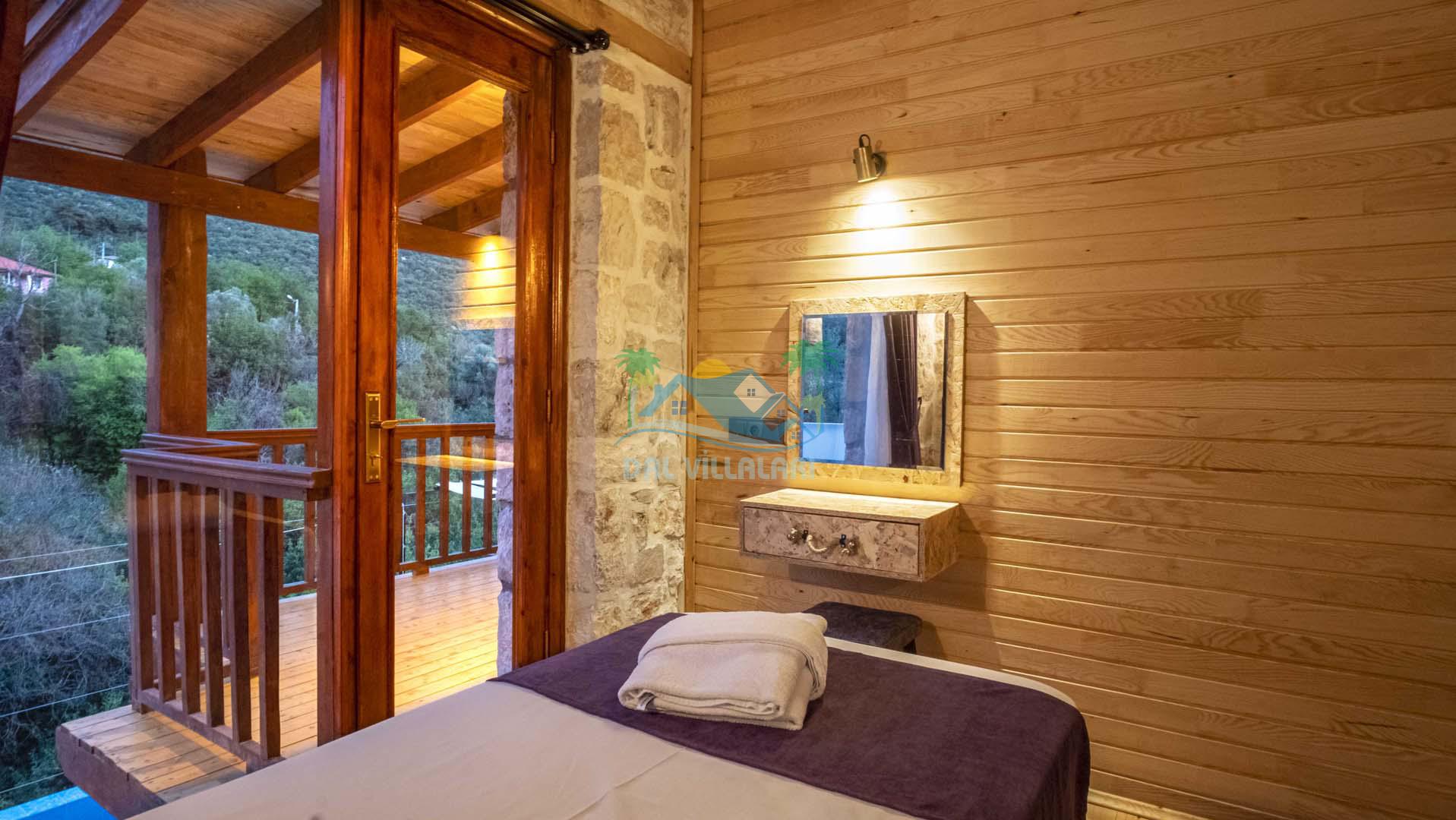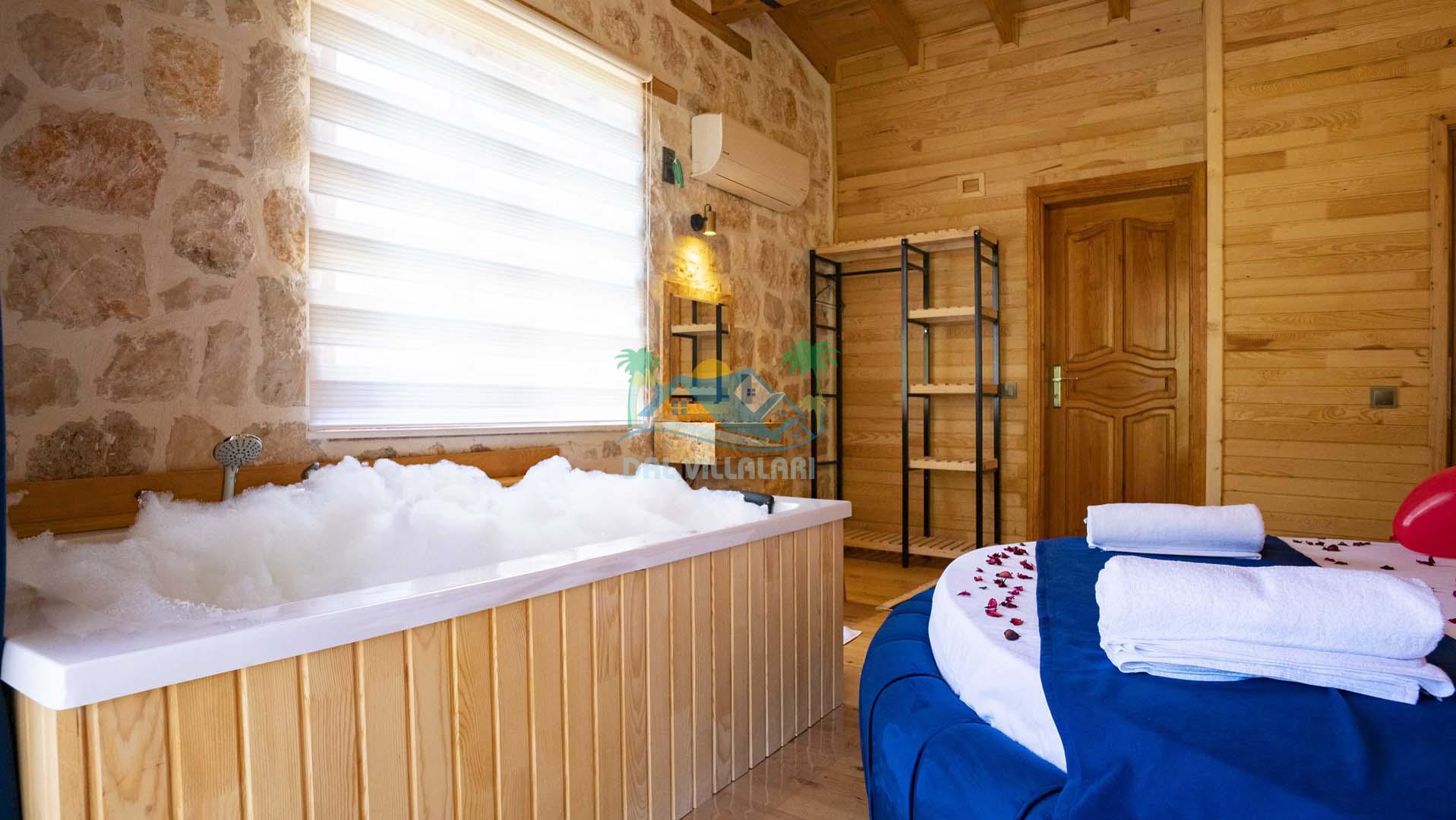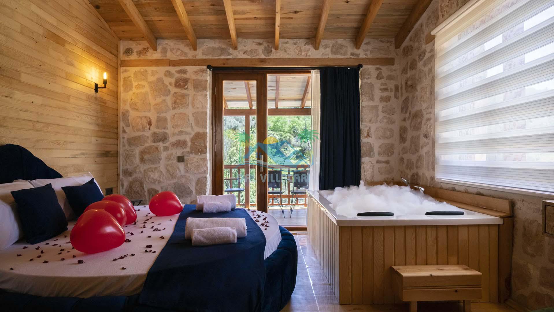 Antalya Kaş Kalkan'ın Sarıbelen mevkiinde konumlanmış, çekirdek ailelere ve balayı çiftlerine hitap eden, özel havuz ve jakuzi keyfi sunan, geniş bahçe alanına sahip, çocuklu aileler için çocuk oyun alanı ve çocuk havuzu olan, doğa manzarasına hakim kiralık tatil villasıdır.