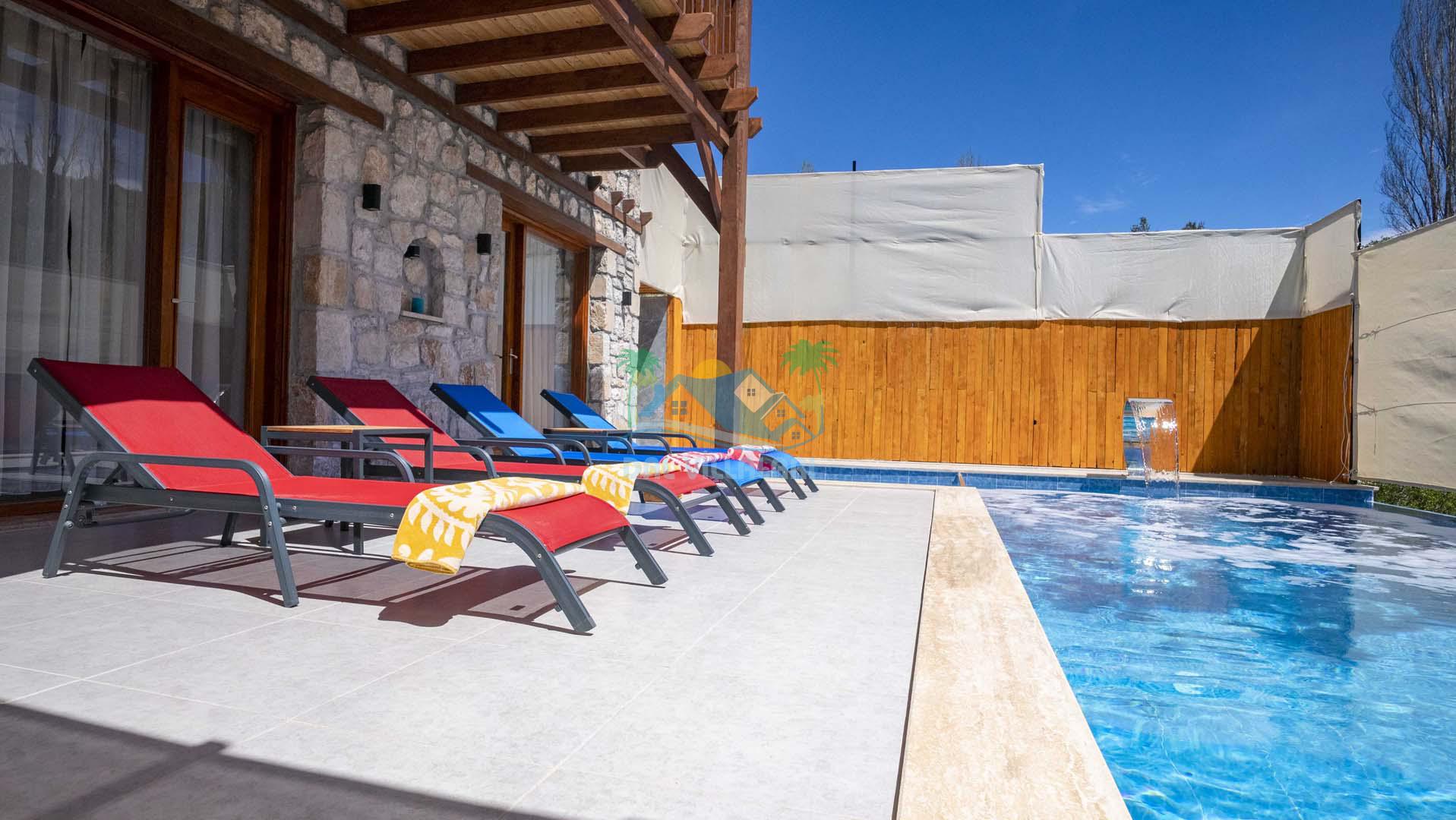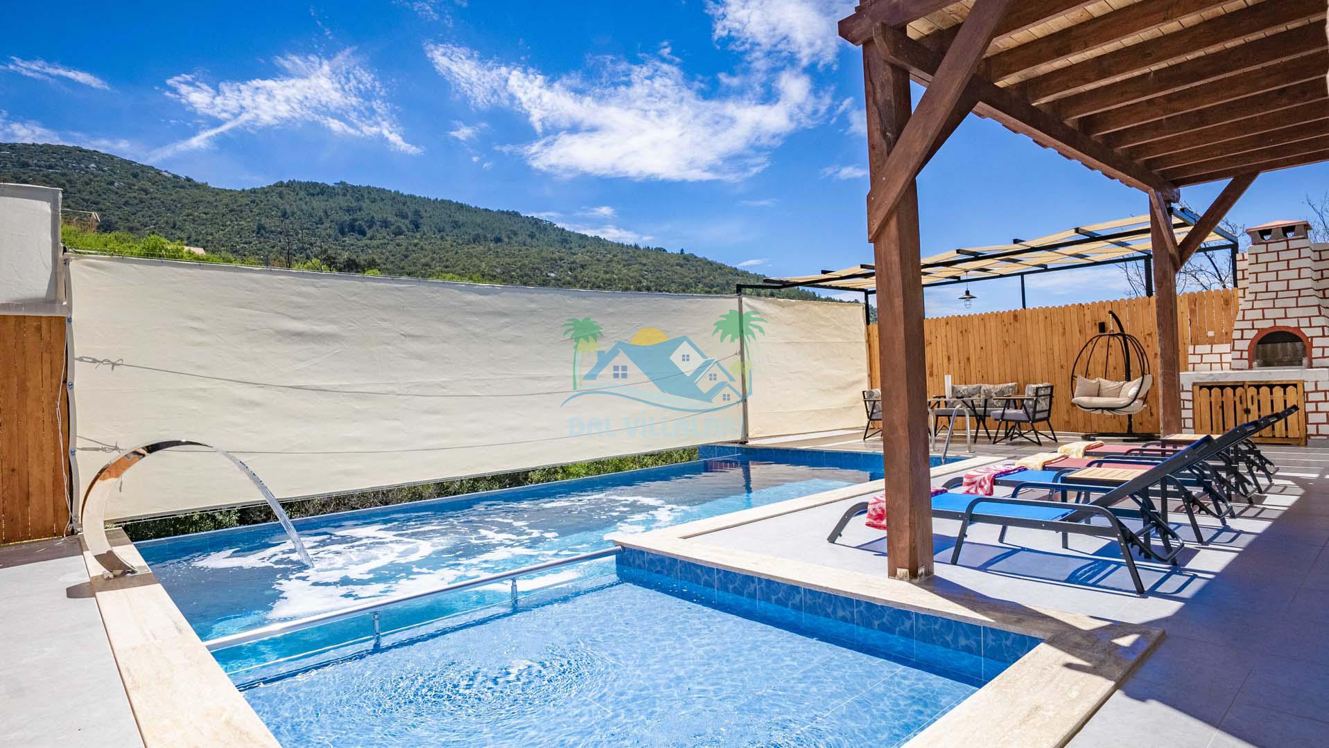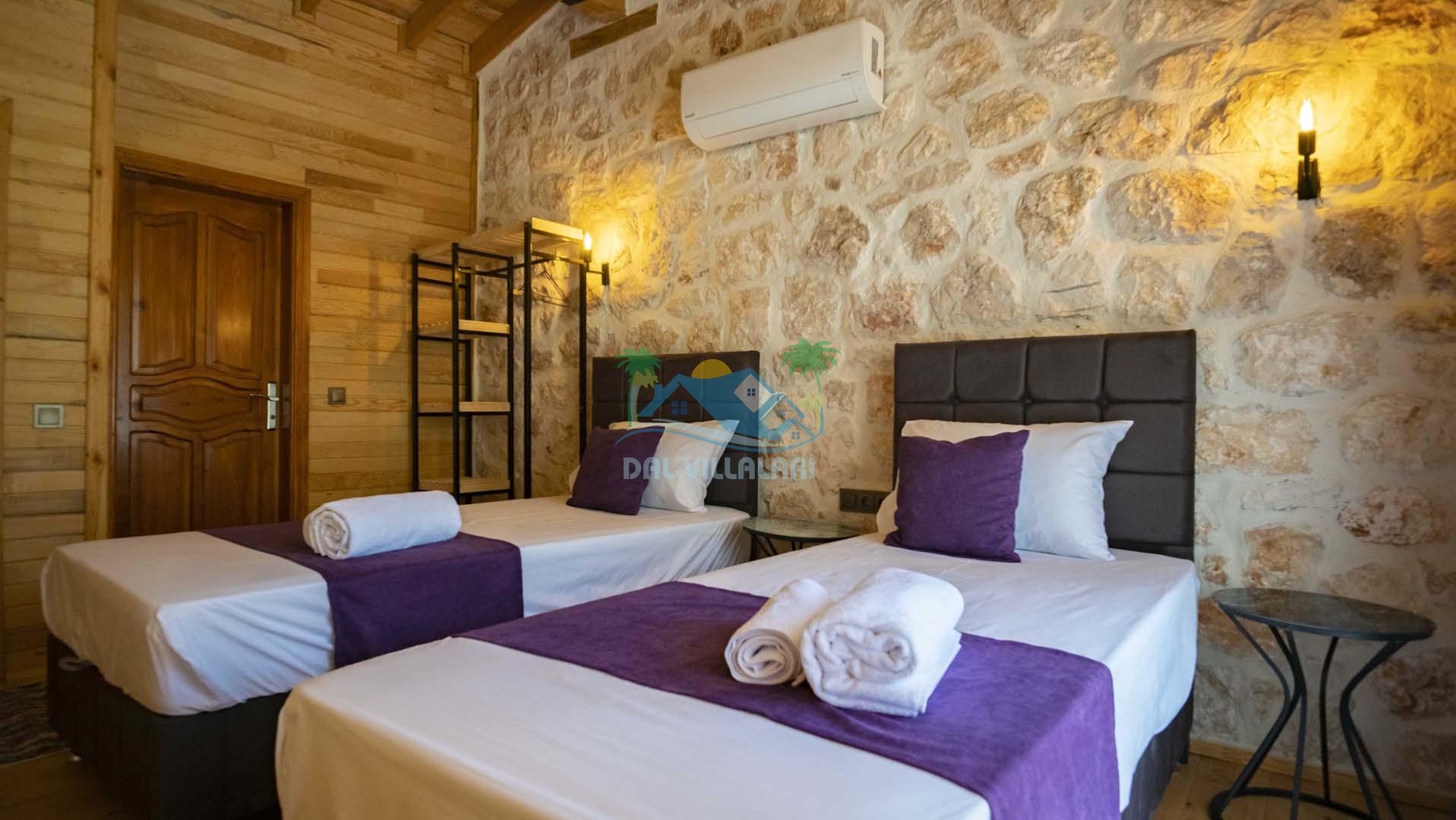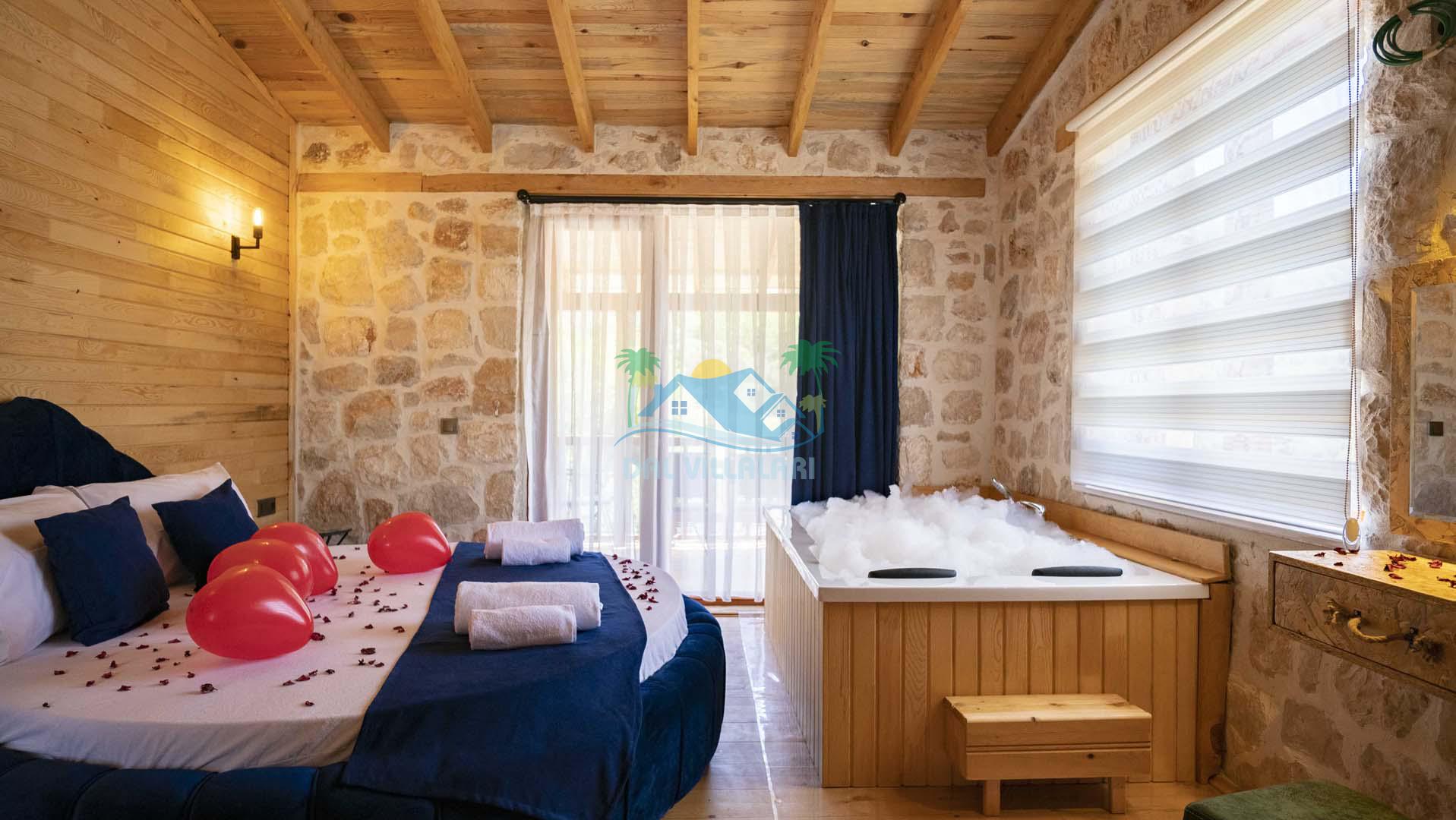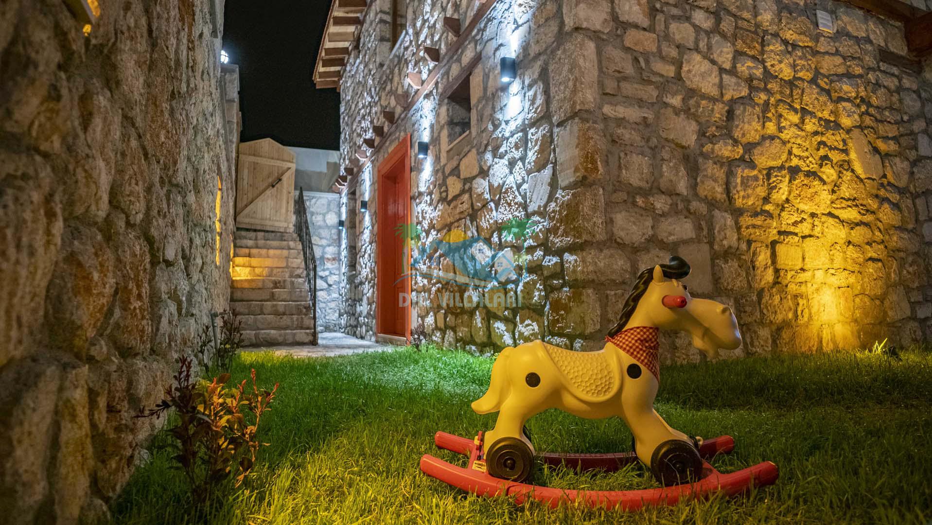 Antalya Kaş Kalkan'ın Sarıbelen mevkiinde konumlanmış, çekirdek ailelere ve balayı çiftlerine hitap eden, özel havuz ve jakuzi keyfi sunan, geniş bahçe alanına sahip, çocuklu aileler için çocuk oyun alanı ve çocuk havuzu olan, doğa manzarasına hakim kiralık tatil villasıdır.