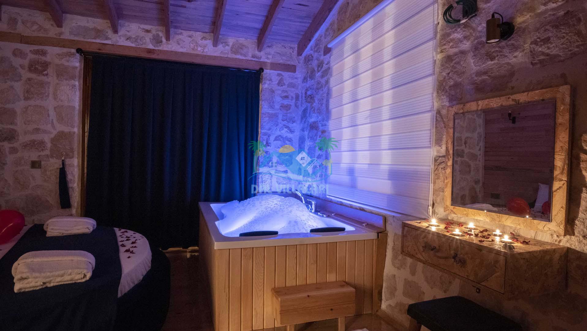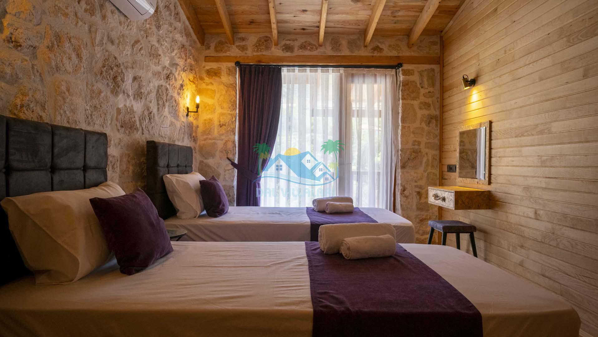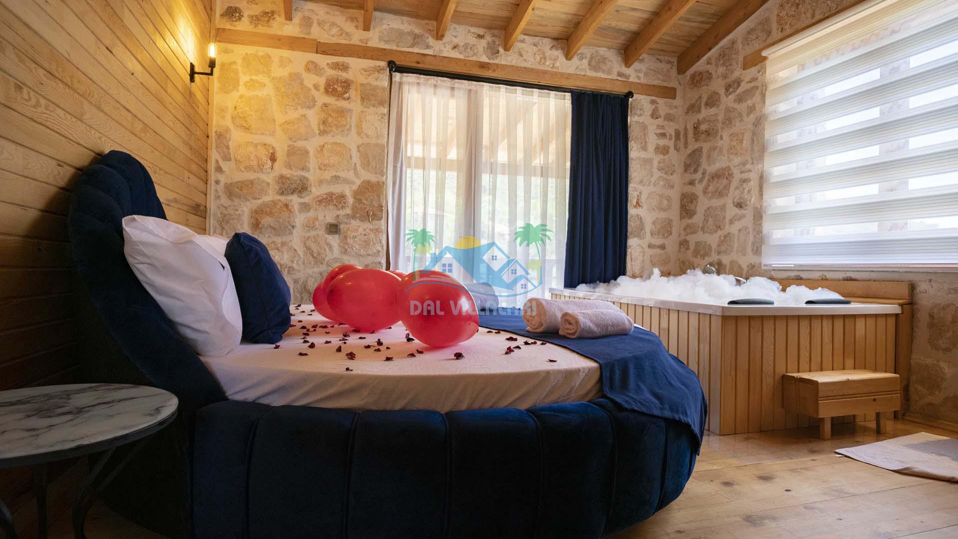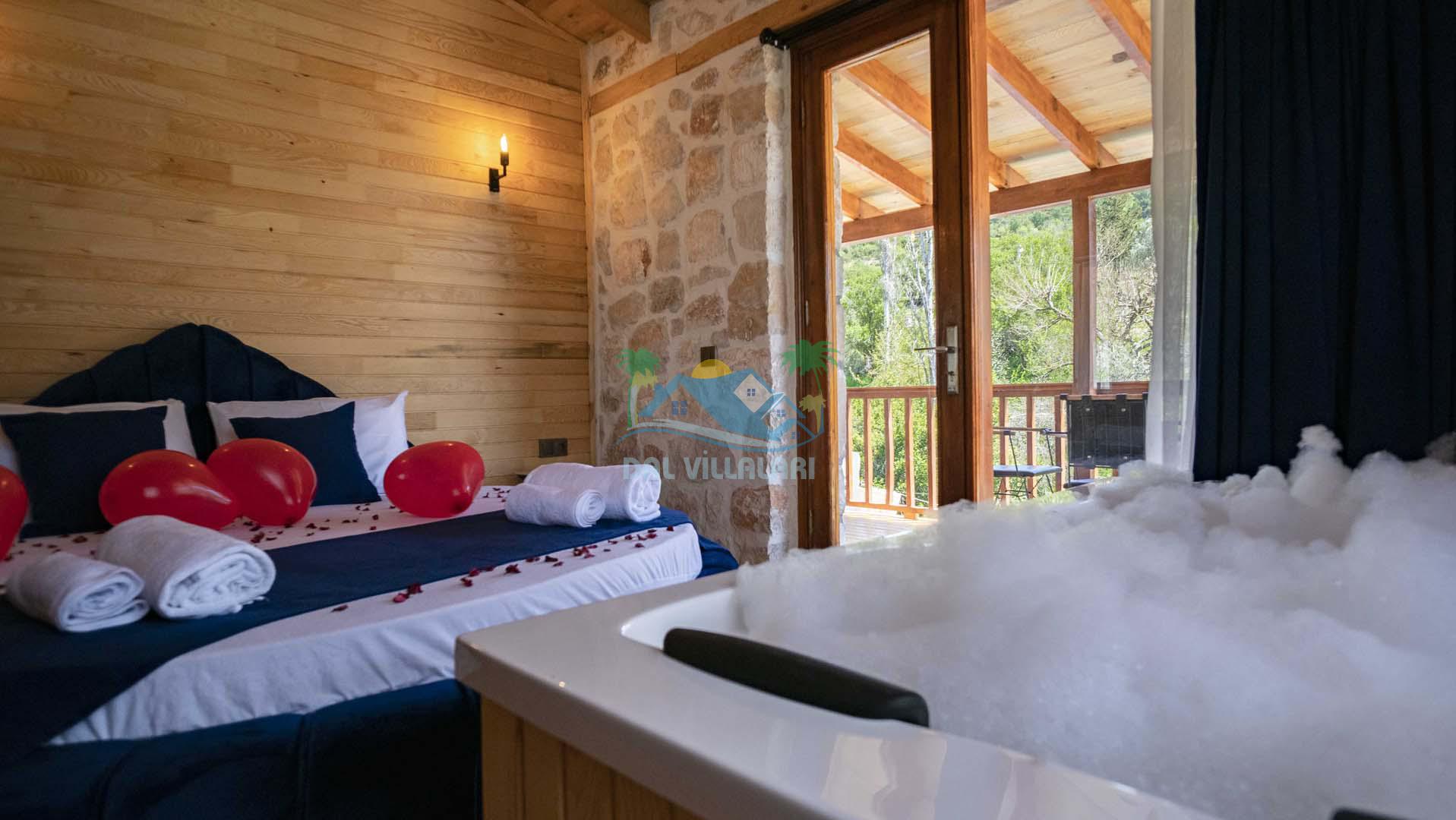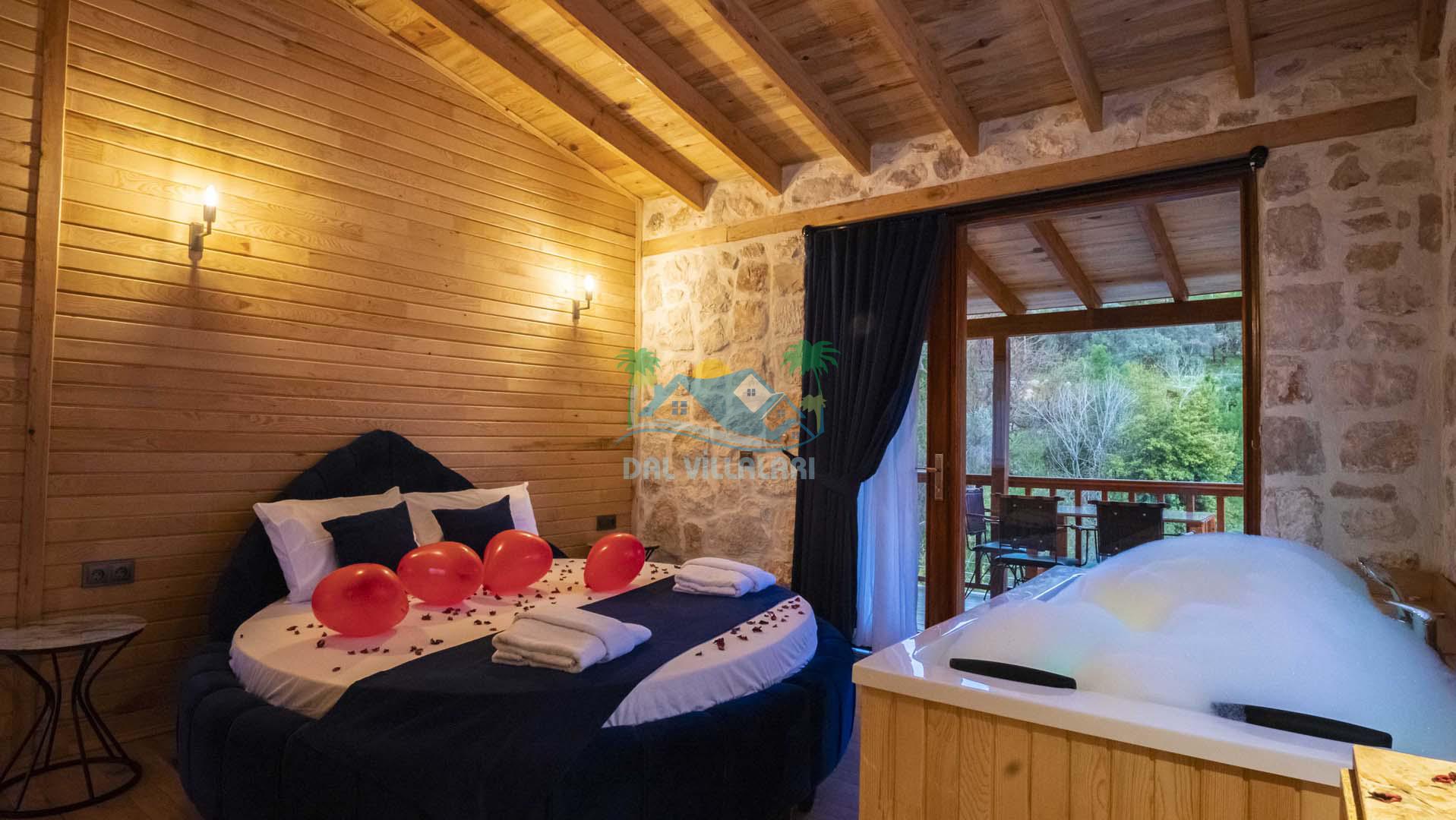 Antalya Kaş Kalkan'ın Sarıbelen mevkiinde konumlanmış, çekirdek ailelere ve balayı çiftlerine hitap eden, özel havuz ve jakuzi keyfi sunan, geniş bahçe alanına sahip, çocuklu aileler için çocuk oyun alanı ve çocuk havuzu olan, doğa manzarasına hakim kiralık tatil villasıdır.