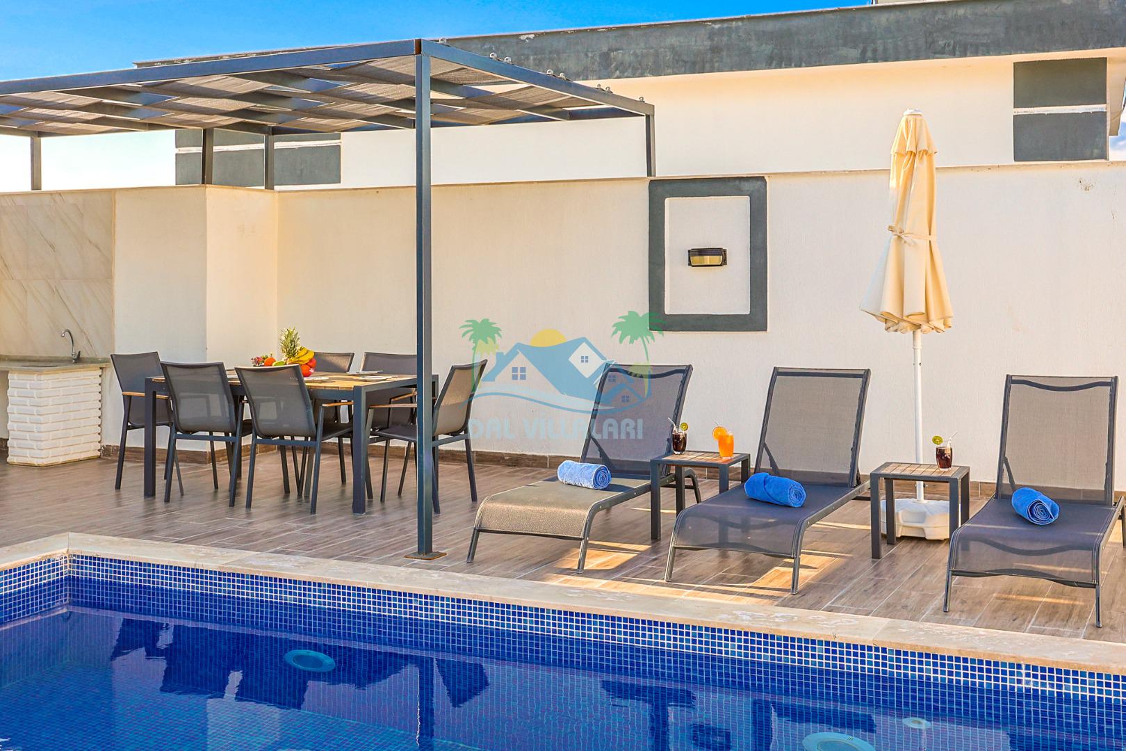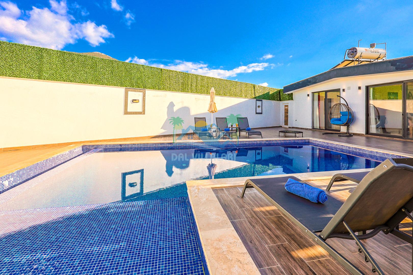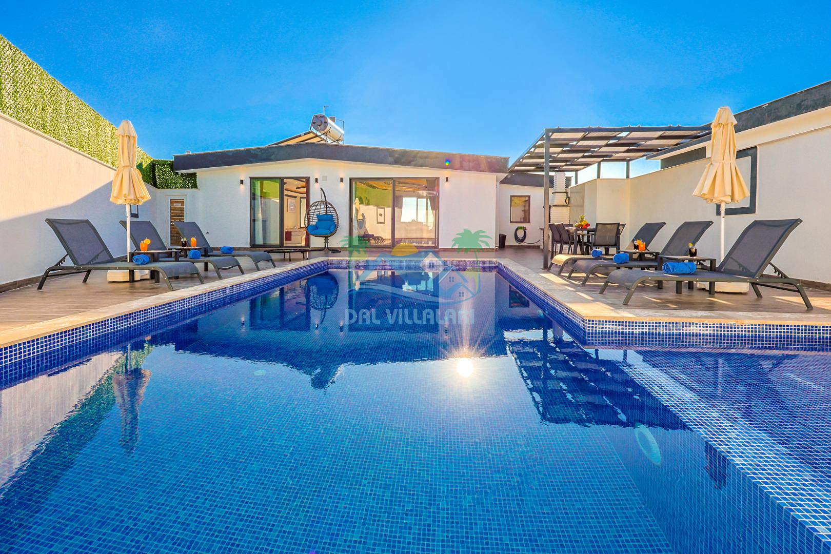 Mahremiyete önem veren misafirlerimiz için villanın özel yüzme havuzu korunaklı yapıdadır ve havuz terası dışarıdan görünmez şekilde tasarlanmıştır. Manzaralı alanda konumlanan 2 kişilik jakuzi, tatilinizi daha konforlu ve keyifli hale getirir.