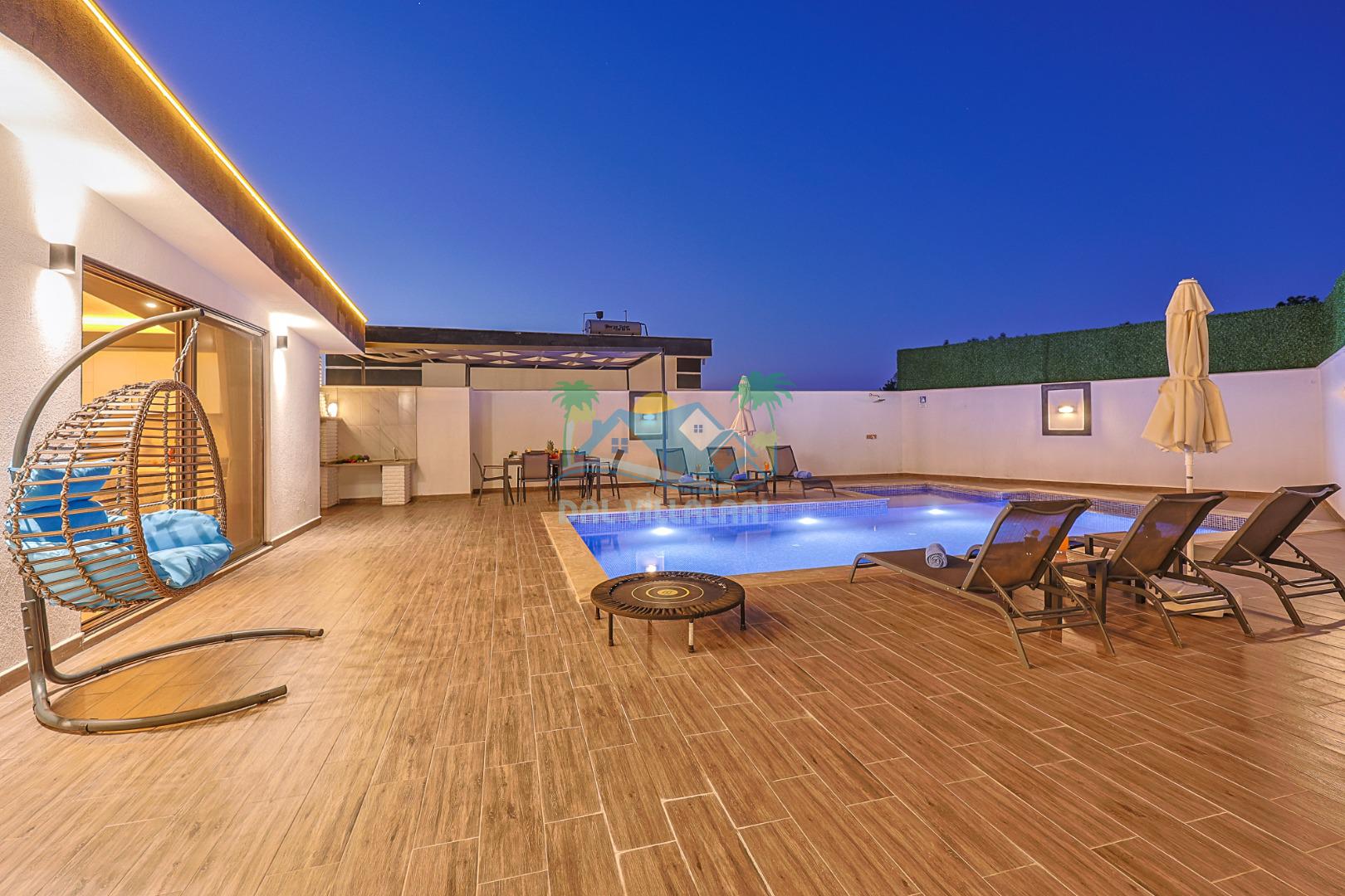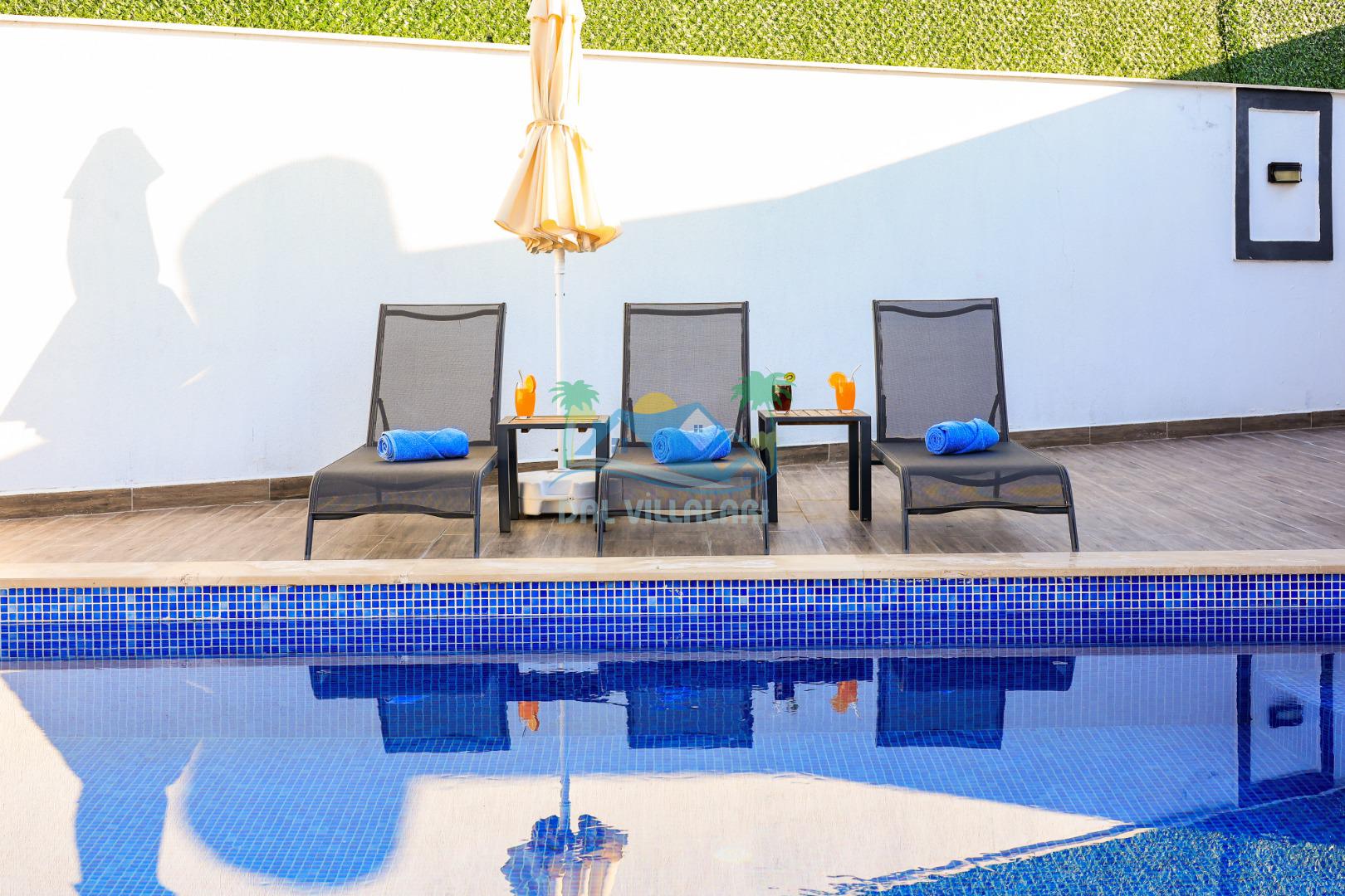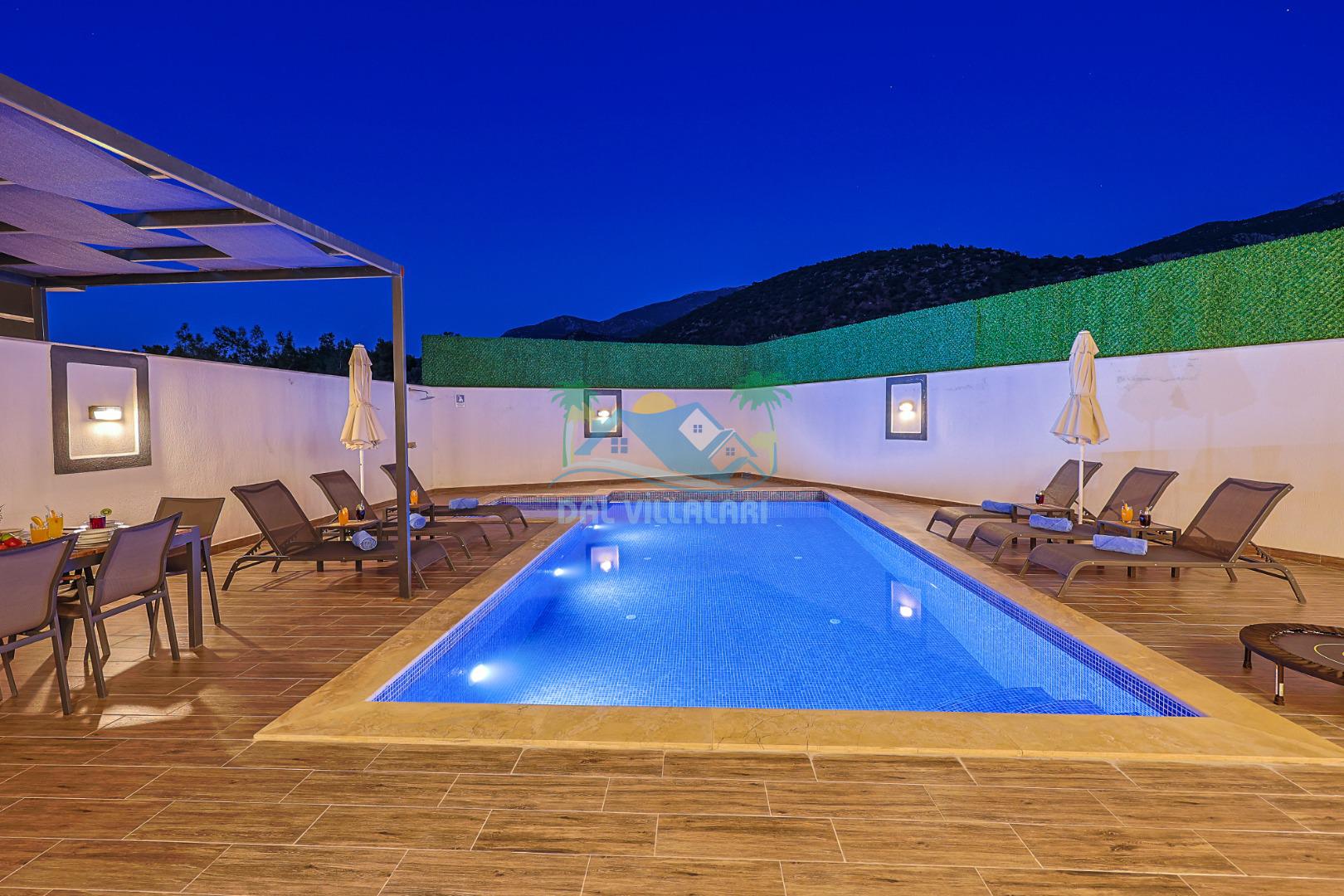 Mahremiyete önem veren misafirlerimiz için villanın özel yüzme havuzu korunaklı yapıdadır ve havuz terası dışarıdan görünmez şekilde tasarlanmıştır. Manzaralı alanda konumlanan 2 kişilik jakuzi, tatilinizi daha konforlu ve keyifli hale getirir.