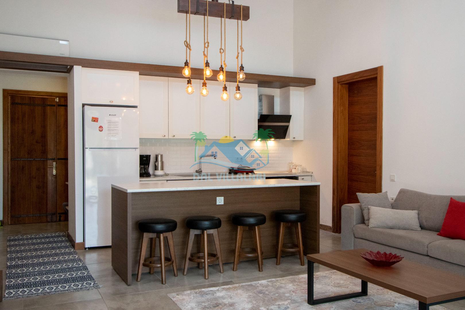 Ferahlık hissi veren yüksek tavanlı salonu ve modern detaylarla hazırlanmış yaşam alanı, tatilde “ev rahatlığı” arayanlar için idealdir. Mutfak ve oturma alanı günlük kullanım için pratik bir düzen sunarken; odalar ise dinlenmeye odaklı, sade ve konforlu şekilde tasarlanmıştır. İki banyolu planı sayesinde kalabalık hissettirmeden rahat bir kullanım sağlar.