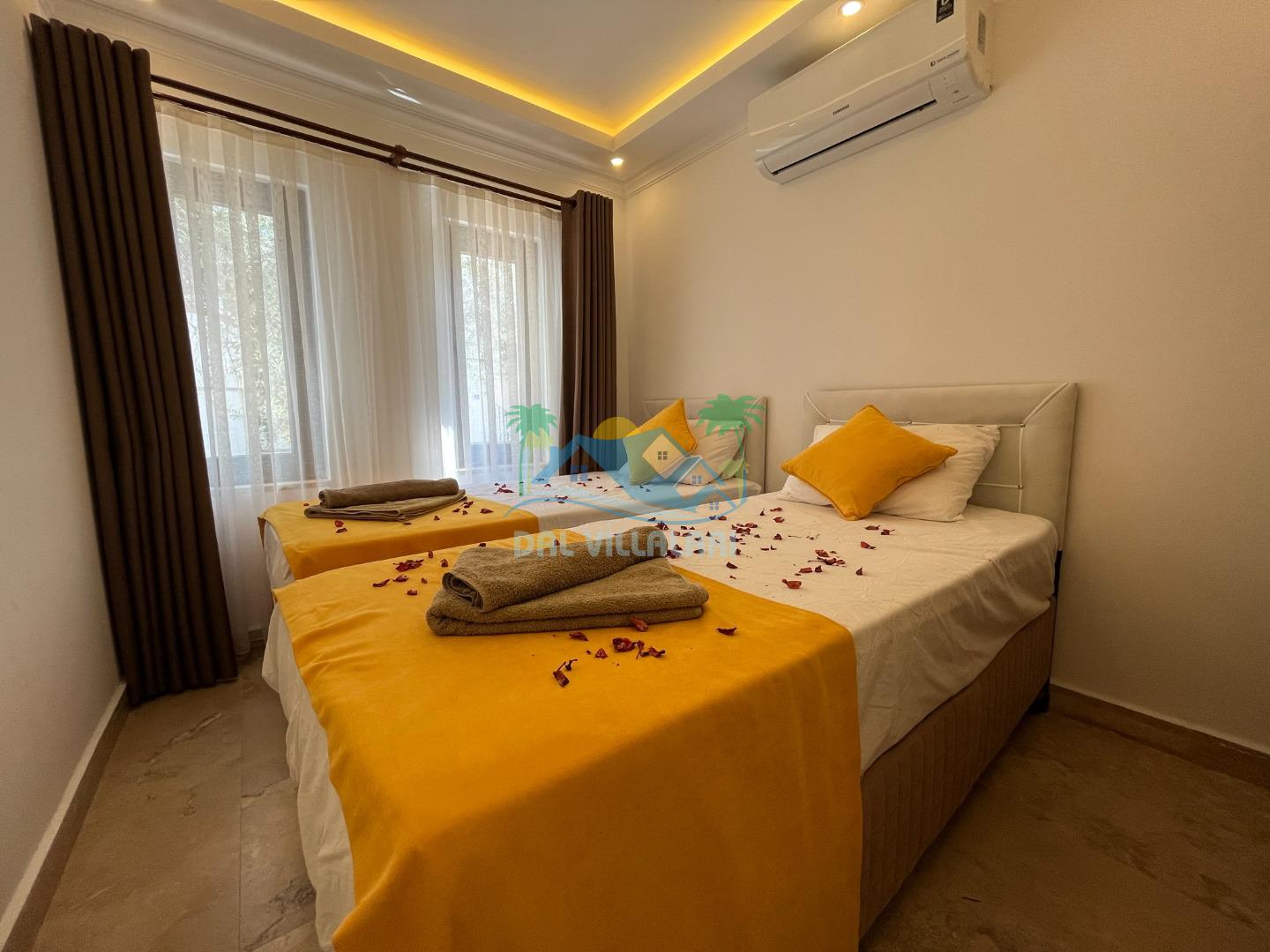 Dört geniş yatak odası, konfor ve rahatlık düşünülerek özenle tasarlanmıştır. Her odada bulunan geniş yataklar, yüksek kaliteli nevresimler ve şık dekorasyon, huzurlu bir uyku çekmenizi sağlar. Ana yatak odası, özel banyosu ve geniş balkonu ile ekstra lüks bir deneyim sunar. Diğer yatak odaları da aynı özenle dekore edilmiş olup, misafirlerinizin de rahat ve keyifli bir konaklama geçirmesini garanti eder.