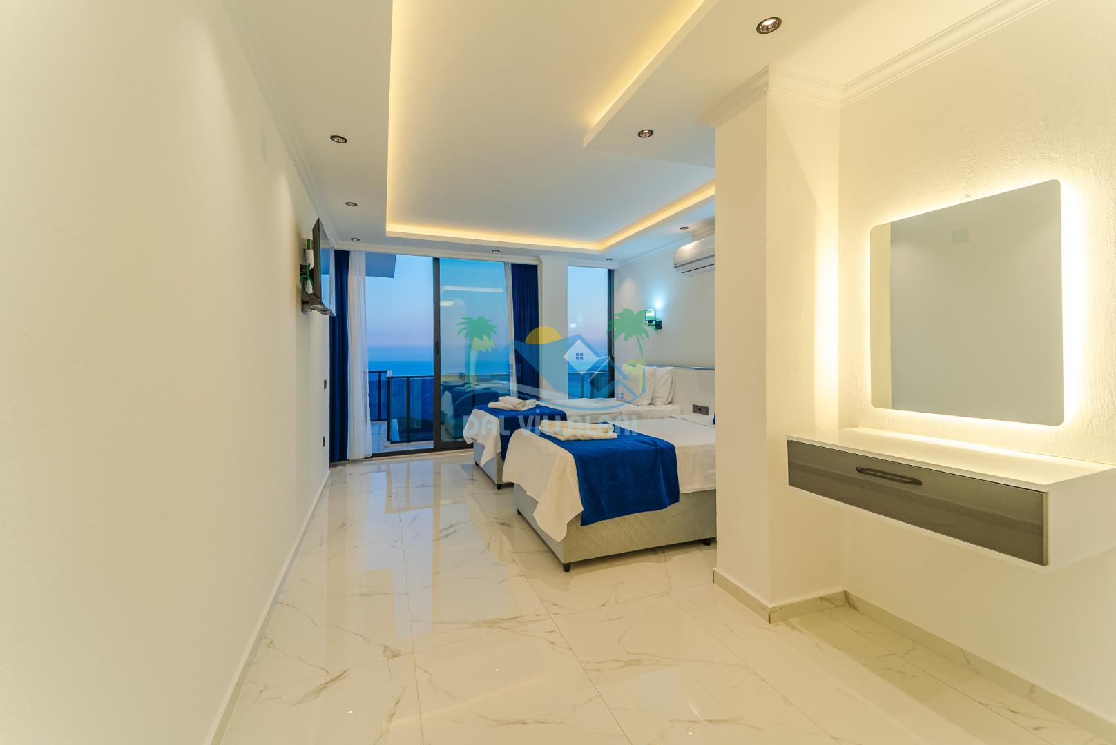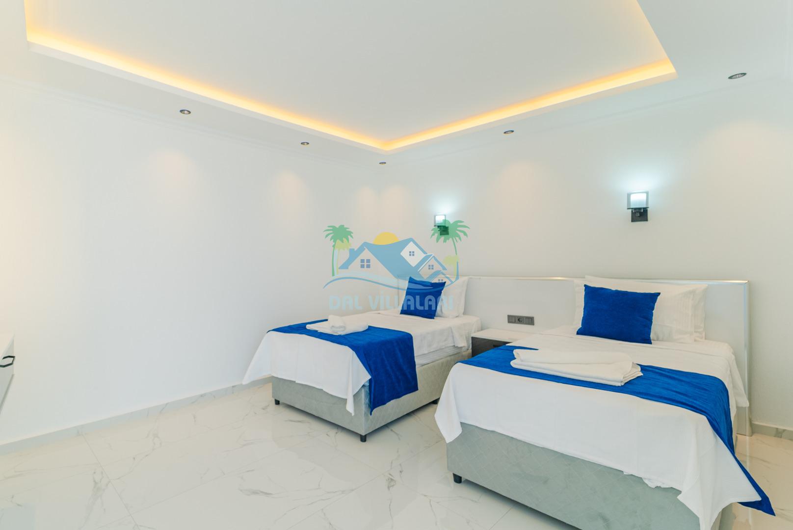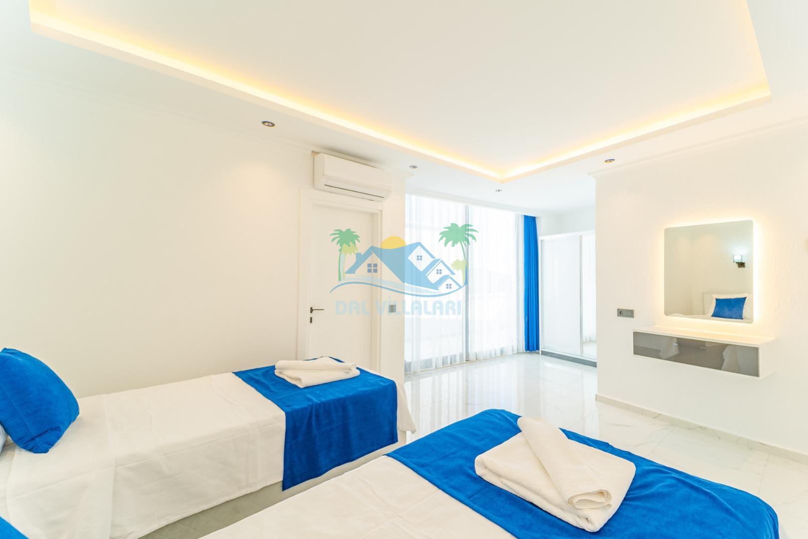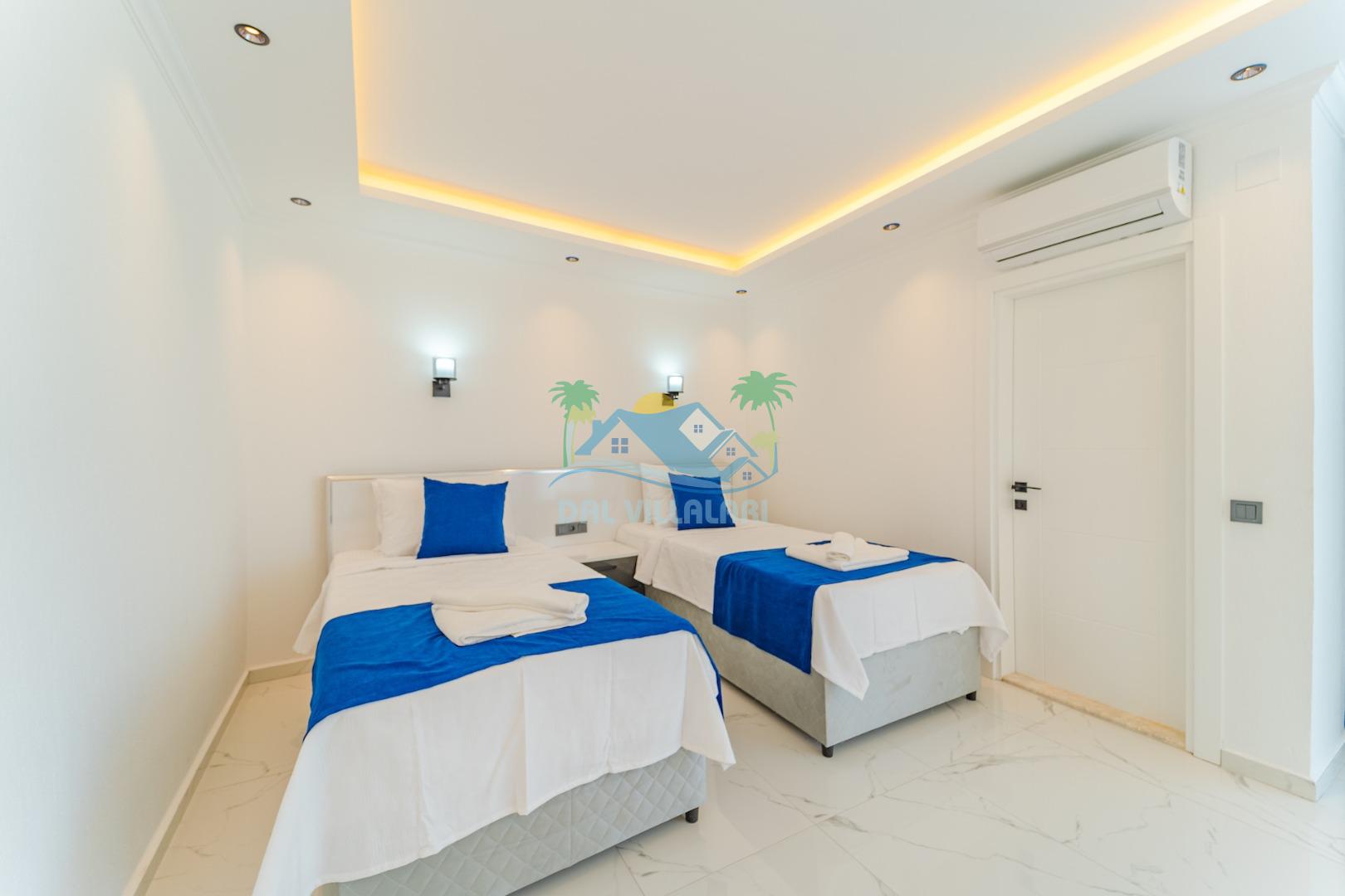 -Villa Yeliz 5 yatak odasına sahip olup 10 kişi kapasitelidir.Villamızın üç odasında çift kişilik,iki odasında iki tek kişilik yatak bulunmaktadır.Villamızın odalarında kendine ait tuvalet ve banyosu yer almaktadır.